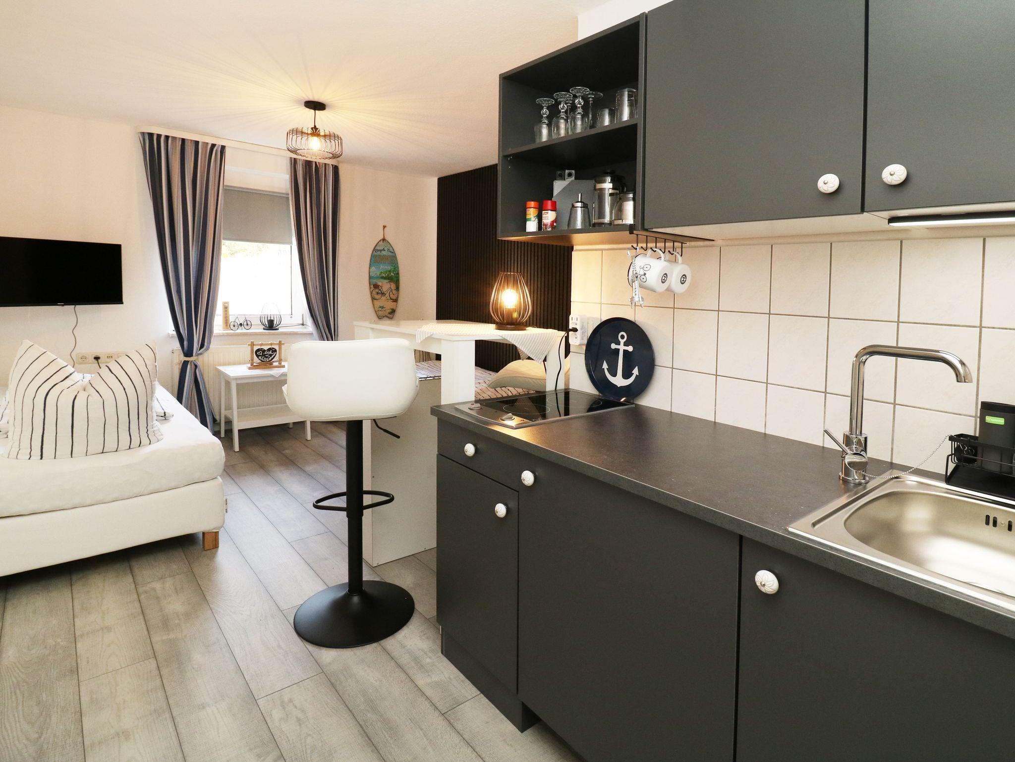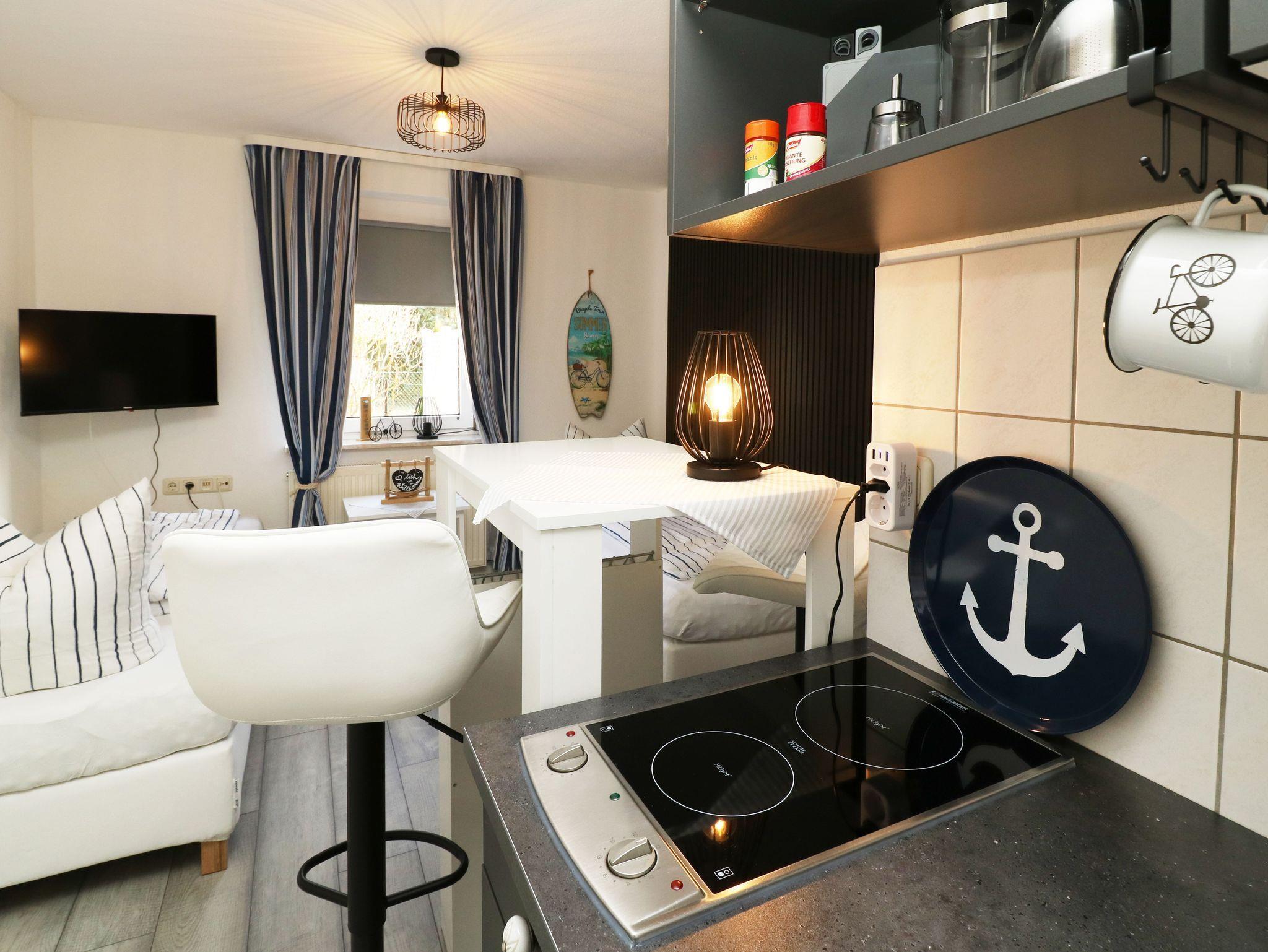 Die Küchenzeile ist im Wohnraum integriert und bietet grundlegende Annehmlichkeiten wie ein Cerankochfeld, einem Kühlschrank mit Gefriermöglichkeit und einer kompletten Küchenausstattung. Dazu gehören auch Kaffeemaschine, Wasserkocher und Toaster.