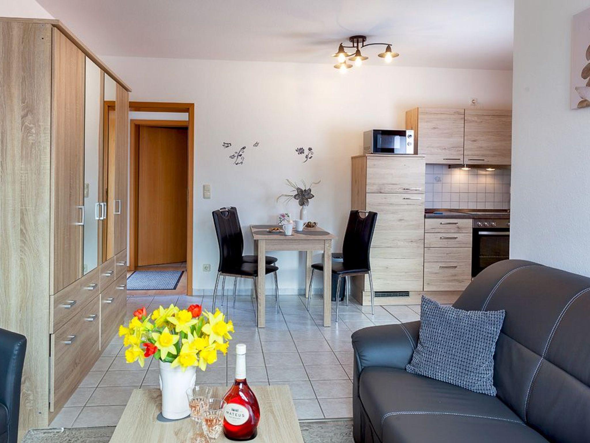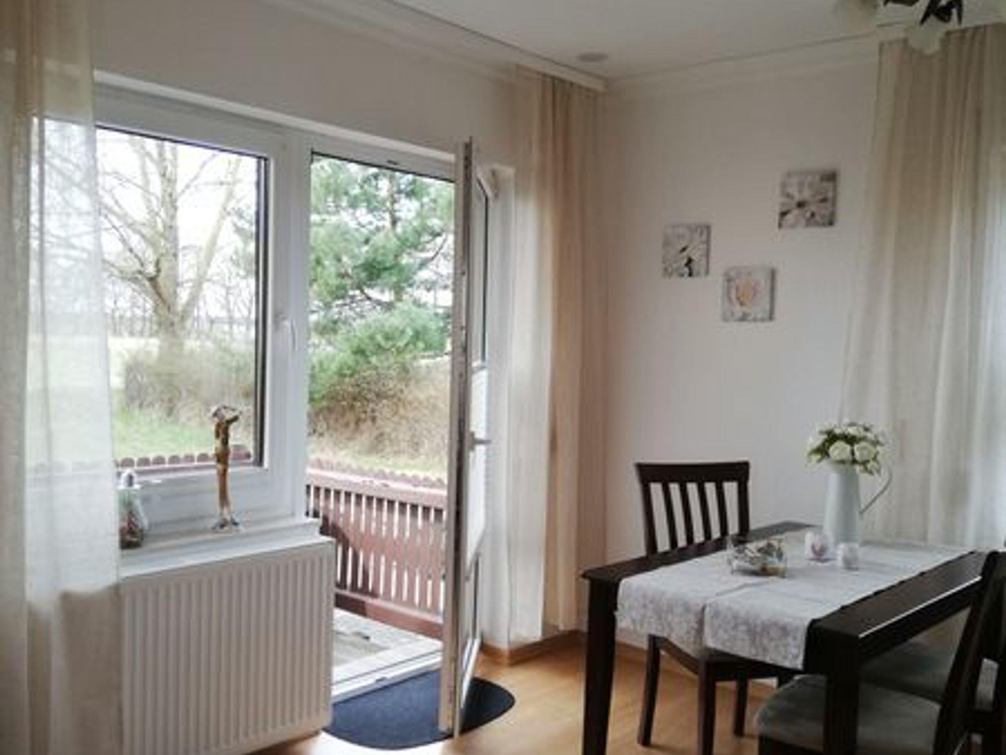2 - Raum-Ferienwohnung (ca. 45 qm) im Erdgeschoß. Eine Terrasse mit Blick ins Grüne und ein Kamingrill sind am Haus vorhanden. Die Wohnung verfügt über ein Wohnzimmer mit Sofa, Couchtisch, Flachbildschirm und Kleiderschrank, Eßecke sowie eine Küche mit Cerankochfeld, Backofen, Geschirrspüler, Mikrowelle, Kühlschrank mit Gefrierfach, Kaffeemaschine, Wasserkocher etc.). Der Schlafraum verfügt über ein Doppelbett- und ein Einzelbett. Die Wohnung hat, bis auf das Schlafzimmer, überall Fußbodenheizung. Bad mit DU/WC, Fenster, Handtuchtrockner und Haartrockner. Handtücher und Bettwäsche sind bitte mitzubringen. Der Parkplatz kostet die Nacht 1,00 und befindet sich auf dem Grundstück !