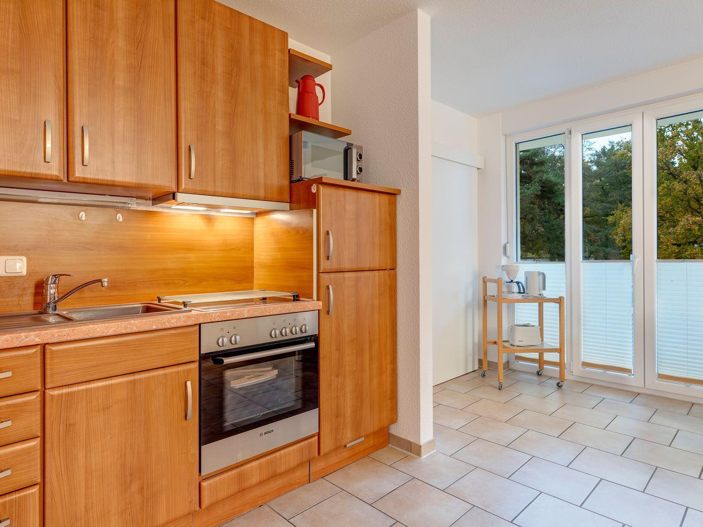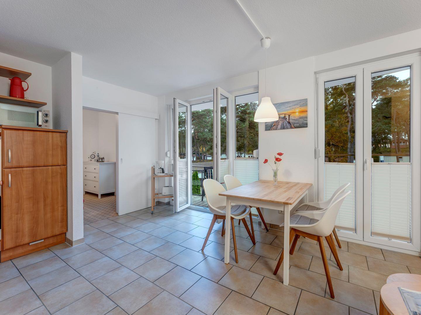 Der Wohnbereich mit Einbauküche mit Esstisch für 4 Personen, lädt mit seiner hellen Atmosphäre und dem Zugang zum sonnigen Balkon zum Verweilen ein.