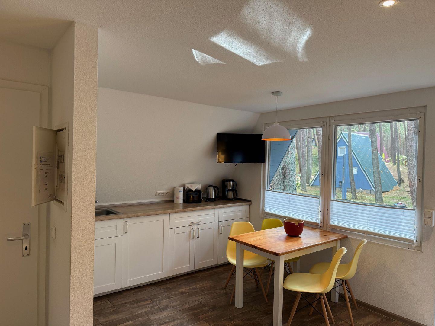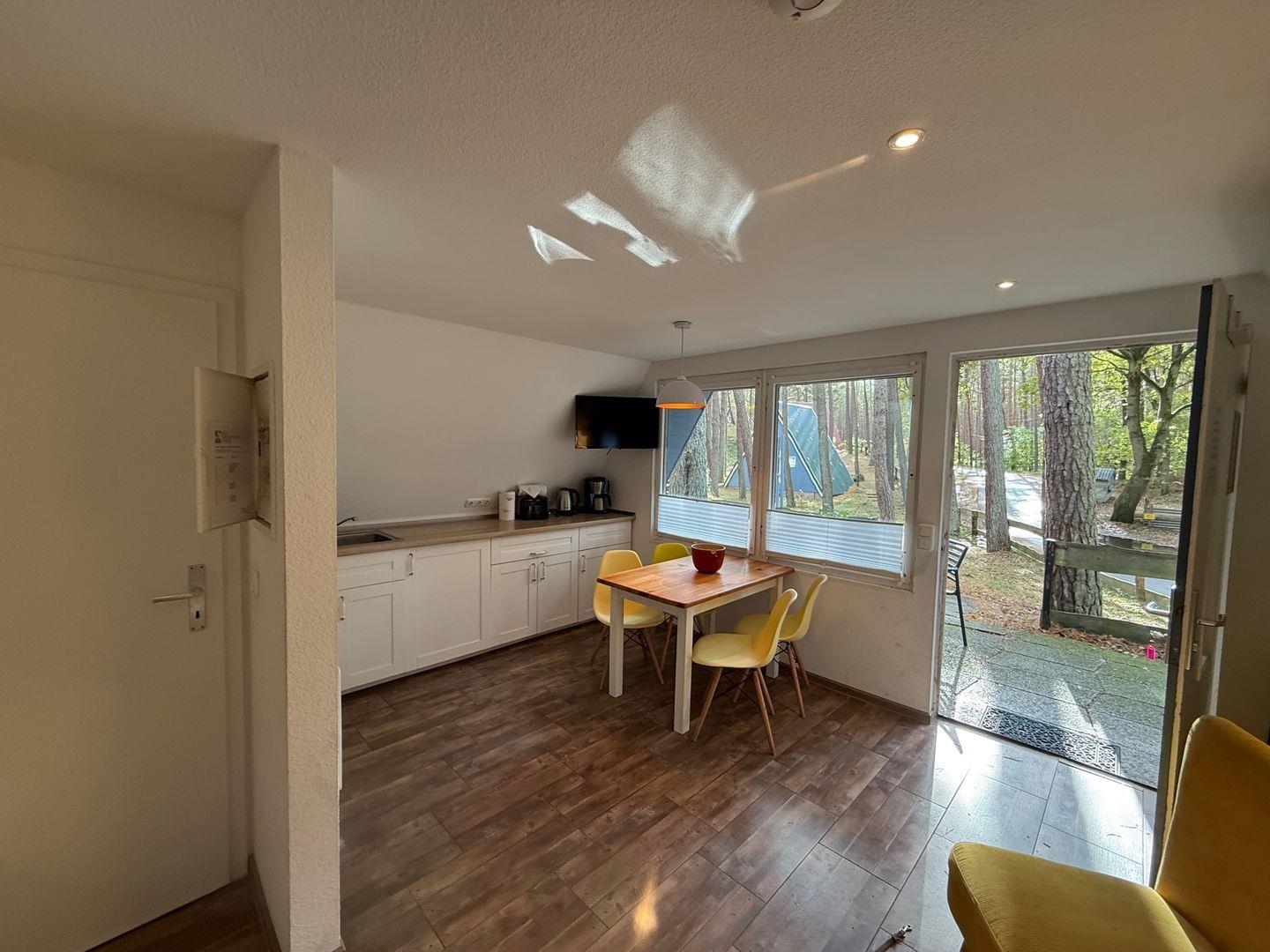 Drinnen warten ca. 30 m², die mehr können, als man denkt. Im Wohnzimmer treffen Sofa, Tisch und Stühle auf eine große Terrassentür, die den Wald direkt ins Haus holt. Die Schlafgalerie unterm Dach ist kuschelig und luftig zugleich – vier Betten für Erwachsene oder Kinder. IAlles schlicht, praktisch, ein bisschen skandinavisch – und mit Heizung für kühle Abende.