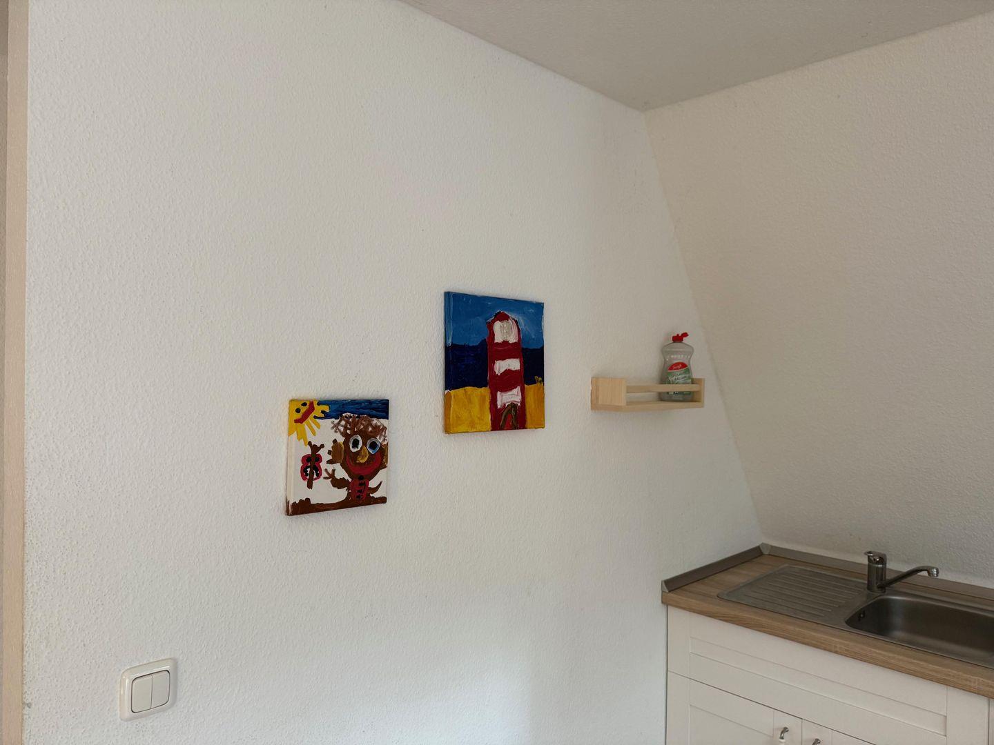 Die kleine Küchenzeile hat alles, was es für große Urlaubsgerichte braucht: Herd mit zwei Platten, Kühlschrank mit Gefrierfach, Kaffeemaschine, Toaster, Wasserkocher – dazu Geschirr und Besteck für vier Personen. Sollte einmal etwas fehlen: einfach melden, wir sorgen dafür. Daneben das eigene Duschbad mit WC – klein, aber fein und ganz für Sie allein.