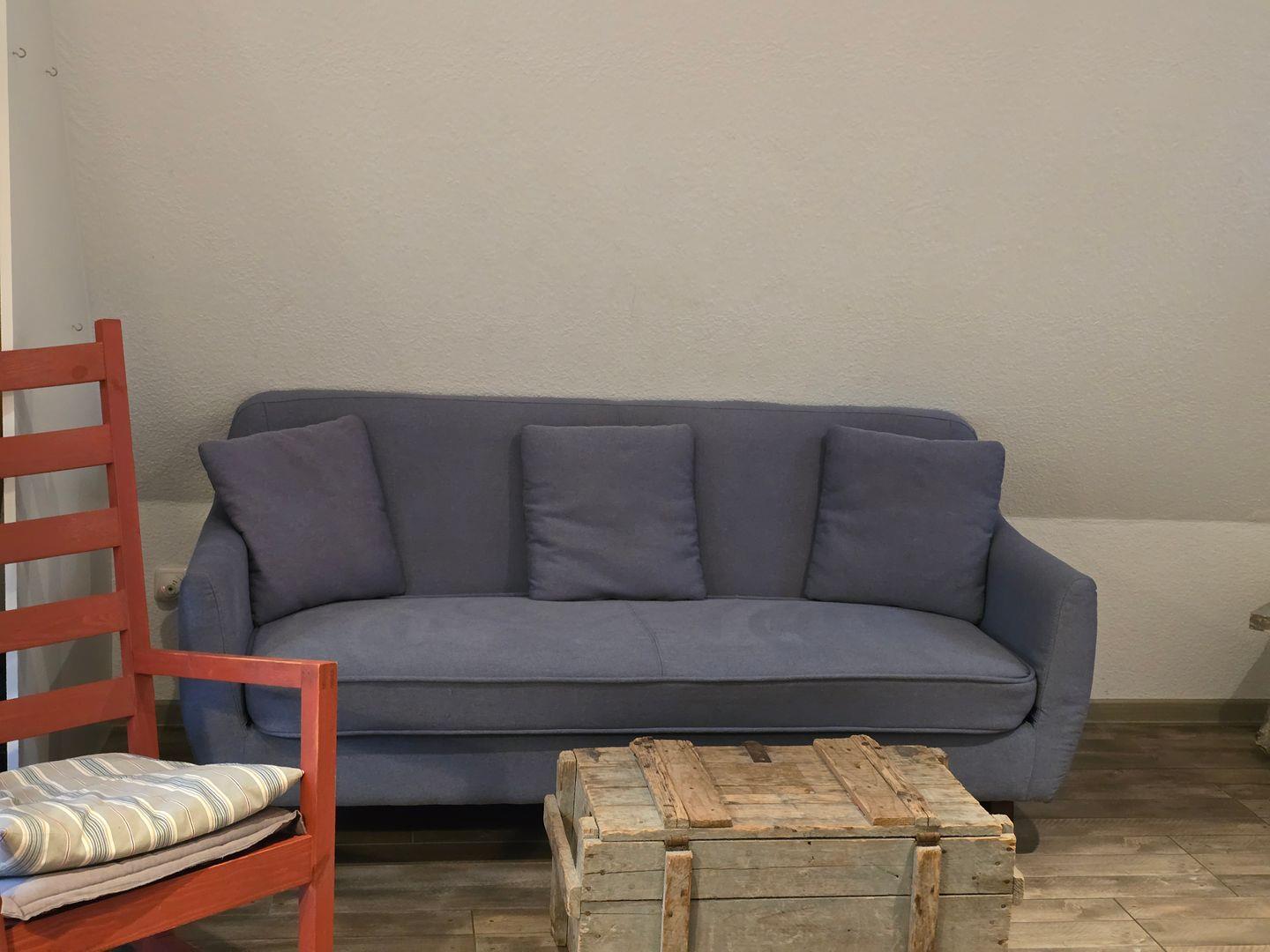 Drinnen warten ca. 30 m², die mehr können, als man denkt. Im Wohnzimmer treffen Sofa, Tisch und Stühle auf eine große Terrassentür, die den Wald direkt ins Haus holt. Die Schlafgalerie unterm Dach ist kuschelig und luftig zugleich – vier Betten für Erwachsene oder Kinder. IAlles schlicht, praktisch, ein bisschen skandinavisch – und mit Heizung für kühle Abende.