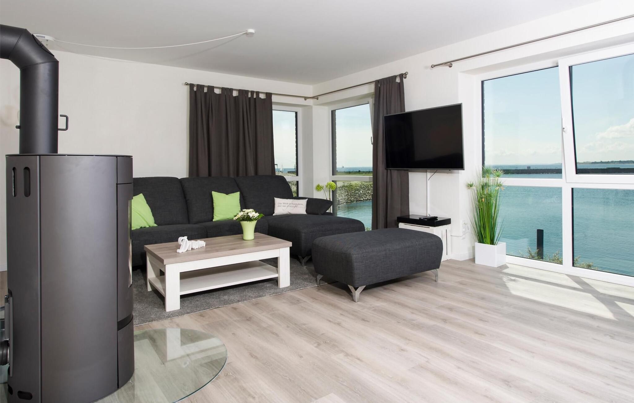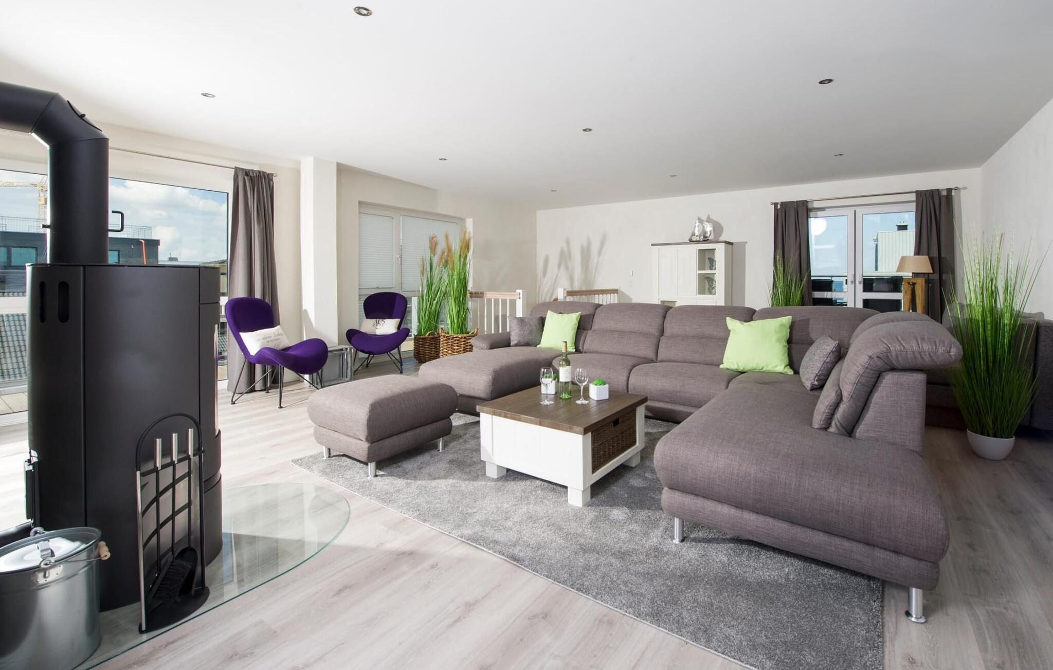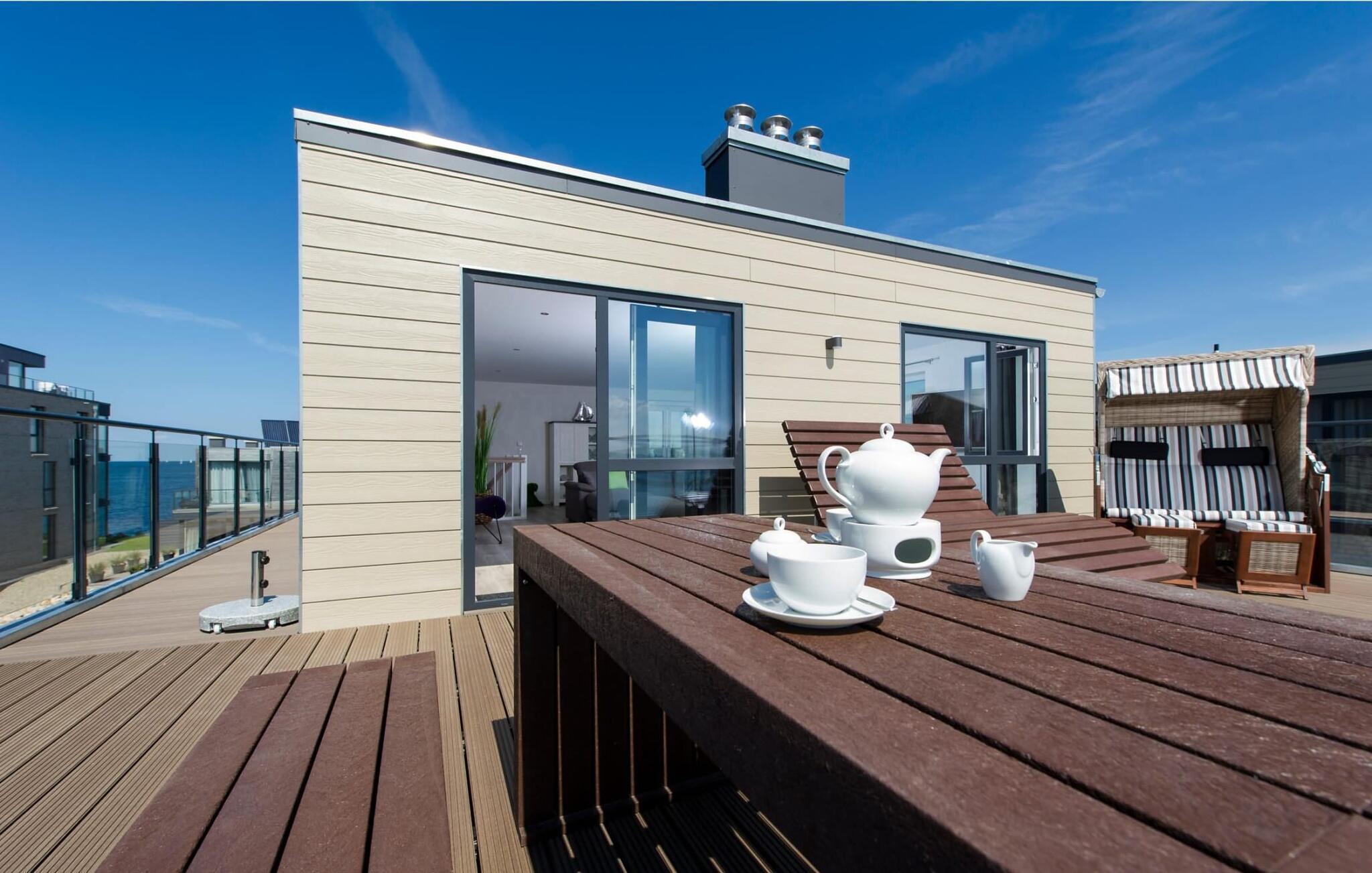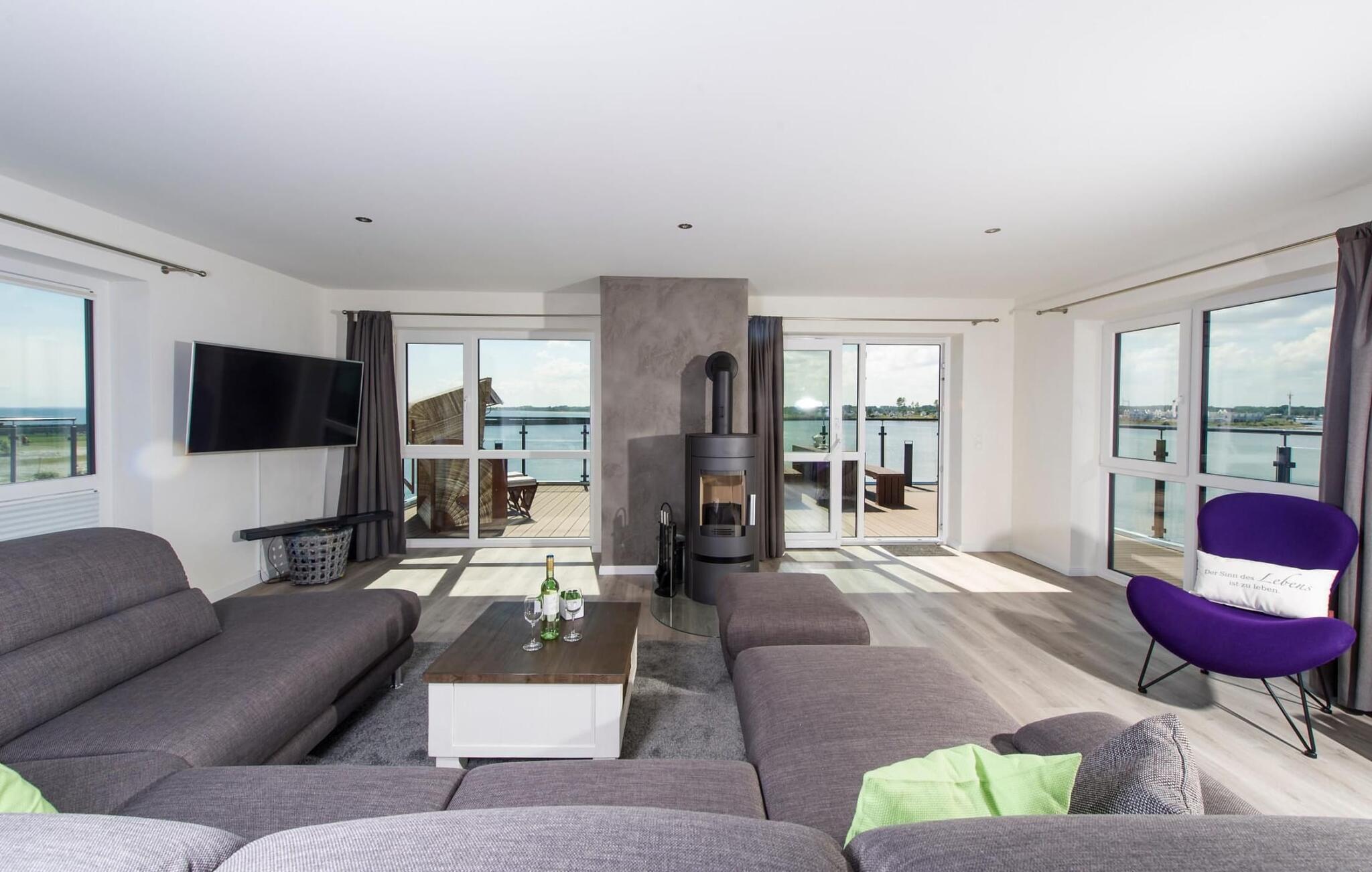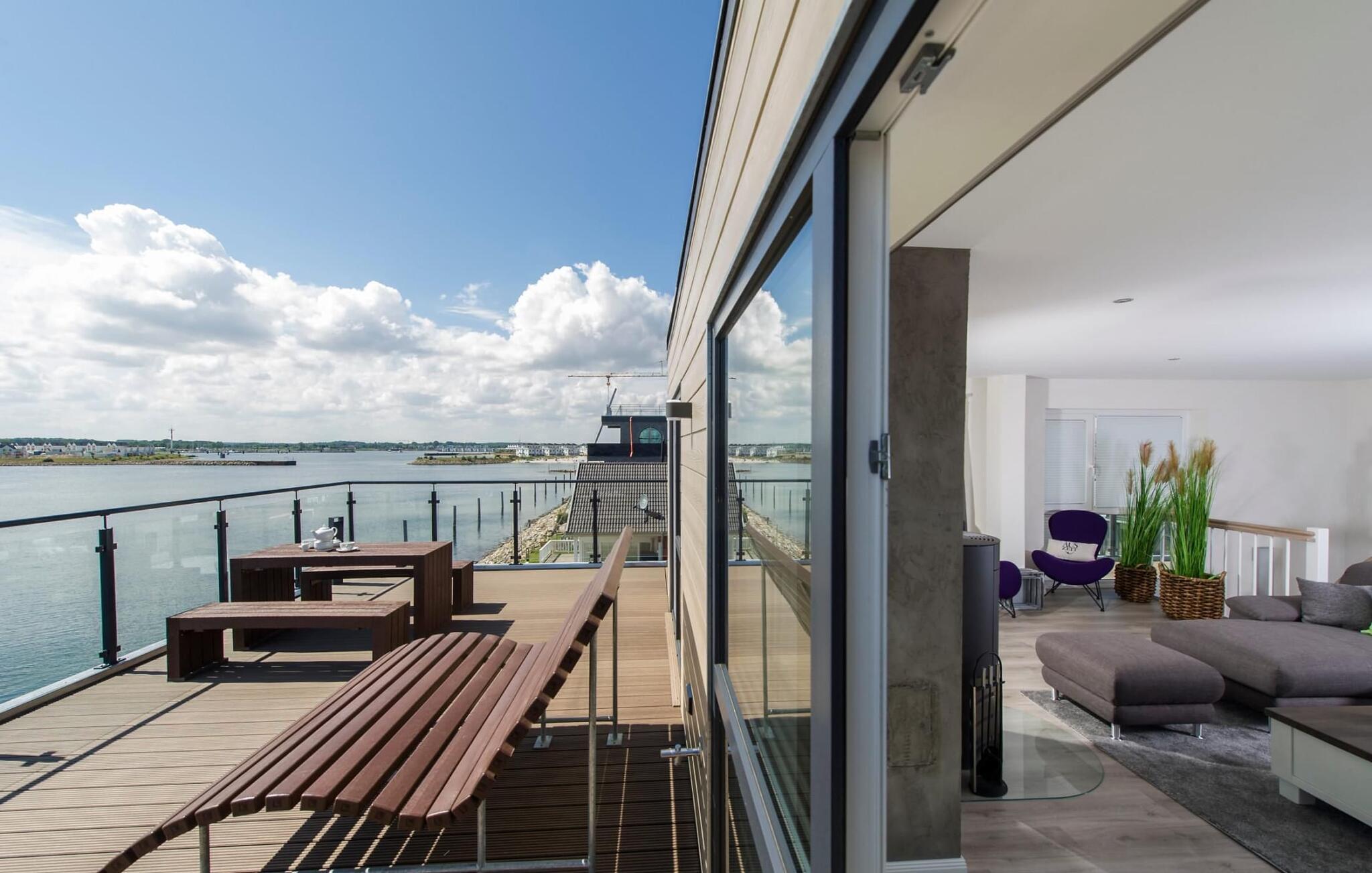 Drømmetid ved Østersøen. Denne moderne penthouse-ferielejlighed lever op til sit navn, da den udsatte beliggenhed, indretning af høj kvalitet og moderne indretning er lige så imponerende. Beliggende på den nordlige mole af Baltic Sea Resort Olpenitz, på et smalt næs midt i Østersøen, er denne særlige ferieejendom omgivet af vand. Ferielejligheden imponerer med en betagende udsigt over lystbådehavnen, slimmundingen og Østersøen, mens den forskudte etage med en stor solterrasse giver mulighed for at dvæle over havnebiografen og bølgerne. Udstyret med sauna, to pejse og badekar byder denne ferielejlighed på drømmetider i hver sæson. Indretningen af denne ferielejlighed er naturlig og klar og er bevidst enkel med naturlige materialer, klare former og dæmpede farver. Den rummelige og lyse stue/alrum er ferielejlighedens centrum og imponerer med gulv til loft-vinduer, et komfortabelt opholdsområde og et stort spisebord, alt sammen foran en unik vandkulisse. Det åbne køkken byder på alt, hvad en koks hjerte begærer af højkvalitets teknologi og udstyr. To soveværelser kan rumme op til fire voksne. Der er to ekstra sovepladser på den komfortable sovesofa på anden sal. Udover en bruser i gulvniveau byder hovedbadeværelset også på et personligt spa-program, da den store finske sauna sikrer wellness-øjeblikke. Et andet badeværelse byder på luksusen af et badekar. En trappe fører op til den forskudte etage, som giver ekstra opholdsrum. Gennem glasvinduet foran kan I nyde den betagende udsigt over den store terrasse på sejl- og sportsbådshavnen i ferieområdet, af Slien, dens udmunding i Østersøen og Schimmelünde fyrtårn. Penthouse-lejligheden inviterer jer til at blive hængende med et behageligt opholdsområde foran en knitrende pejs. Den store solterrasse, som omkranser tre sider, byder på alt, hvad jeres feriehjerte begærer, med heldagssol og en spektakulær udsigt over bølgerne, vidden og resortet. Der er to parkeringspladser til rådighed direkte foran huset. Vores favoritsted: Uanset om det er en varm sommeraften på terrassen eller en dyster novemberdag foran den knitrende pejs, er det forskudte gulv med en spektakulær udsigt vores højdepunkt i hver sæson. Traumzeit ferielejligheden ved Østersøen er en lejlighed på første og anden sal. Bemærk venligst: OstseeResort Olpenitz er meget populært, og der bygges fortsat i parken. Ikke desto mindre kan I se frem til en 5-stjernet standard og et førsteklasses ophold. Byggeaktiviteterne kommer ikke til at forstyrre jer på ferien, og derfor gives der ikke yderligere afslag i prisen.