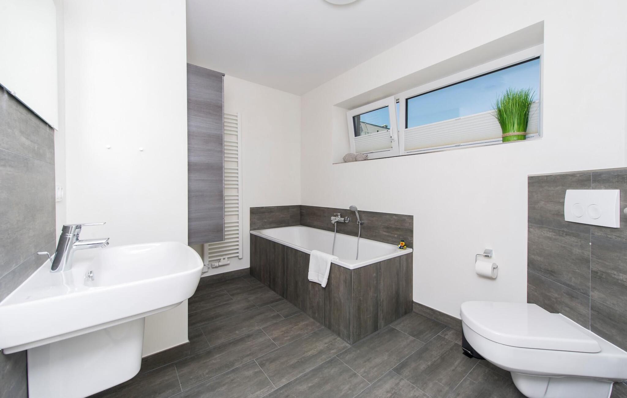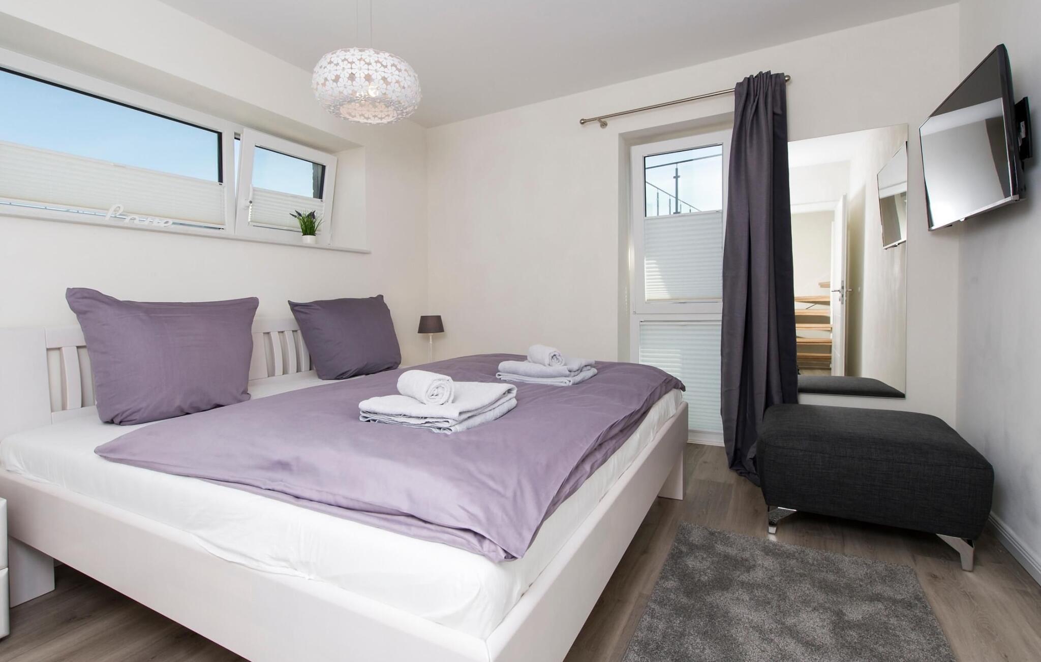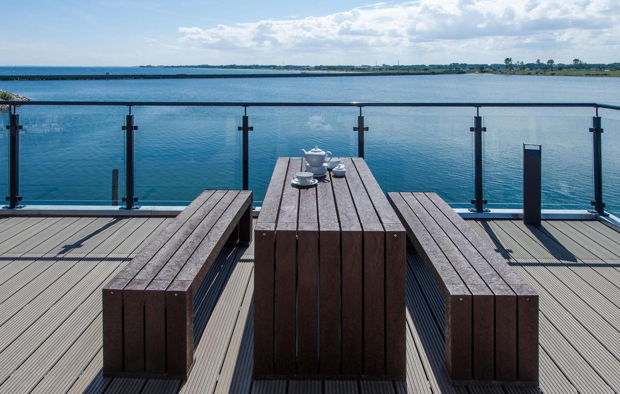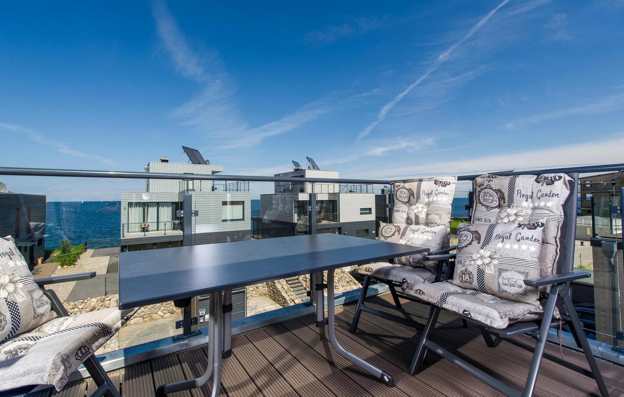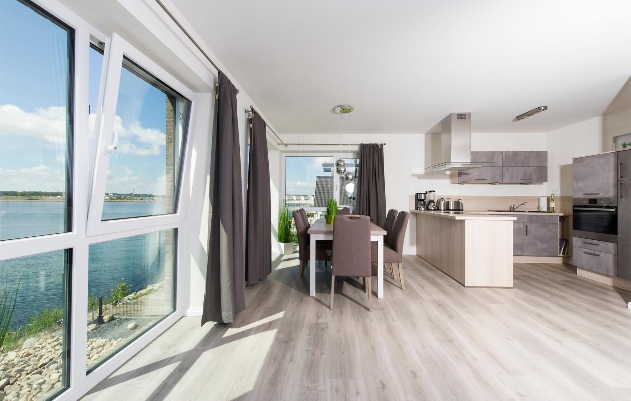 Drømmetid ved Østersøen. Denne moderne penthouse-ferielejlighed lever op til sit navn, da den udsatte beliggenhed, indretning af høj kvalitet og moderne indretning er lige så imponerende. Beliggende på den nordlige mole af Baltic Sea Resort Olpenitz, på et smalt næs midt i Østersøen, er denne særlige ferieejendom omgivet af vand. Ferielejligheden imponerer med en betagende udsigt over lystbådehavnen, slimmundingen og Østersøen, mens den forskudte etage med en stor solterrasse giver mulighed for at dvæle over havnebiografen og bølgerne. Udstyret med sauna, to pejse og badekar byder denne ferielejlighed på drømmetider i hver sæson. Indretningen af denne ferielejlighed er naturlig og klar og er bevidst enkel med naturlige materialer, klare former og dæmpede farver. Den rummelige og lyse stue/alrum er ferielejlighedens centrum og imponerer med gulv til loft-vinduer, et komfortabelt opholdsområde og et stort spisebord, alt sammen foran en unik vandkulisse. Det åbne køkken byder på alt, hvad en koks hjerte begærer af højkvalitets teknologi og udstyr. To soveværelser kan rumme op til fire voksne. Der er to ekstra sovepladser på den komfortable sovesofa på anden sal. Udover en bruser i gulvniveau byder hovedbadeværelset også på et personligt spa-program, da den store finske sauna sikrer wellness-øjeblikke. Et andet badeværelse byder på luksusen af et badekar. En trappe fører op til den forskudte etage, som giver ekstra opholdsrum. Gennem glasvinduet foran kan I nyde den betagende udsigt over den store terrasse på sejl- og sportsbådshavnen i ferieområdet, af Slien, dens udmunding i Østersøen og Schimmelünde fyrtårn. Penthouse-lejligheden inviterer jer til at blive hængende med et behageligt opholdsområde foran en knitrende pejs. Den store solterrasse, som omkranser tre sider, byder på alt, hvad jeres feriehjerte begærer, med heldagssol og en spektakulær udsigt over bølgerne, vidden og resortet. Der er to parkeringspladser til rådighed direkte foran huset. Vores favoritsted: Uanset om det er en varm sommeraften på terrassen eller en dyster novemberdag foran den knitrende pejs, er det forskudte gulv med en spektakulær udsigt vores højdepunkt i hver sæson. Traumzeit ferielejligheden ved Østersøen er en lejlighed på første og anden sal. Bemærk venligst: OstseeResort Olpenitz er meget populært, og der bygges fortsat i parken. Ikke desto mindre kan I se frem til en 5-stjernet standard og et førsteklasses ophold. Byggeaktiviteterne kommer ikke til at forstyrre jer på ferien, og derfor gives der ikke yderligere afslag i prisen.
