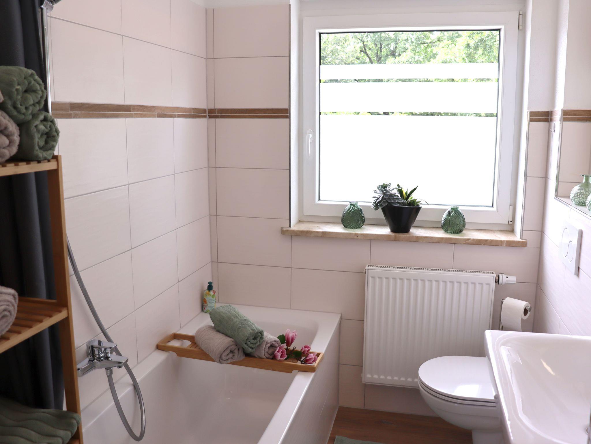 Das Badezimmer ist mit Duschwanne, Toilette und Waschbecken ausgestattet.