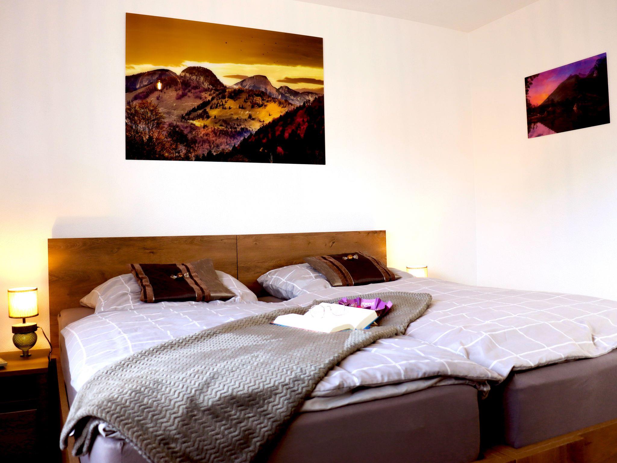 Das komfortable Schlafzimmer verfügt über ein Doppelbett, welches auch in 2 Einzelbetten trennbar ist. Ein geräumiger Kleiderschrank mit Spiegeltür, sowie eine Kommode sind vorhanden.