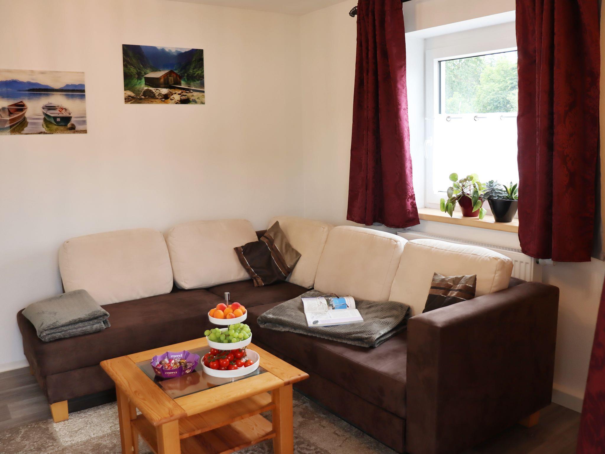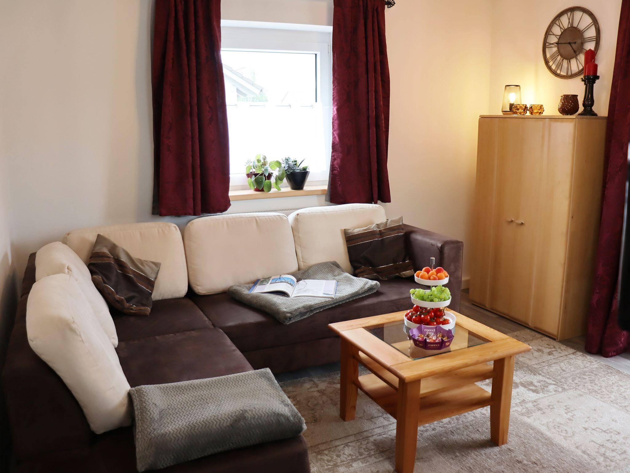 Ein gemütliches Wohnzimmer mit Schlafcouch und Fernseher lädt zu schönen Abendstunden ein.