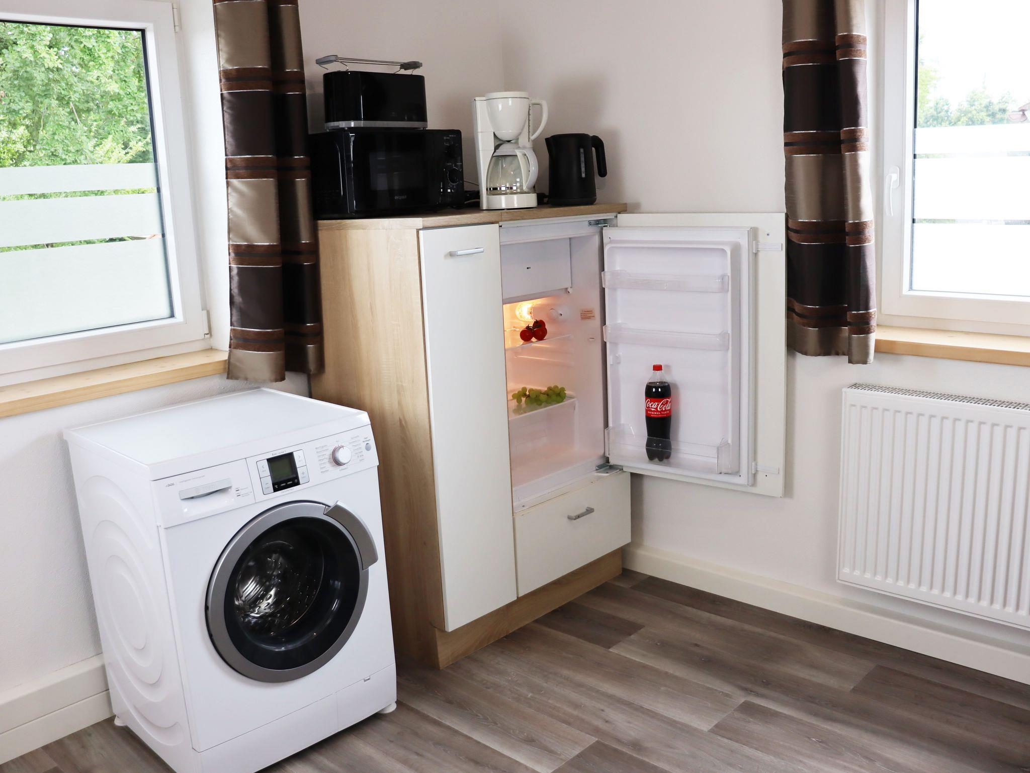 Herd, Backofen, Mikrowelle, Toaster, Wasserkocher, Kaffee- und Geschirrspülmaschine sowie Geschirr, Töpfe, Kuchen- und Auflaufformen sind vorhanden.