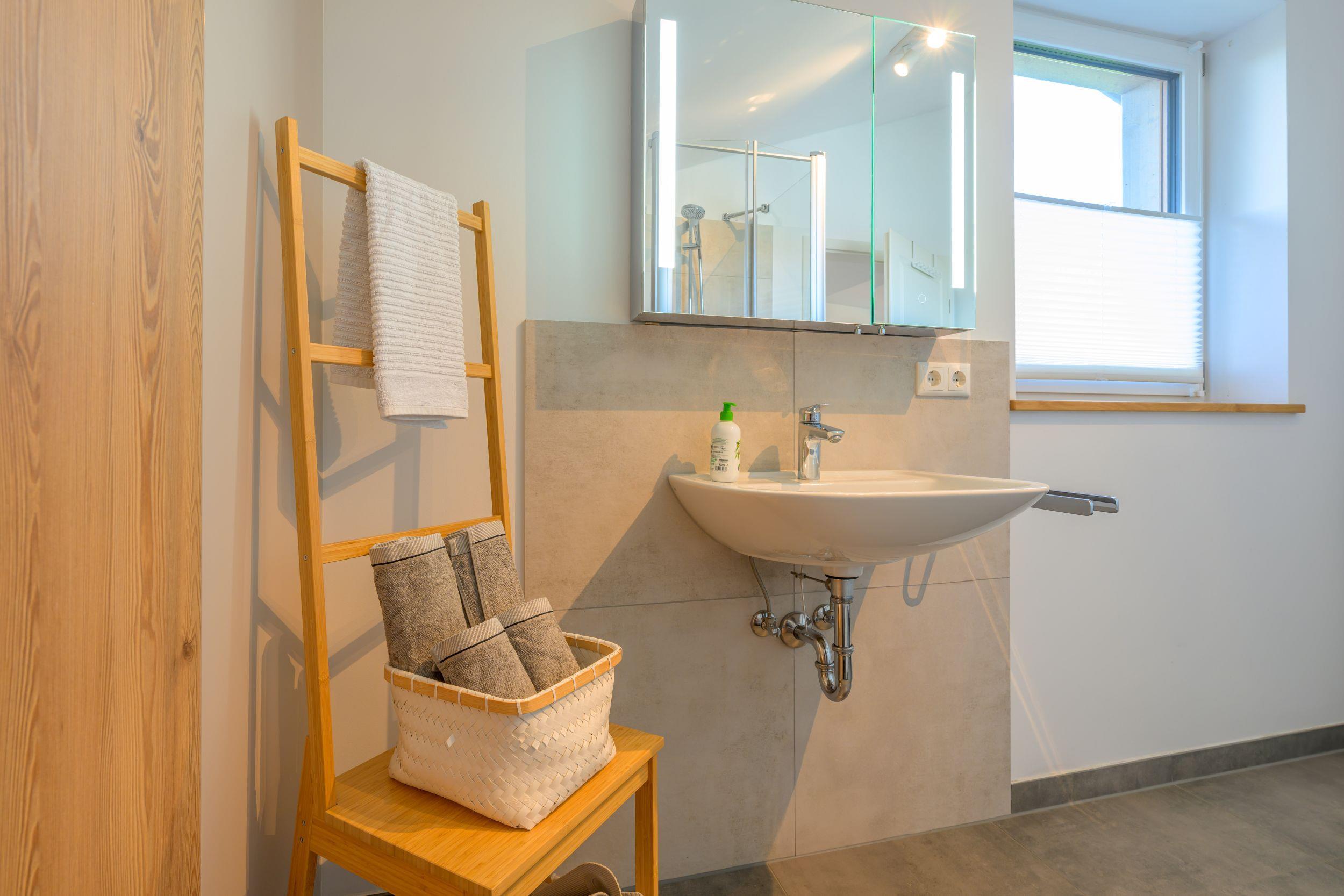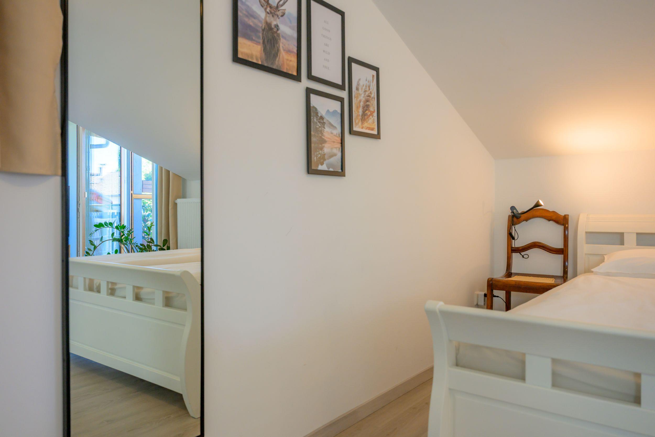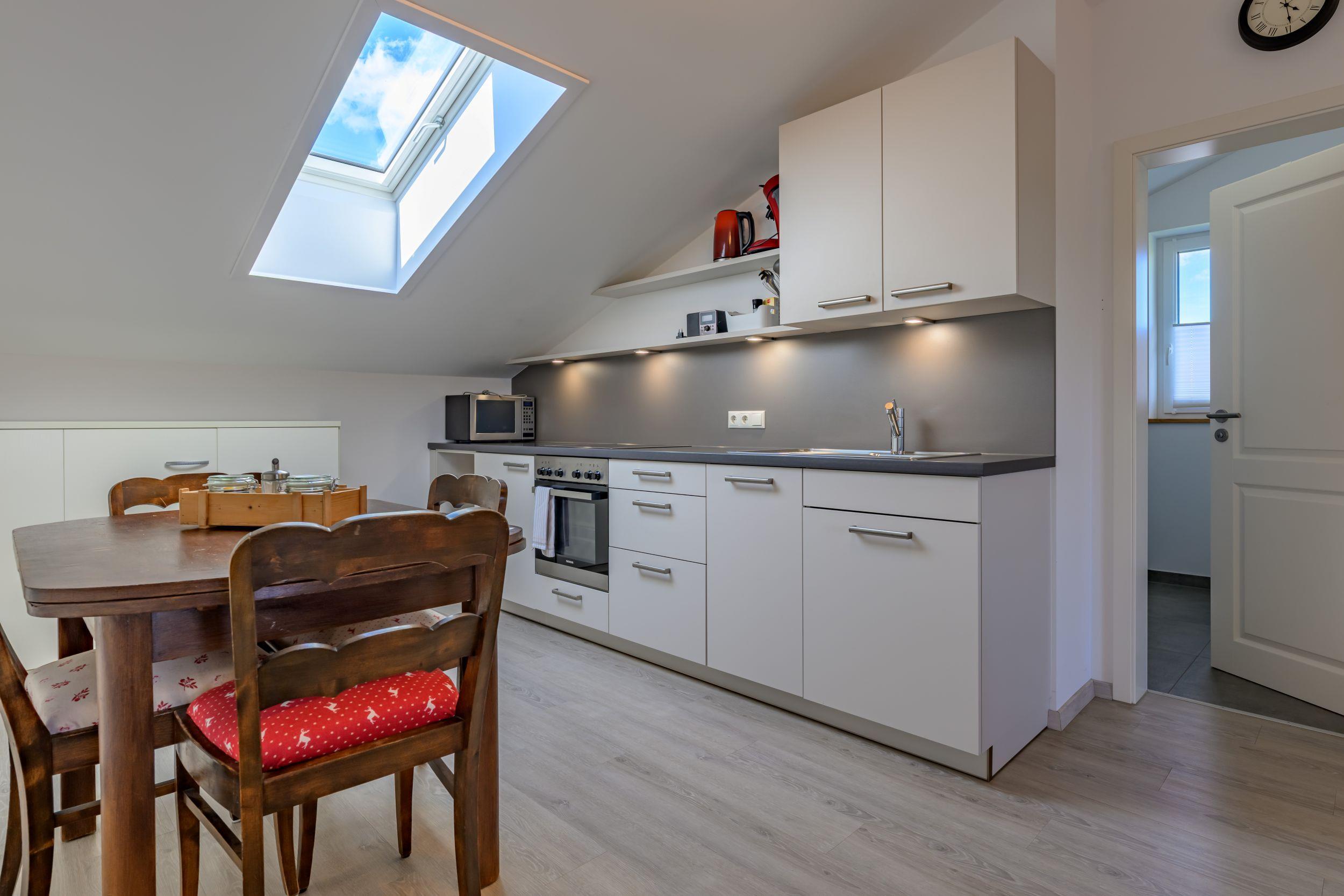 Our apartment "Martin" impresses with its open and bright layout. Ideal for two people, but equipped with an additional sleeping possibility for an adult or two children, it also offers space for a small family. Already the first rays of sunshine in the day allow a view of the Alps. The lovingly furnished apartment captivates not only by its partly lovingly restored furniture, rather it offers numerous amenities of a modern vacation apartment in this day and age. In the equipment we have consciously paid attention to a modern and environmentally conscious furnishings and so the approximately 50m ² presents itself with a fully equipped and spacious kitchen, which in addition to an electric stove including oven, a refrigerator and freezer combination, a dishwasher as well as coffee maker, kettle, microwave and toaster. The comfortable seating area can accommodate up to four people. With great attention to detail, the combined bedroom and living room was designed. We have provided the double bed with high-quality mattresses and slatted frames. For families, there is also a wide sofa bed for one to two people. We have provided the apartment with a powerful WLAN. The modern, large, swiveling and Internet-enabled flat-screen TV ensures the right picture and sound quality for cozy TV evenings. In addition, a digital radio with numerous linking options for data carriers is available to our guests. The bathroom in this apartment is characterized by modern elegance and is equipped with shower, towel dryer, toilet, hair dryer and sink. A washing machine is available in the basement of our house. The covered south-facing balcony with a small seating area is an ideal place to unwind. During the construction last year have consciously paid attention to the selection of natural building materials. The brand-new and in wood post and beam construction built roof is insulated well above current standards and offers optional protection in hot temperatures, especially in the summer. During the construction we have not only taken into account the current concerns of fire protection, but we have also attached great importance to good sound insulation, so that you can spend your vacations undisturbed. Environmental protection and a careful use of our natural resources are a matter close to our hearts. That is why we not only use renewable raw materials for heating, but have also consciously decided to use solar energy. The large natural garden invites you to relax and offers a barbecue and a fireplace for cozy evenings. Children will enjoy themselves with a swing, among other things, and our guests can spend the evening hours on the covered north terrace and enjoy the sunset on the horizon. In addition to an extensive collection of games, we also offer our guests a small reading corner and a selection of activities in the region. A parking space directly at the house ensures short distances. Still this year we expect our outdoor sauna, which invites you to relax next to the garden shower.