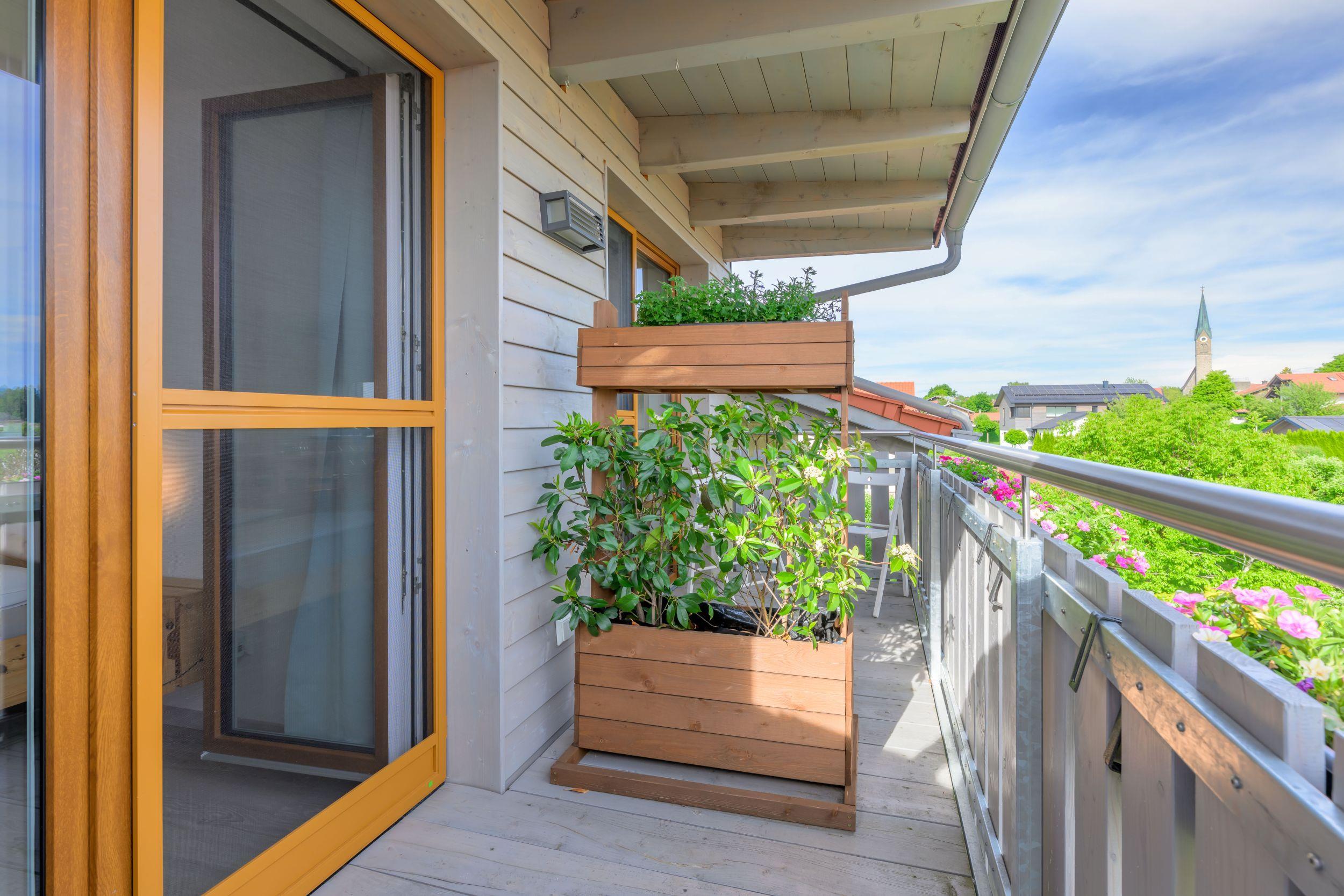 Those who love the nature of the foothills of the Alps and the mountains will be thrilled by our apartment "Sarah". When looking out of the window or from the balcony, not only the summit of the Kampenwand greets you, rather you can let your gaze wander to the Chiemgau and Berchtesgaden Alps and enjoy the magnificent landscape of the Chiemgau. "Get out of the daily grind, into relaxation", this is our credo and we offer high comfort with our vacation apartment "Sarah" for two people or the small family. The lovingly furnished apartment captivates not only by its natural furniture, rather it offers numerous amenities of a modern vacation apartment in this day and age. In the equipment we have consciously paid attention to a modern and environmentally conscious furnishing and so the approximately 50m ² presents itself with a fully equipped and spacious kitchen, which in addition to an electric stove including oven, a refrigerator and freezer combination, a dishwasher as well as coffee maker, kettle, microwave and toaster. The comfortable seating area can accommodate up to four people. With great attention to detail, the combined bedroom and living room was designed. We have provided the double bed with high-quality mattresses and slatted frames. For families, there is also a wide sofa bed for one to two people. We have provided the apartment with a powerful WLAN. The modern, large and swiveling flat screen TV provides the right picture and sound quality for cozy TV evenings. In addition, a digital radio with numerous linking options for data carriers is available to our guests. The bathroom in this apartment is characterized by modern elegance and is equipped with shower, towel dryer, toilet, hair dryer and sink. A washing machine is available in the basement of our house. If required, we are happy to offer you a baby crib or another extra bed. The covered south-facing balcony with a small seating area is an ideal place to relax. During construction last year have consciously paid attention to the selection of natural building materials. The brand-new and in wood post and beam construction built roof is insulated well above current standards and offers optional protection in hot temperatures, especially in the summer. During the construction we have not only taken into account the current concerns of fire protection, but we have also attached great importance to good sound insulation, so that you can spend your vacations undisturbed. Environmental protection and a careful use of our natural resources are a matter close to our hearts. That is why we not only use renewable raw materials for heating, but have also consciously decided to use solar energy. The large natural garden invites you to relax and offers a barbecue and a fireplace for cozy evenings. Children get their money's worth with a swing, among other things. On the covered north terrace our guests can spend the evening hours and enjoy the sunset on the horizon. In addition to an extensive collection of games, we also offer our guests a small reading corner and a selection of activities in the region. A parking space directly at the house ensures short distances. Still this year we expect our outdoor sauna, which invites you to relax next to the garden shower.