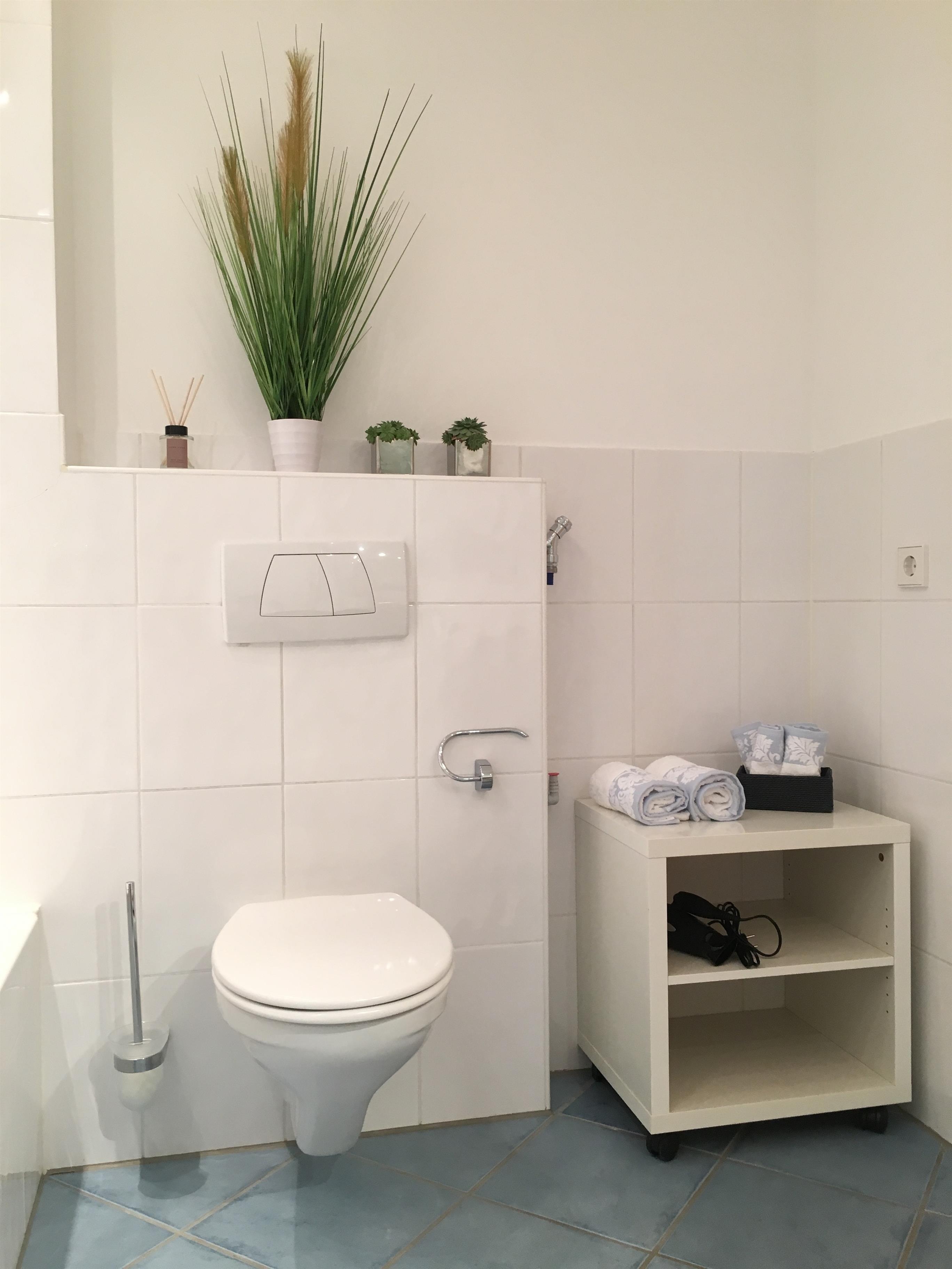 Das helle Bad hat eine separate Dusche und Badewanne und Waschmaschine, ein Föhn ist vorhanden.