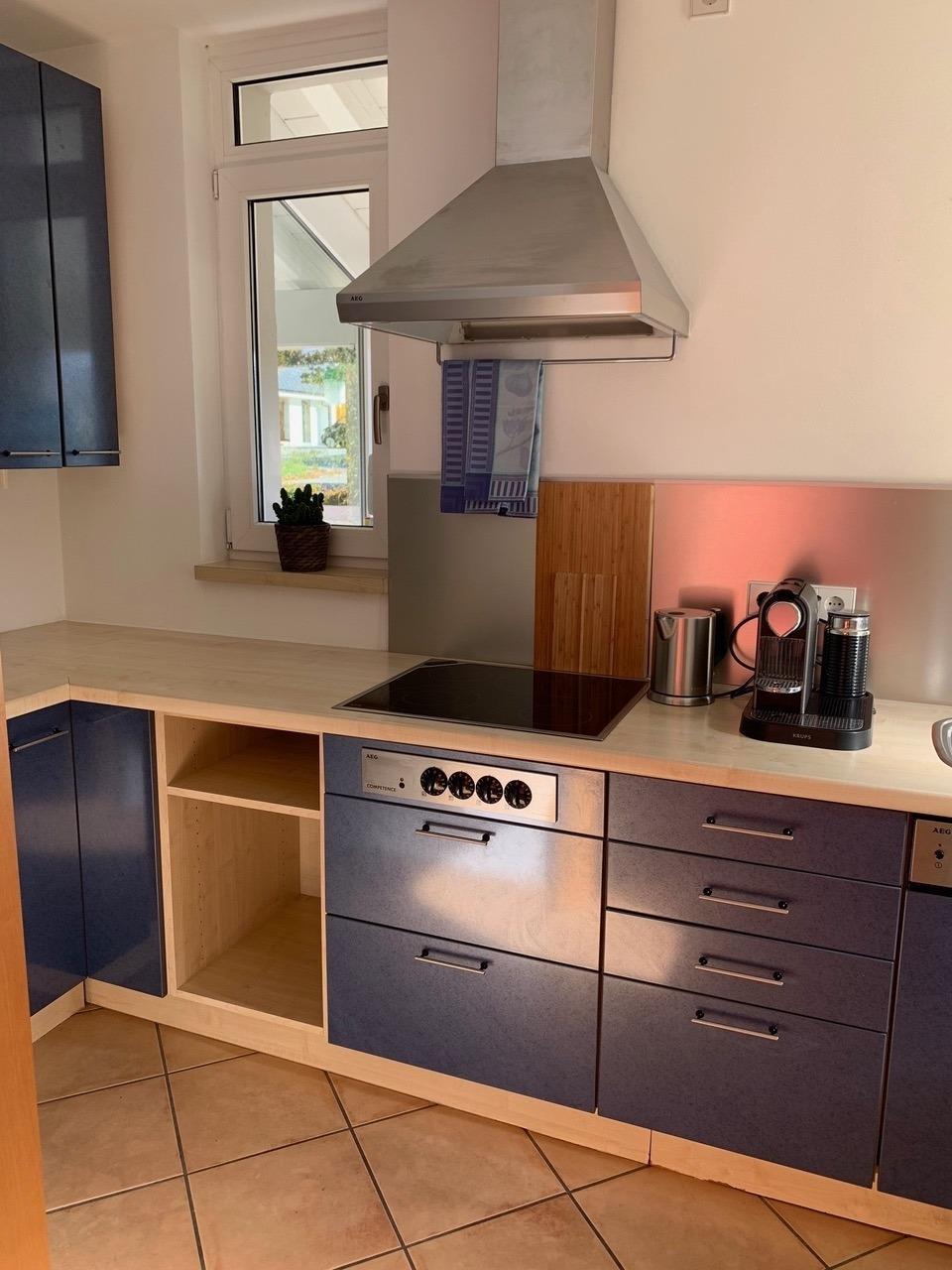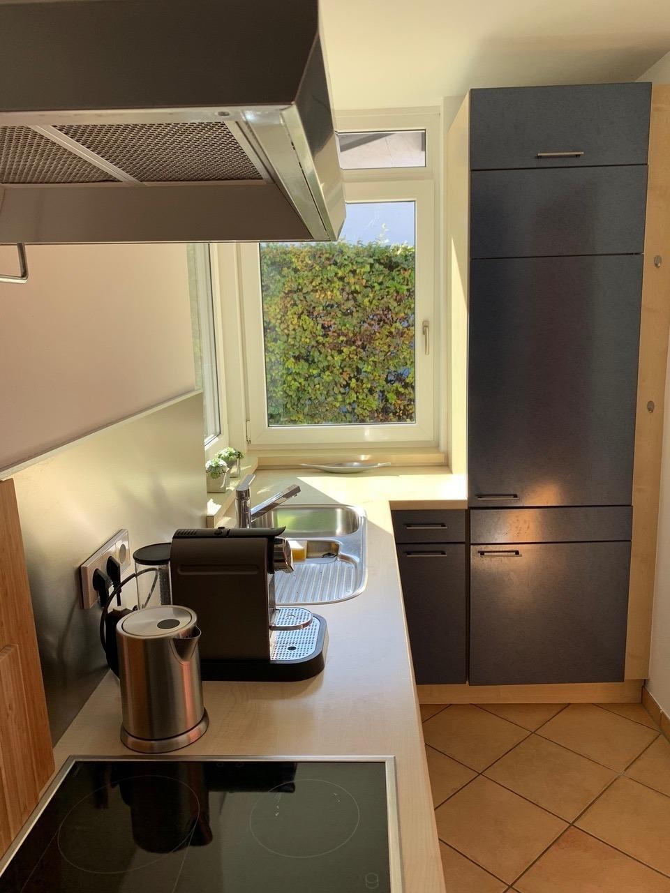 Die moderne Küche ist ausgestattet mit einem Ceranfeld, Backofen Kühlschrank und Gefrierschrank. Eine Krups Nespresso Kapselmaschine mit Milchschäumer, Wasserkocher, Töpfe, Pfannen, Geschirr und eine Grundausstattung sind vorhanden.