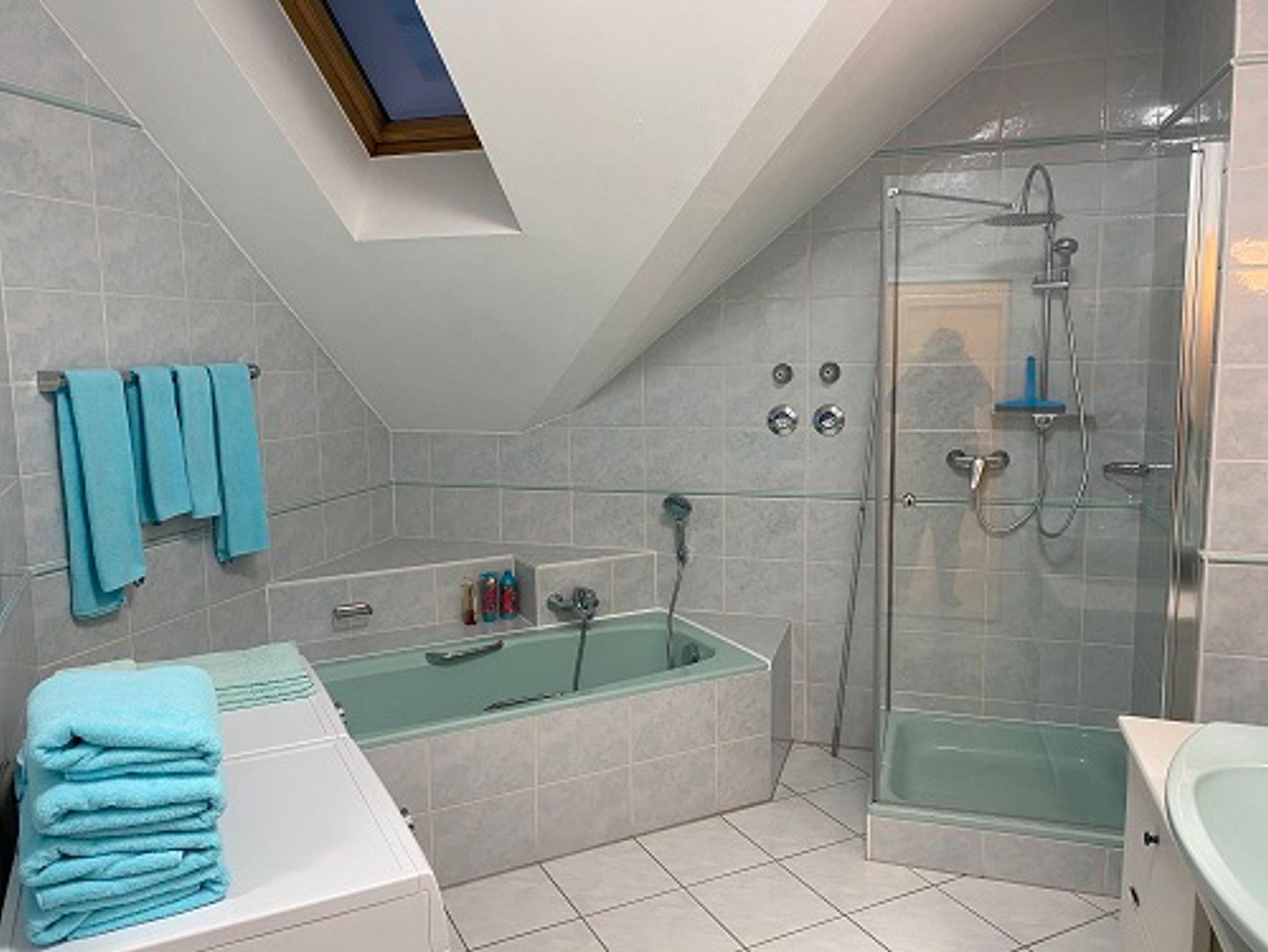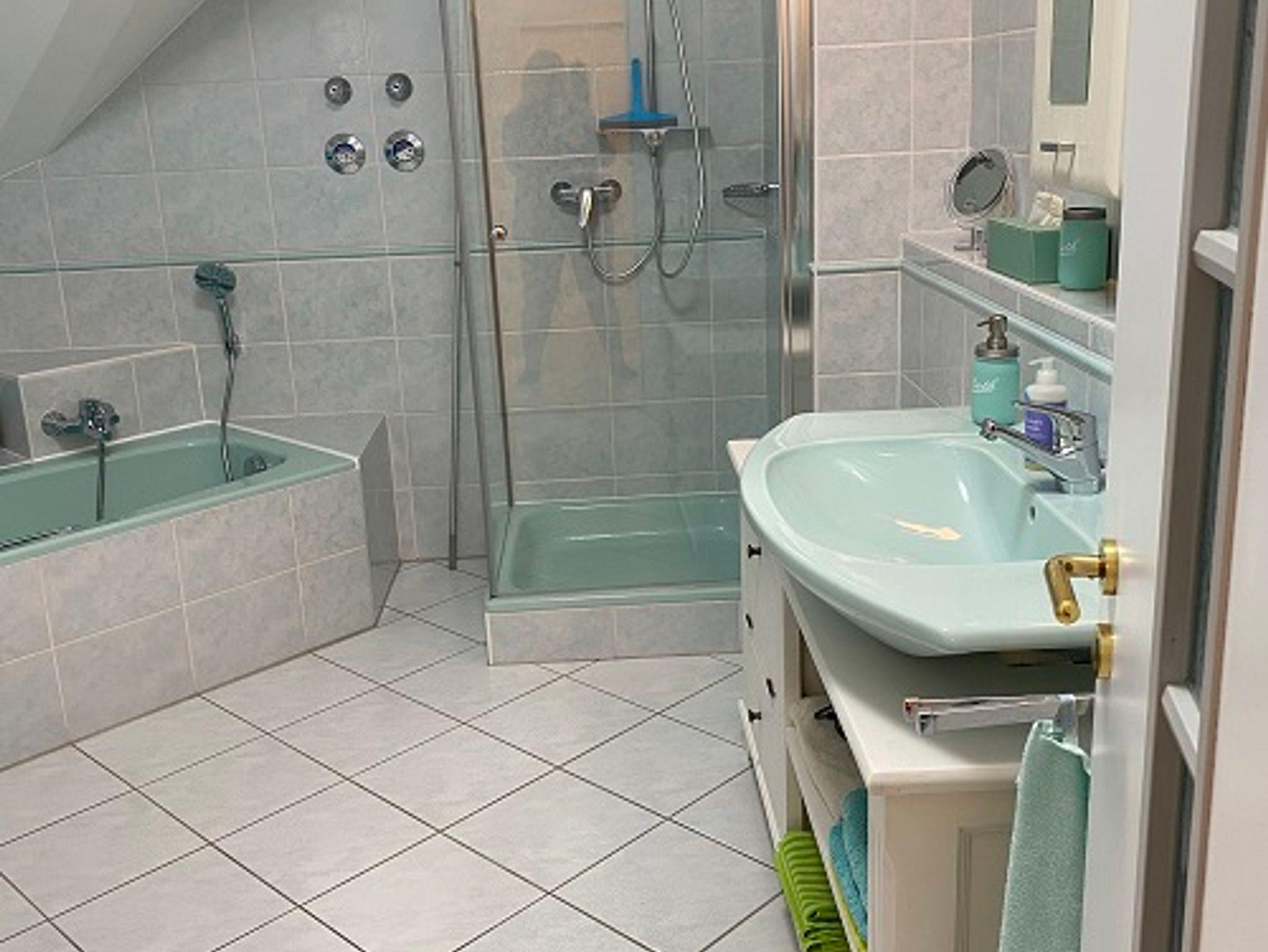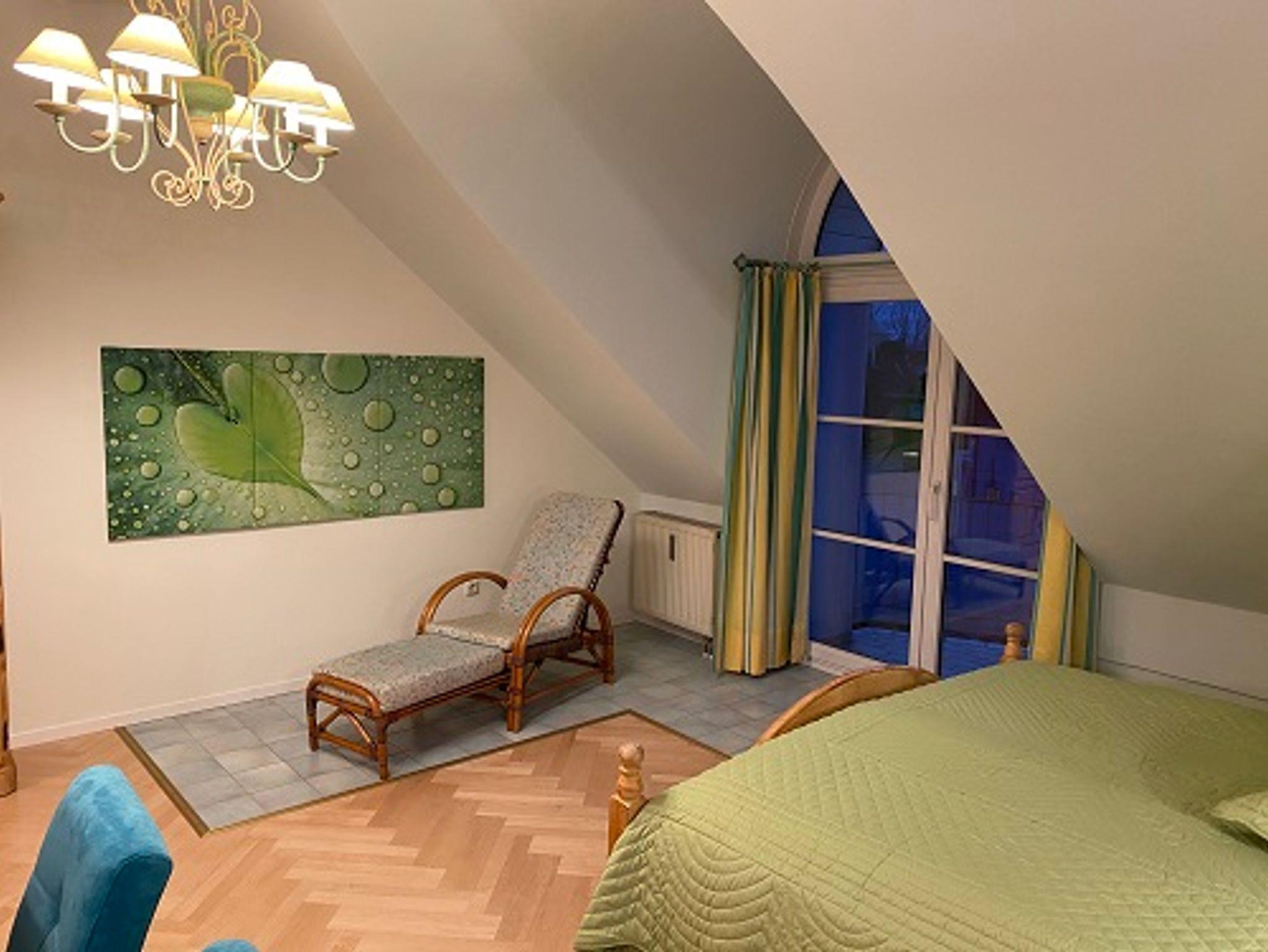 Schon beim Betreten dieser außergewöhnlichen Wohnung werden Sie entspannt durchatmen. In dieser lichtdurchfluteten Ferienwohnung werden Sie sich zu jeder Jahreszeit und bei jedem Wetter wohlfühlen. Die Räume sind lichtdurchflutet, freundlich und hell, wirken besonders großzügig durch die bis zu 4,5 m hohen Decken. Geschmackvolle Naturbilder erschaffen das Ambiente einer Galerie. Im großen Wohnbereich gibt es eine gemütliche Couch zum Relaxen, Fernsehen oder Entspannen. Falls Sie Schriftliches zu erledigen haben, steht ein Sekretär im Wohnbereich bereit. In der Mitte des Raumes ist der Eßtisch für 6 Personen, mit Blick nach Ost und West. Hier begleitet Sie Sonne und Licht beim Frühstück und beim Abendessen. Es gibt zwei separate Schlafzimmer mit jeweils 1 Doppelbett. Ein weiteres Doppelbett gibt es in der Mansarde im Wohnbereich. In dieser großzügig geschnittenen Ferienwohnung können bis zu 6 Personen leben und nächtigen und trotzdem bleibt genügend Raum für jeden. Das große Bad hat eine separate Badewanne und eine Glaskabinendusche, außerdem eine Bosch-Waschmaschine und einen Bosch-Wäschetrockner sowie ein Waschbecken und einen Toiletten-Spiegelschrank. Die Toilette befindet sich im Flur separat.