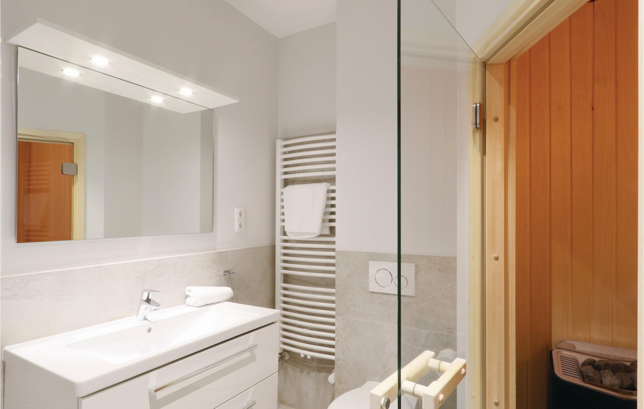 Noget særligt er badeværelset, der er jeres helt personlige lille wellnessområde med sauna og dampbad med integreret dobbelt regnskovsbruser. Her kan I slappe af og lade tankerne glide på langfart, glemme alt om hverdagens problemer og lade de flade batterier op igen. Ikke nok med det, når badet er slut kan I sætte jer foran de flakkende flammer i bioetanol-kaminen som giver et hyggeligt lys. Den bekvemme sofa lader sig nemt forvandle til to bekvemme sovemuligheder.
