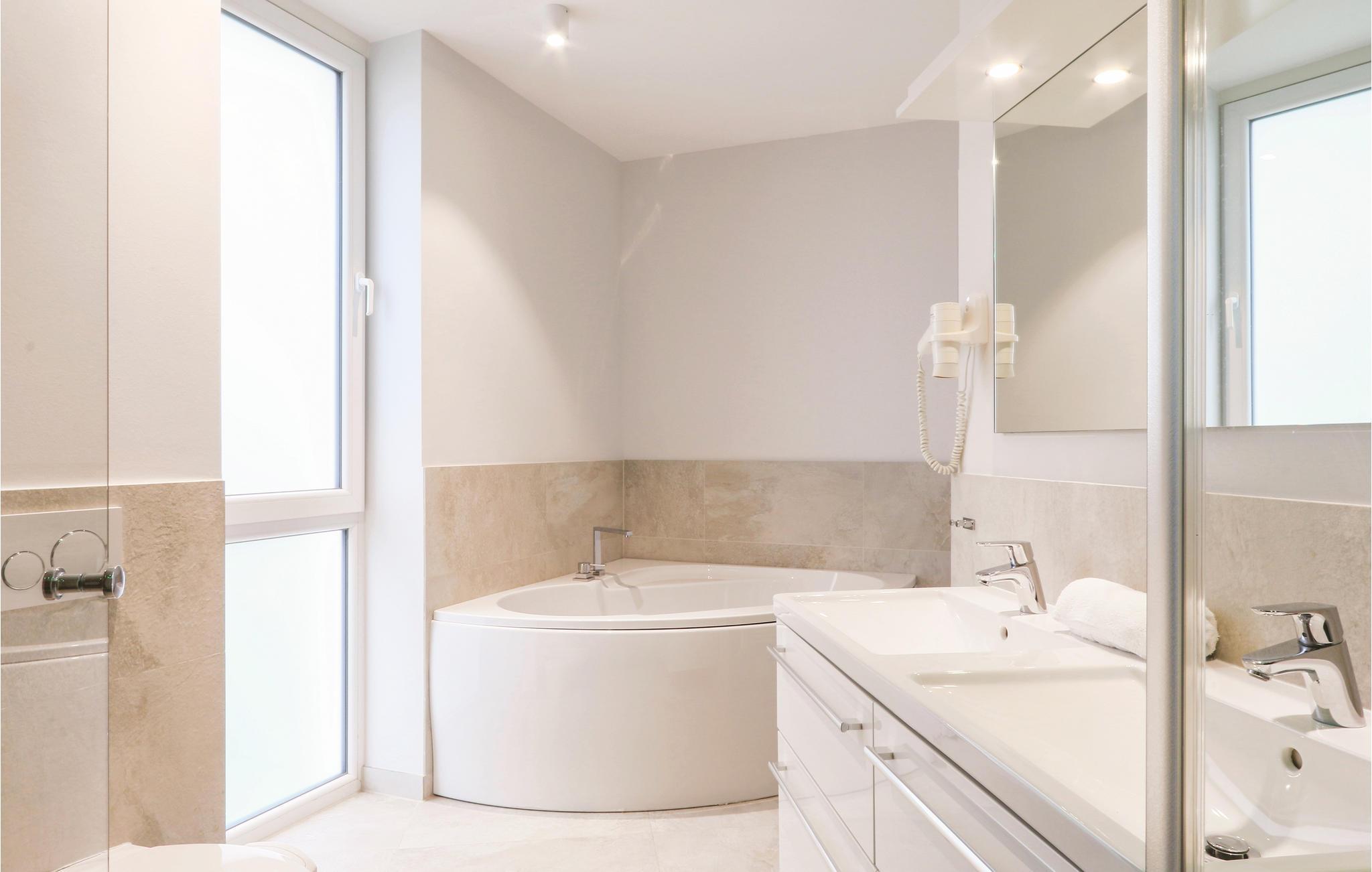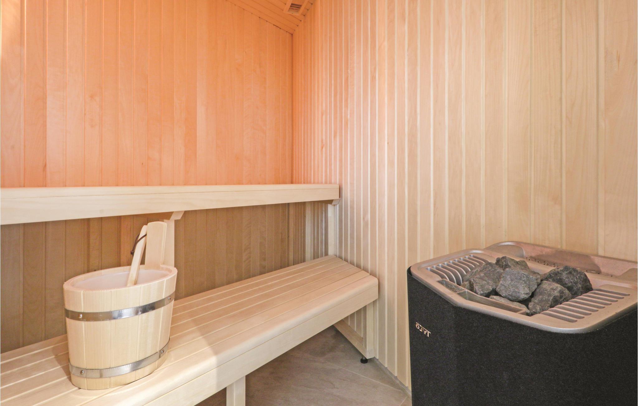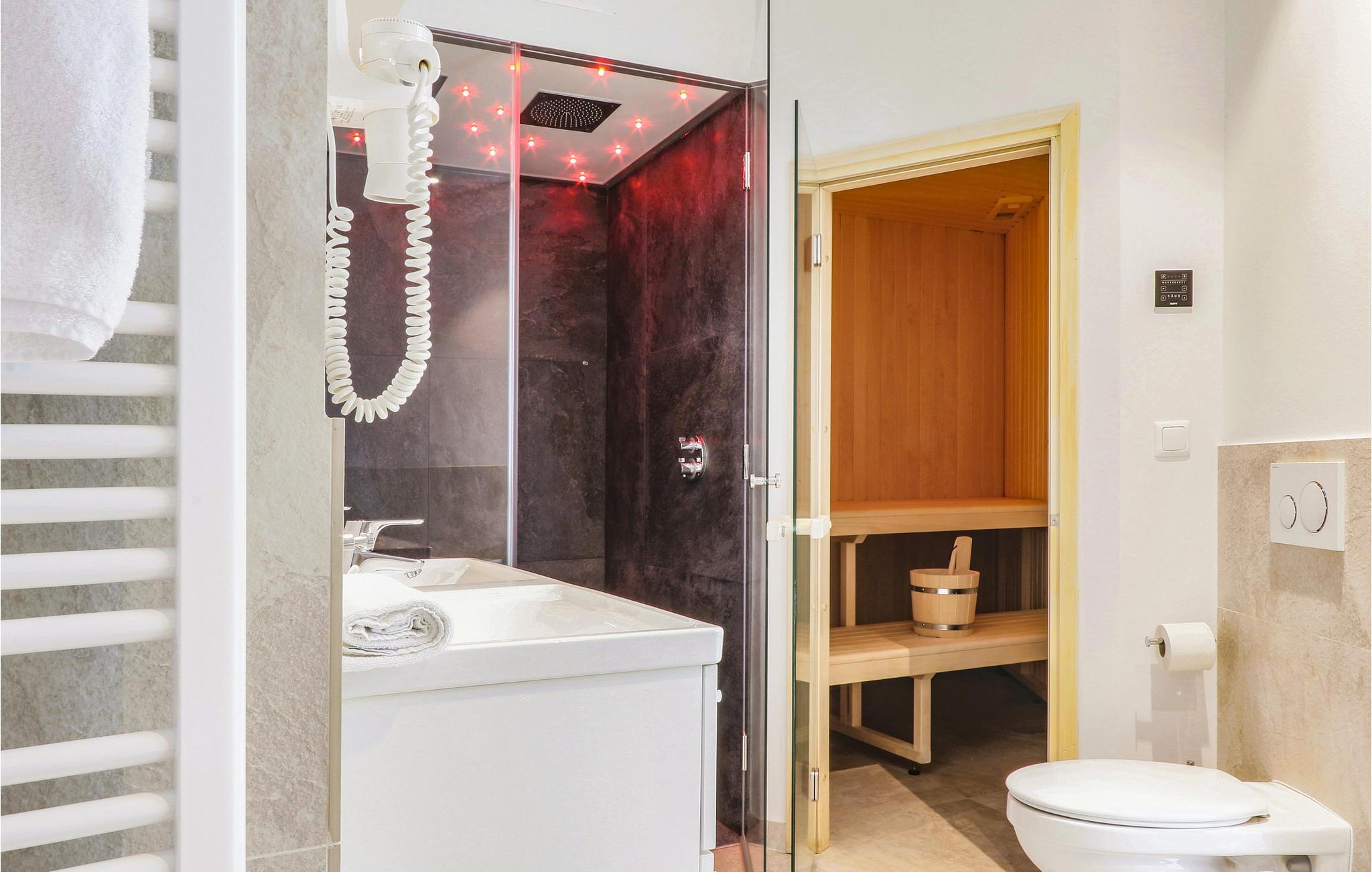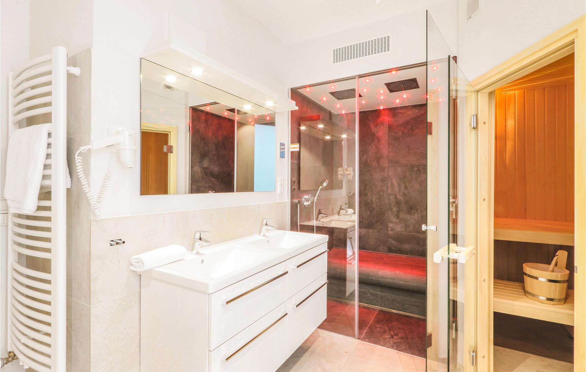 Noget særligt at badeværelset, der er jeres helt personlige lille wellnessområde med sauna og dampbad med integreret dobbelt regnbruser. Her kan I slappe af og lade tankerne glide på langfart, glemme alt om hverdagens problemer og lade de flade batterier op igen.