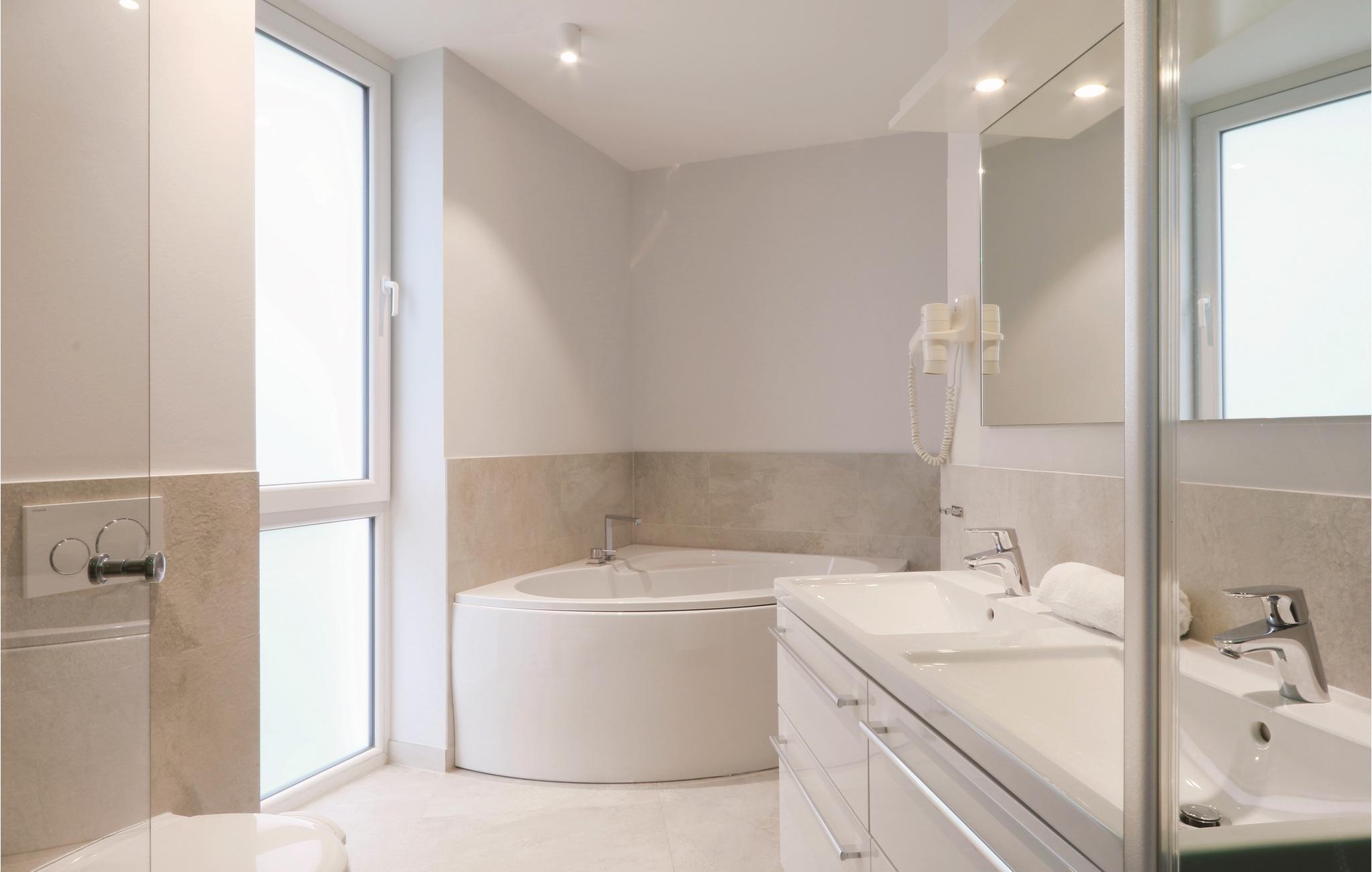 Noget særligt er badeværelset, der er jeres helt personlige lille wellnessområde med sauna, whirlpool og dampbad med integreret dobbelt regnskovsbruser. Her kan I slappe af og lade tankerne glide på langfart, glemme alt om hverdagens problemer og lade de flade batterier op igen.