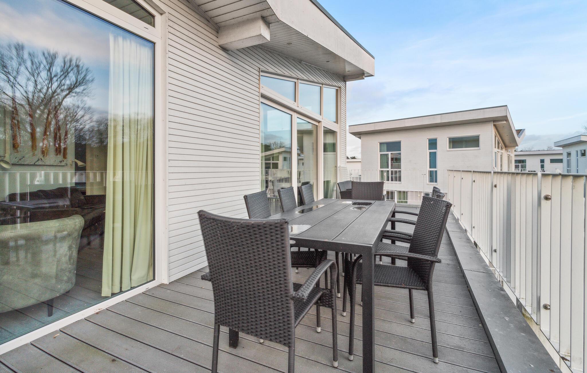 Ferieboligens highlight er den store tagterrasse, som med sine 42 m² byder på en herlig plads i solen. Her kan I spise sammen eller slappe af. Der er to liggestole og flere andre havemøbler, som står til jeres rådighed.
