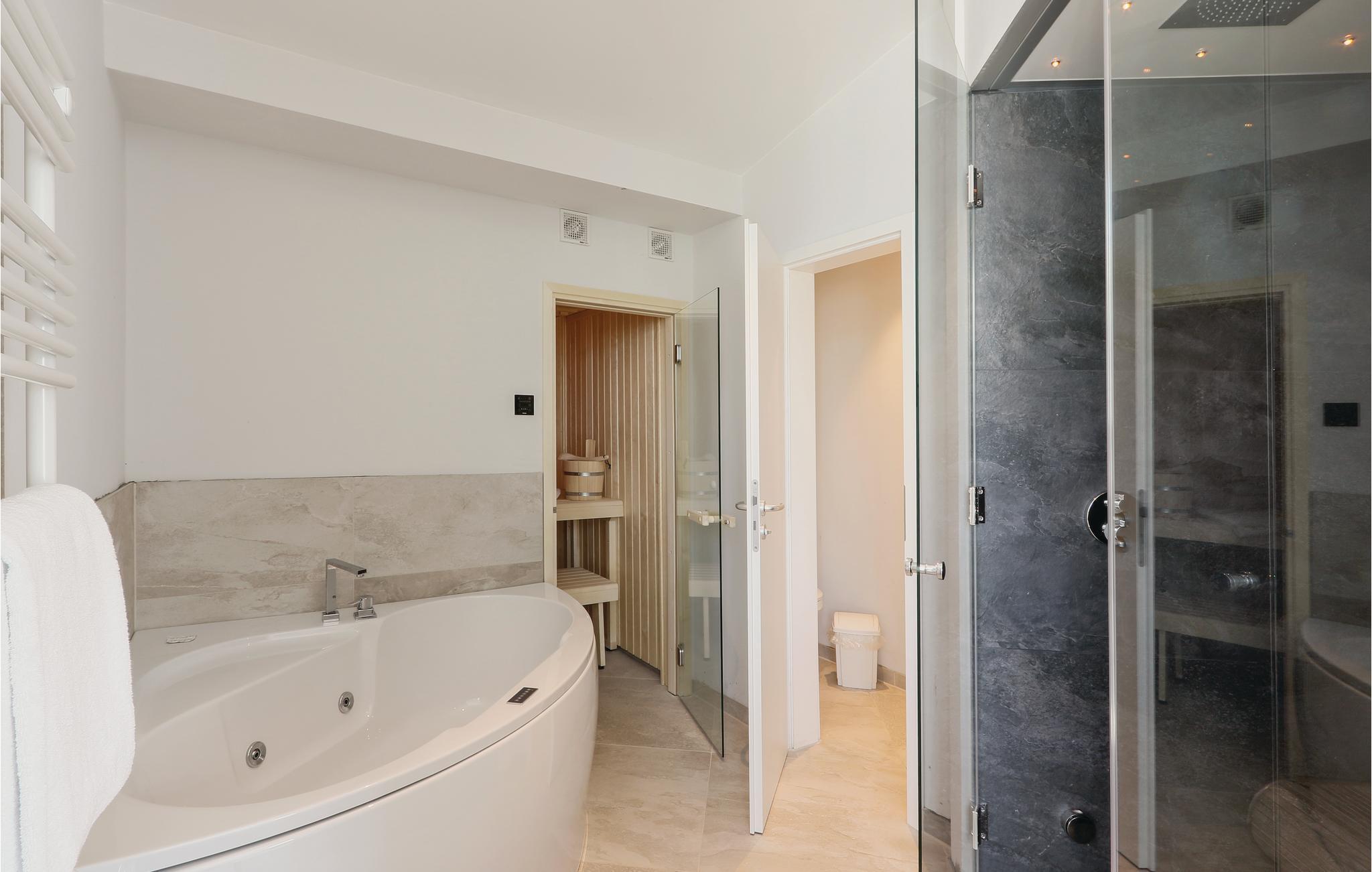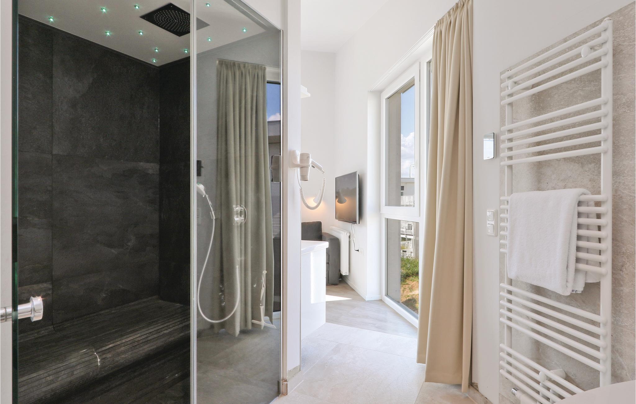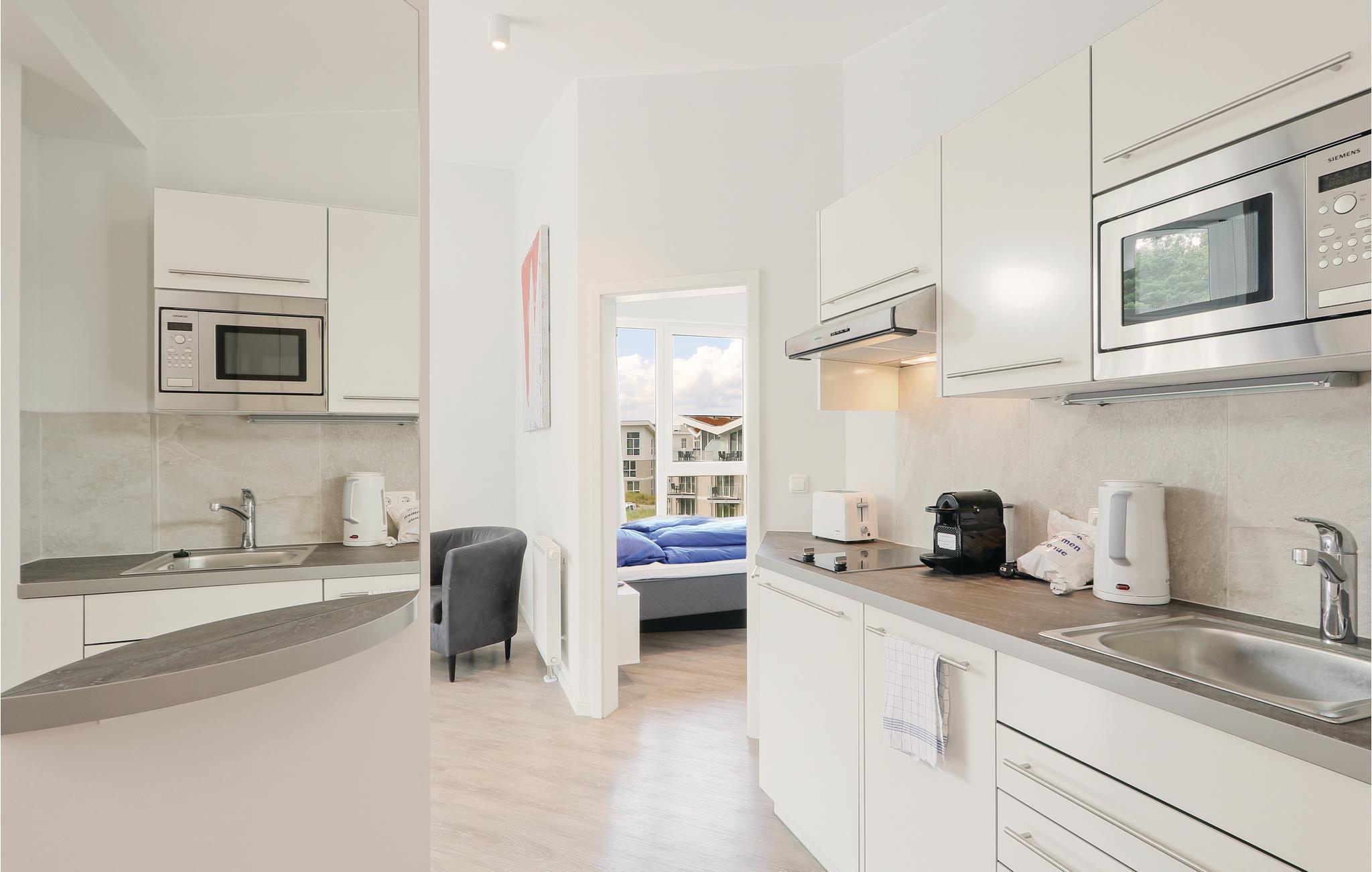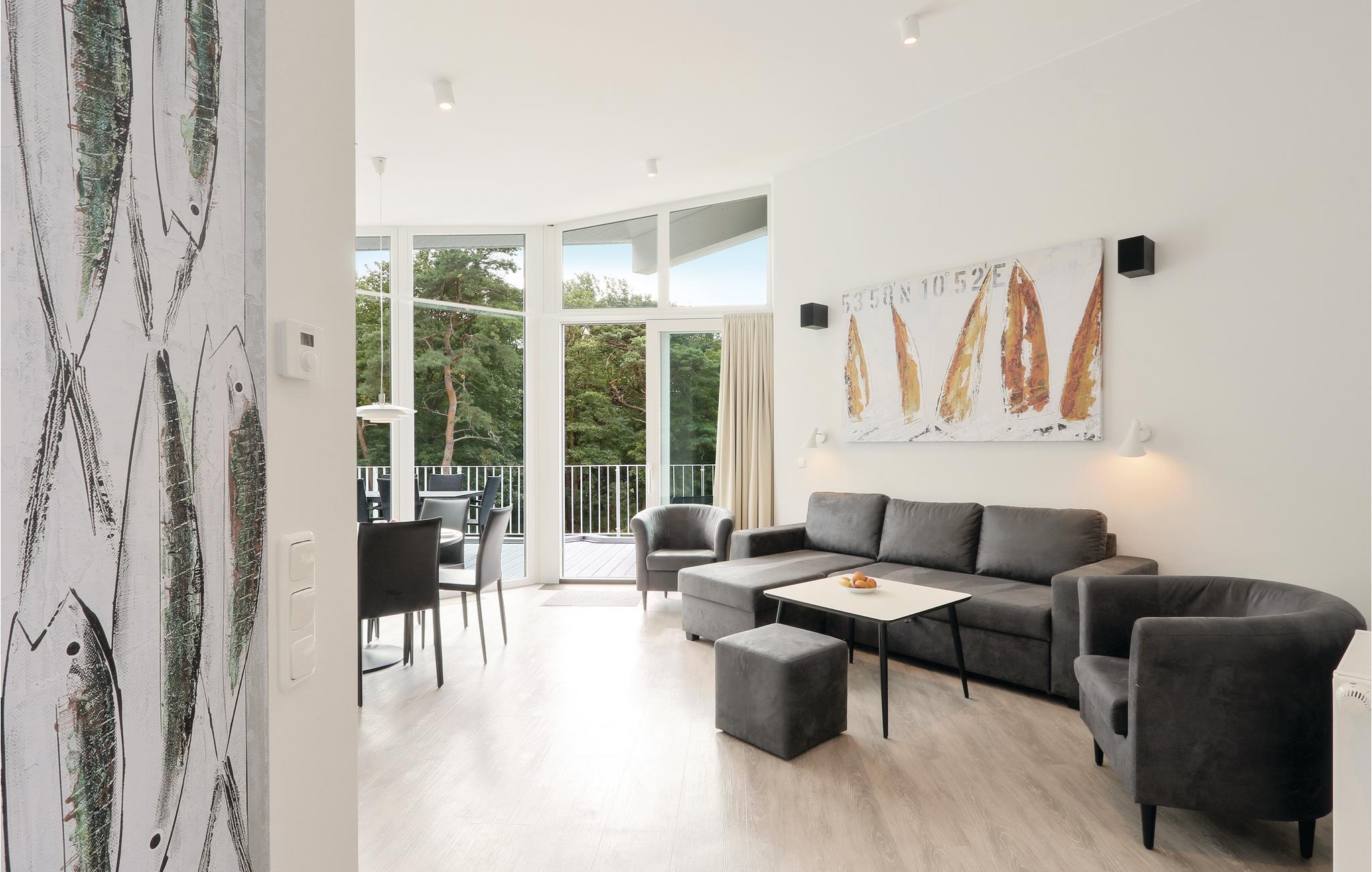 Lejligheden ligger i en klitvilla (anlagte klitter) med flot indretning i et roligt område bag promenadevillaerne. Ferielejligheden er flot indrettet i moderne design. I det separate soveværelse finder I en fin dobbeltseng, og i stuen er der yderligere to sovepladser. Herfra kan I gå ud på den store tagterrasse, hvor I kan sidde og spise jeres morgenmad eller bare nyde den friske østersøluft. I stuen finder I en biokaminen, som bidrager til en hyggelig atmosfære i rummet. Badeværelset præsenterer sig som jeres helt eget wellnessområde med dampbad og dobbelt regnbruser. I kan også slappe af i whirlpoolen og svede igennem i saunaen.