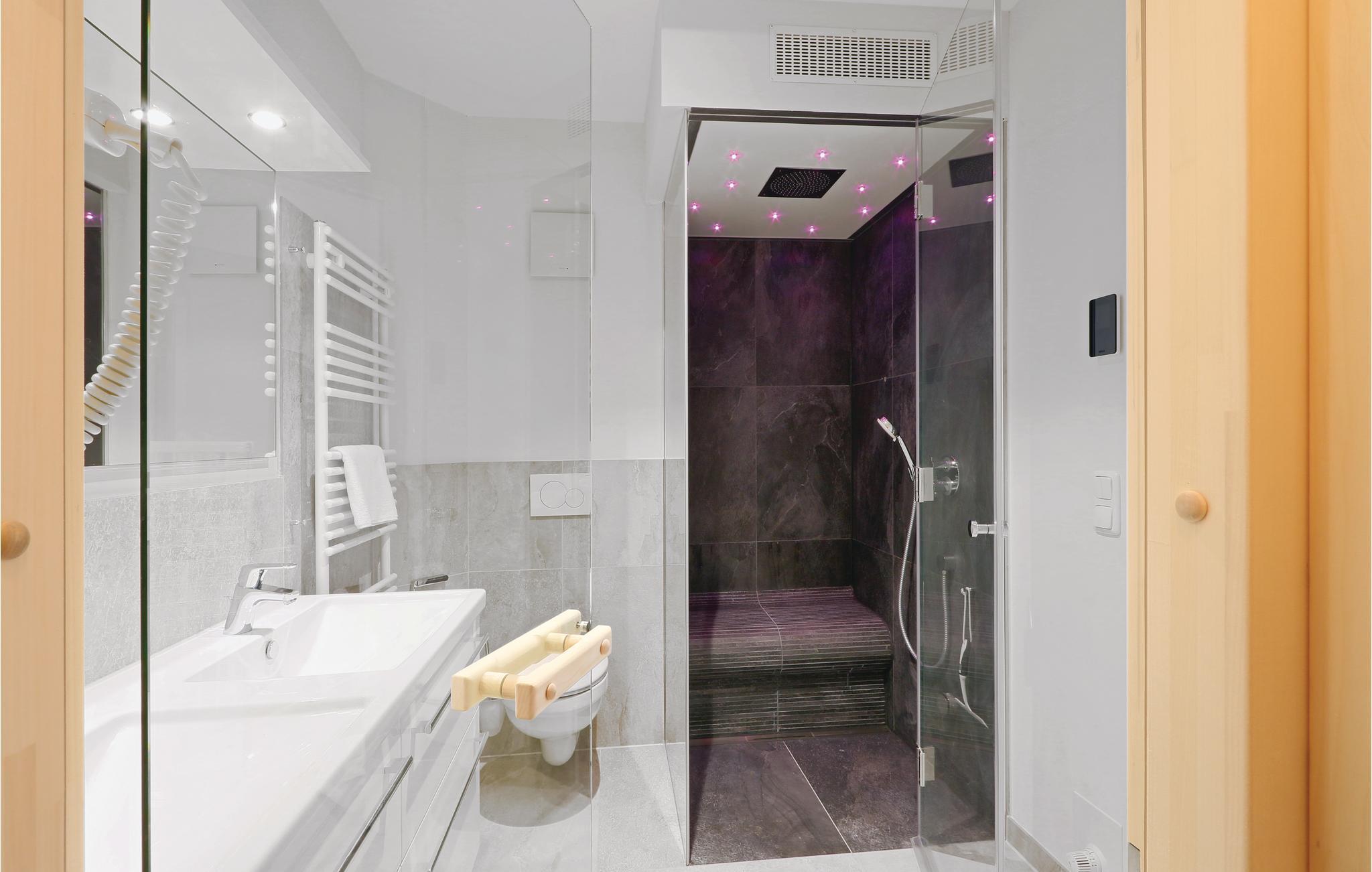 Badeværelset er et rent wellnessparadis. Her er der infrarød sauna og dampbad med regnskovsbruser. Lejligheden er udstyret med moderne underholdningssystem med Blu-ray-afspiller, fladskærms-tv og et musikanlæg, hvorfra I kan streame.