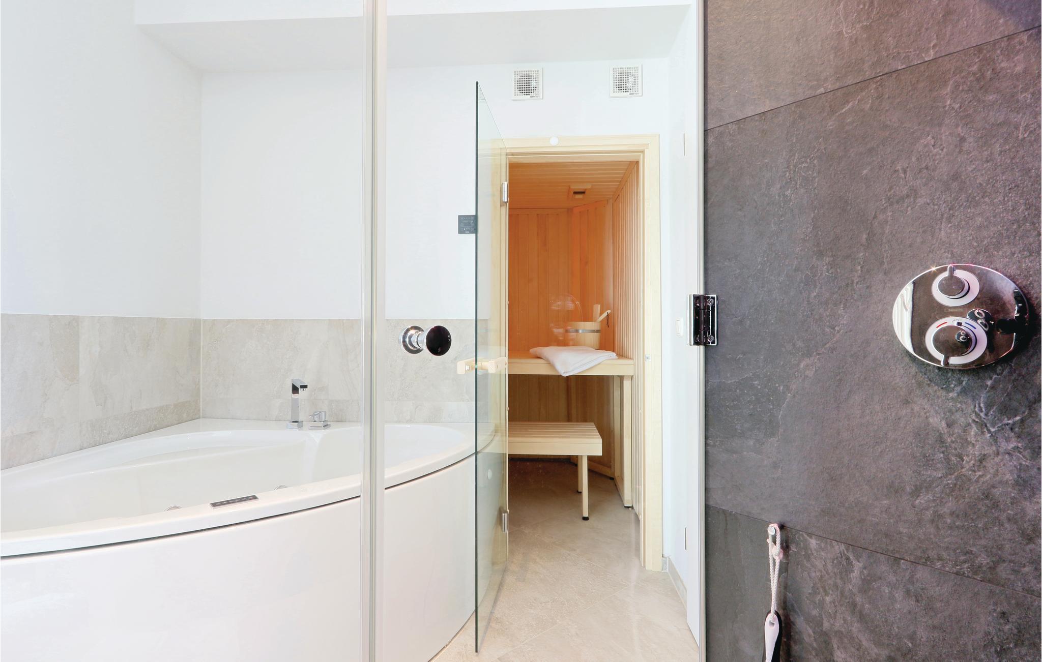 Det åbne badeværelse præsenterer sig som jeres helt eget wellnessområde med dampbad og dobbelt regnbruser. I kan også slappe af i whirlpoolen og svede igennem i saunaen.
