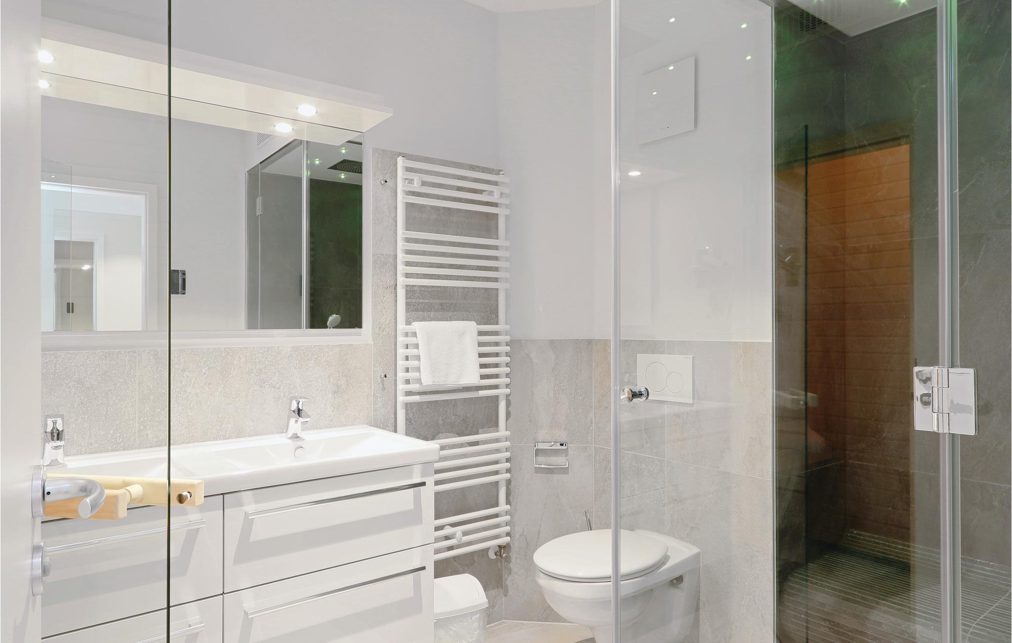 Badeværelset er et rent wellnessparadis. Her er der infrarød sauna og dampbad med regnskovsbruser. Lejligheden er udstyret med moderne underholdningssystem med Blu-ray-afspiller, fladskærms-tv og et musikanlæg hvorfra I kan streame.