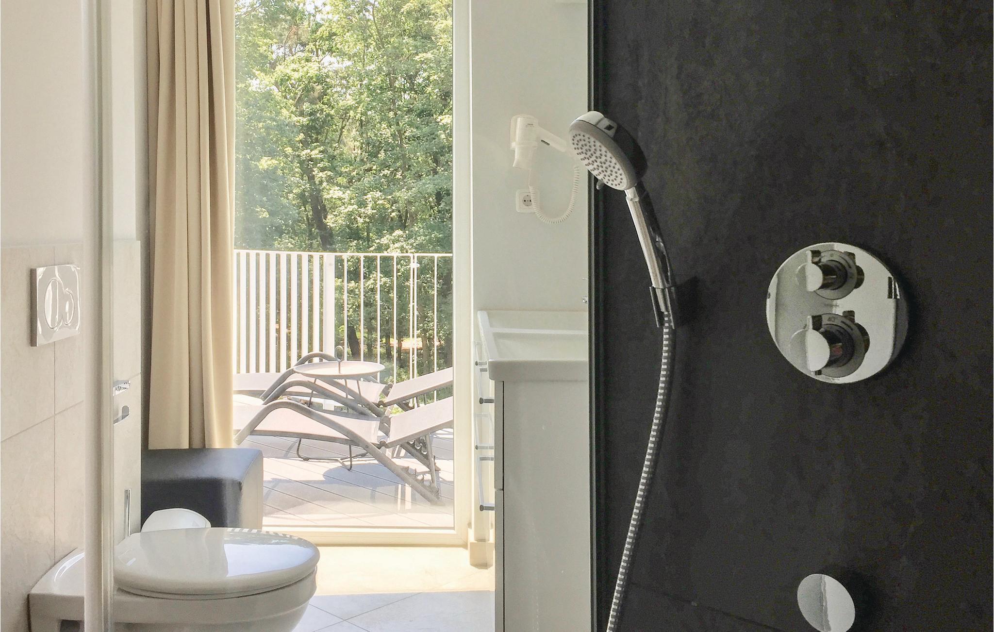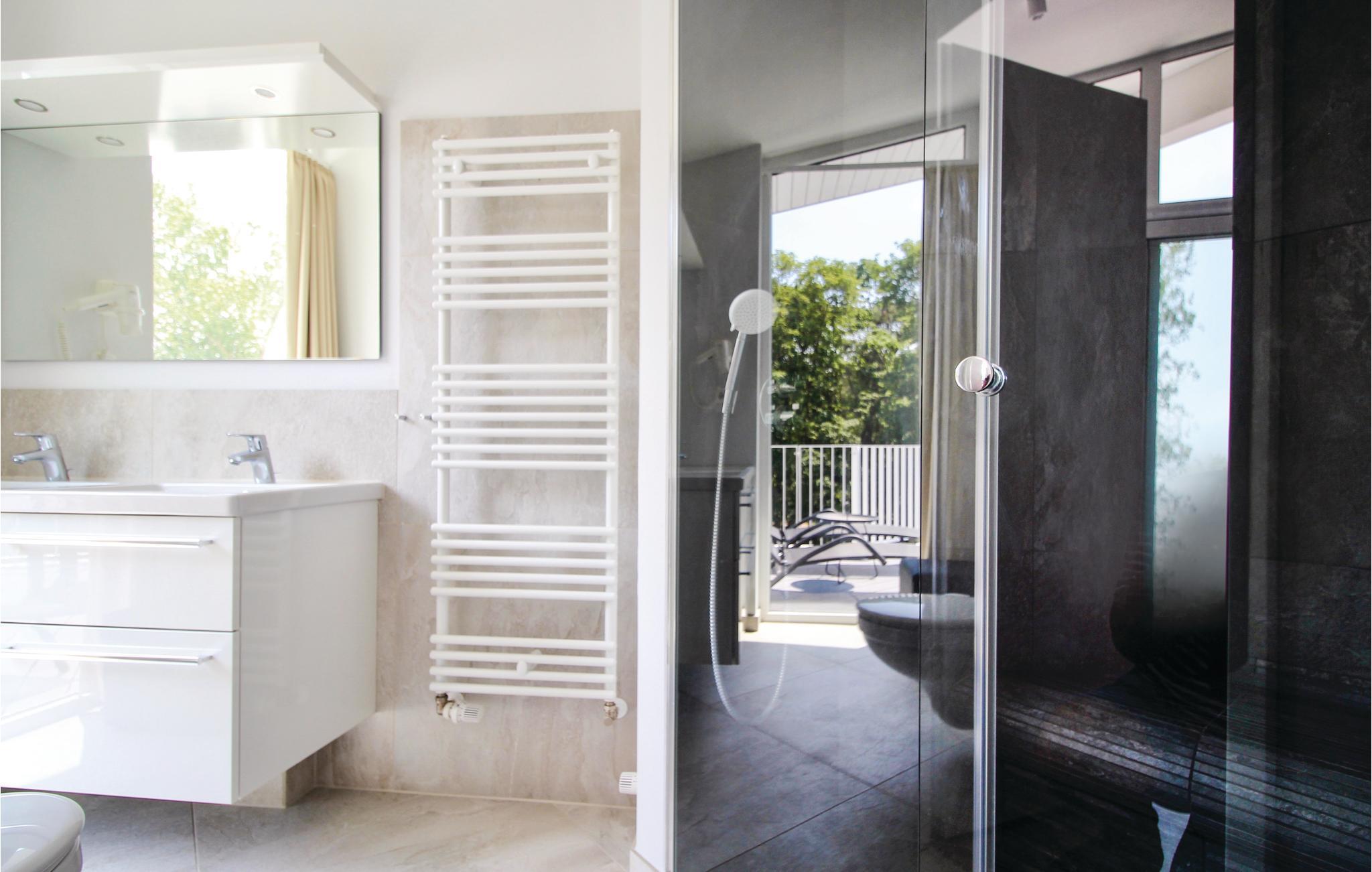 Badeværelset præsenterer sig som jeres helt eget wellnessområde med dampbad og dobbelt regnbruser.