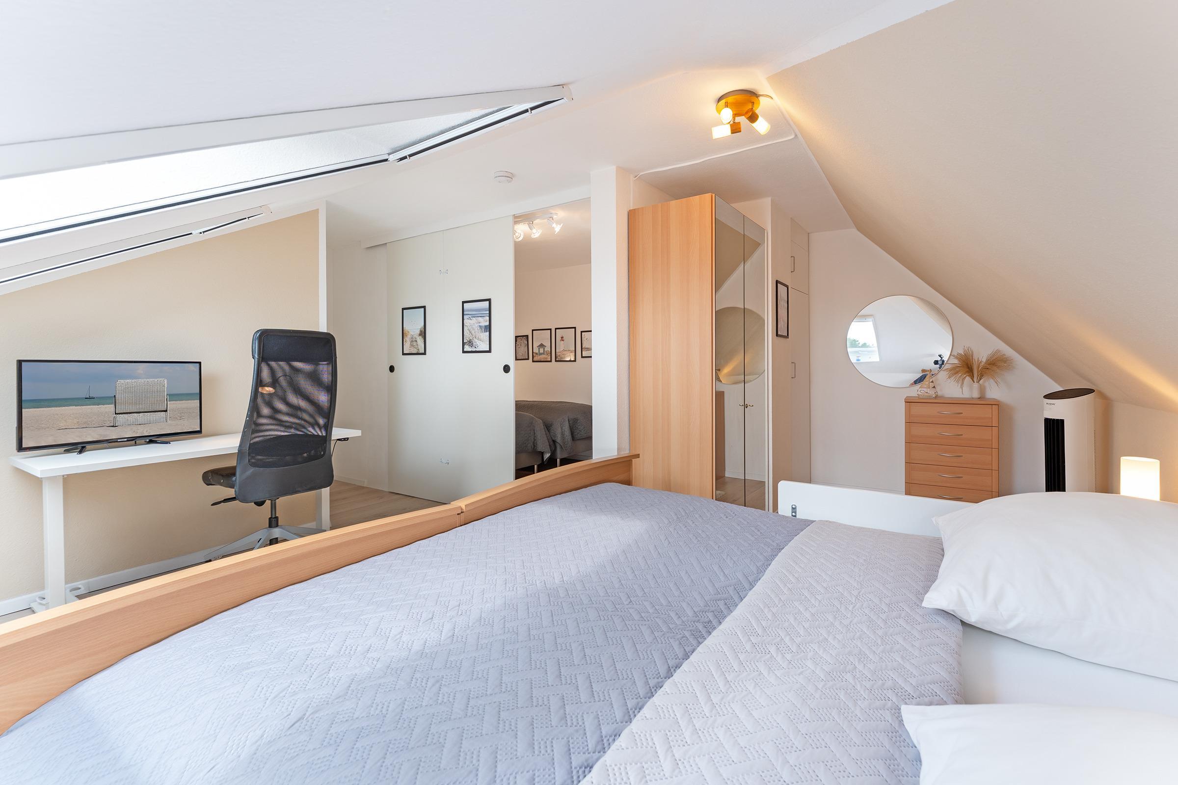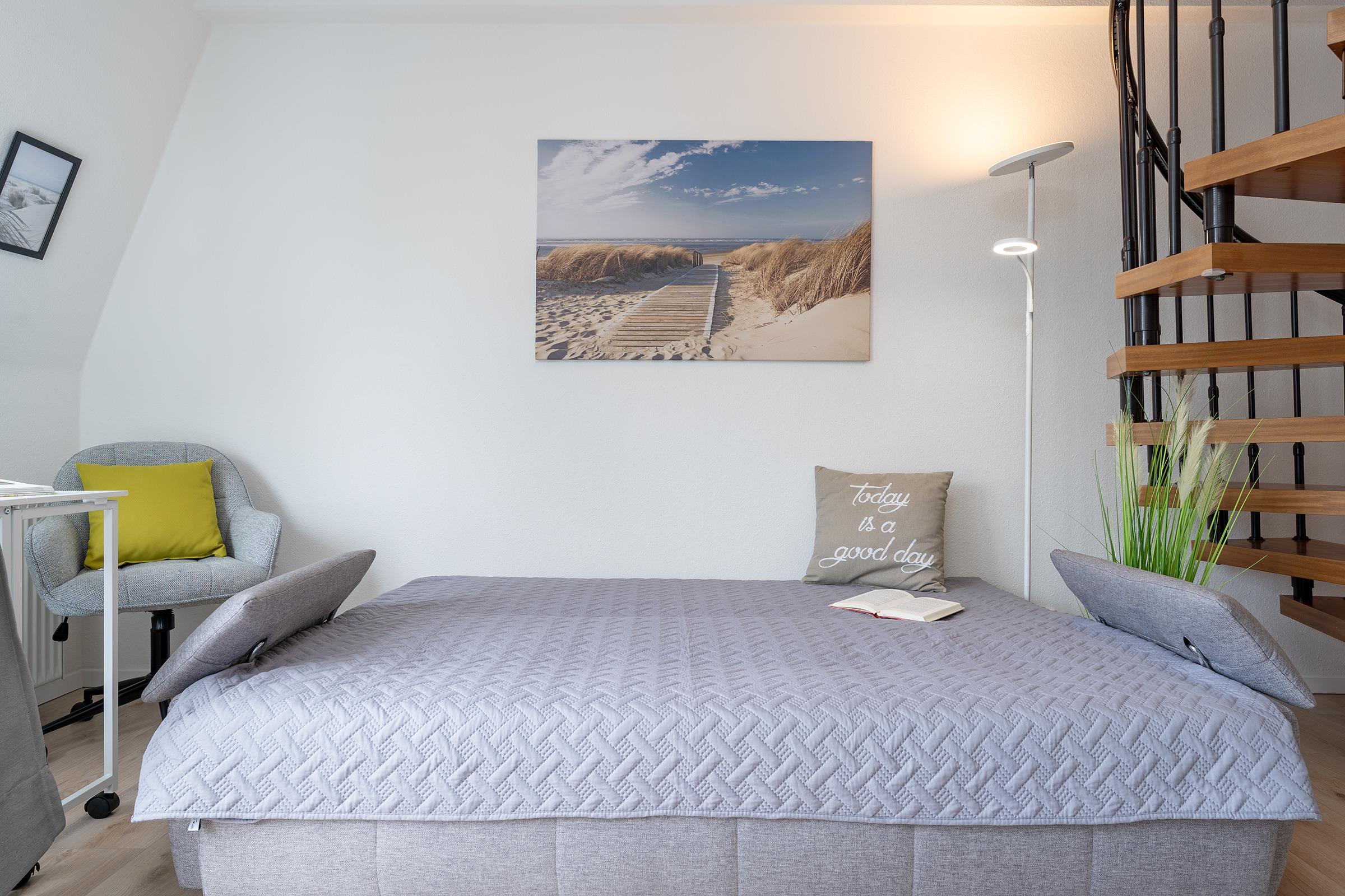 Der Wohnbereich, der zusätzlich über ein Schlafsofa für zwei Personen verfügt, bietet Ihnen Unterhaltung mit einem Radio oder dem TV. In der angrenzenden Küchenzeile bleiben keine Wünsche offen - Eierkocher, Kaffeemaschine und Toaster bilden die Grundlage für ein tolles Frühstück. Über die Treppe gelangen Sie zu den Schlafbereichen. Das Hauptschlafzimmer verfügt über ein großzügiges Doppelbett und das kleine Schlafzimmer, das nur durch eine Schiebetür getrennt ist, verwöhnt zwei Gäste mit je einem Boxspringbett. Frisch in den Tag starten Sie im funktionalen Badezimmer mit Dusche und Haartrockner. Das Highlight der Wohnung ist der Balkon mit Südausrichtung, Sonnenliegen und Markise - hier lässt sich der Urlaubstag wunderschön abschließen. In den Wintermonaten können Sie von hier aus sogar die wunderschöne Ostsee glitzern sehen.