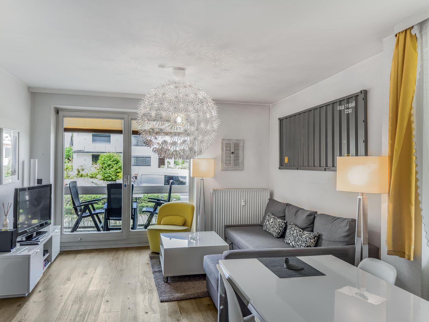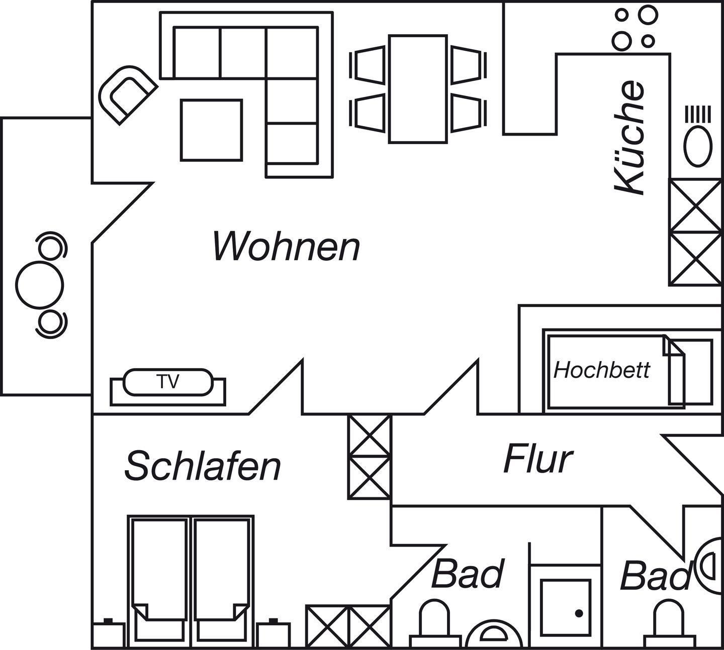 Eine abgetrennte Kajüte mit einem Hochbett für zwei Kinder sorgt dafür, dass die Schlafcouch im Wohnbereich nicht mehr umgebaut werden muss und das Wohnzimmer vollständig nutzbar bleibt. Der Balkon mit Blick in den Vorgarten lädt zum Entspannen ein, und die ruhige Lage sowie die Nähe zum Strand machen das Apartment besonders attraktiv.
