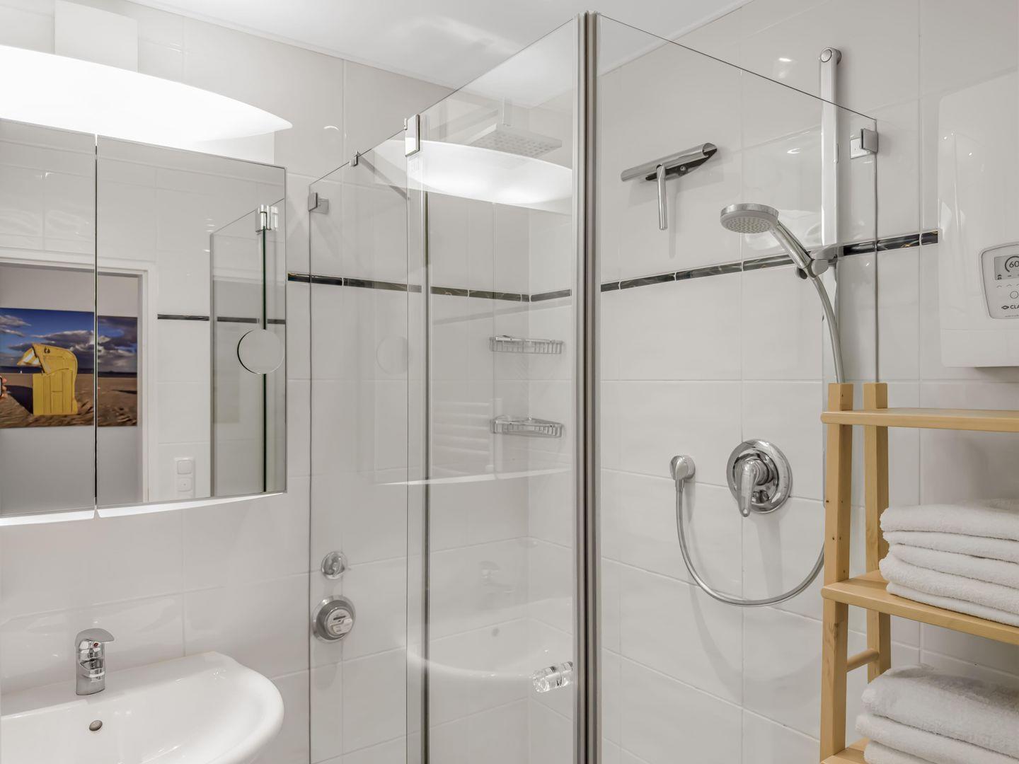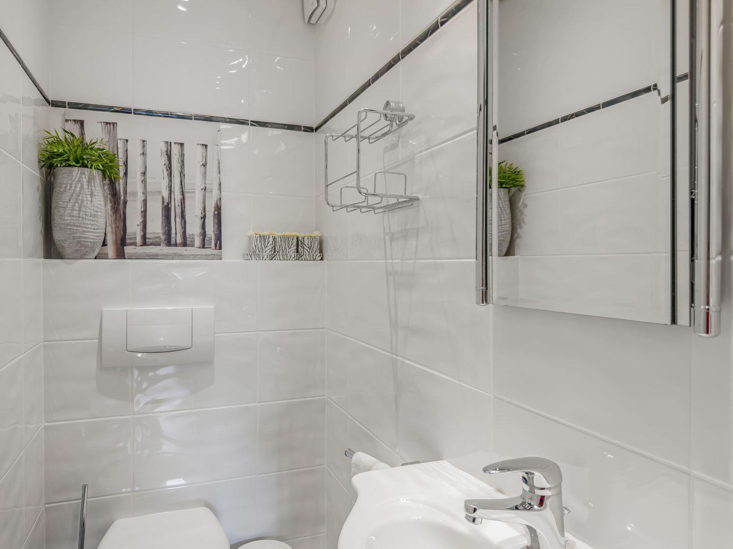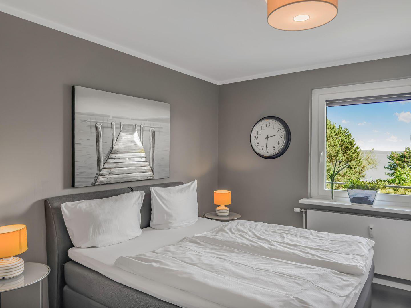 Dieses moderne 3-Zimmer-Apartment im 1. Obergeschoss bietet auf ca. 87 m² viel Platz für einen komfortablen Aufenthalt. Mit zwei Schlafzimmern – eines mit Doppelbett und eines mit zwei Einzelbetten – sowie einer gut ausgestatteten Einbauküche inklusive Backofen, Ceranfeld, Geschirrspüler und Mikrowelle ist es ideal für Familien oder Freunde. Das Wohnzimmer mit TV und Musikanlage lädt zum Entspannen ein, und der Eckbalkon bietet einen schönen Blick auf das Meer. Der Strand liegt direkt auf der anderen Straßenseite, und ein Tiefgaragenstellplatz sowie eine Waschmaschine im Keller sorgen für zusätzlichen Komfort.