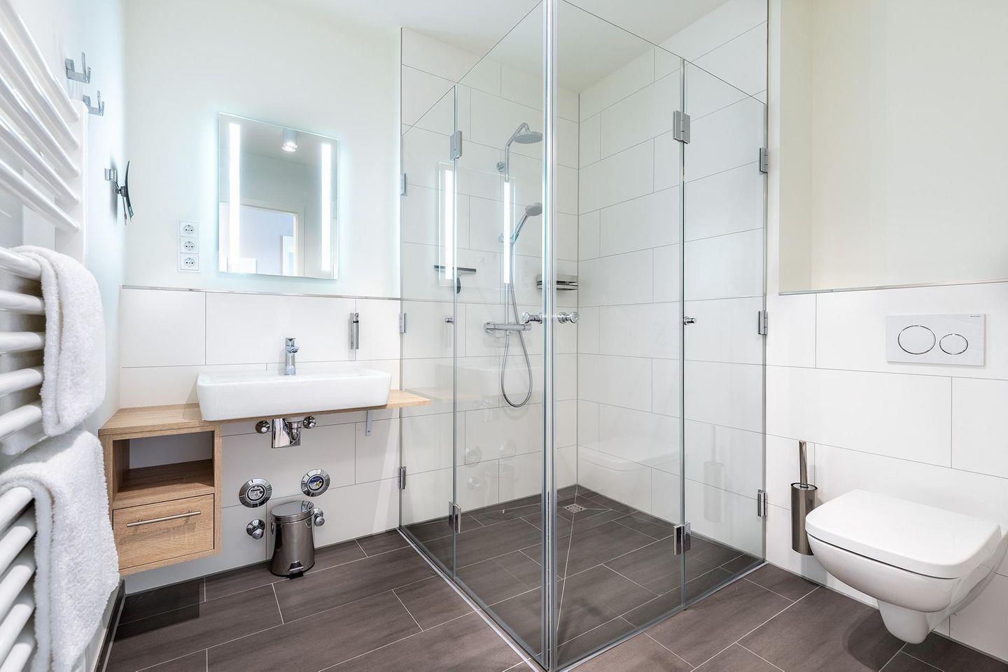 Das Apartment ist modern eingerichtet, klimatisiert und verfügt über Fußbodenheizung, WLAN sowie ein stilvolles Bad mit bodengleicher Dusche, Handtuchheizkörper und Föhn.