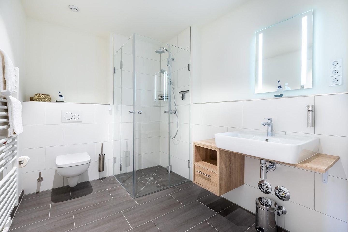 Das stilvolle Badezimmer ist hochwertig ausgestattet mit einer ebenerdigen Dusche, WC, einem Waschtisch mit Föhn, Kosmetikspiegel, Handtuchheizkörper und Fußbodenheizung – für Ihren persönlichen Wellnesskomfort.