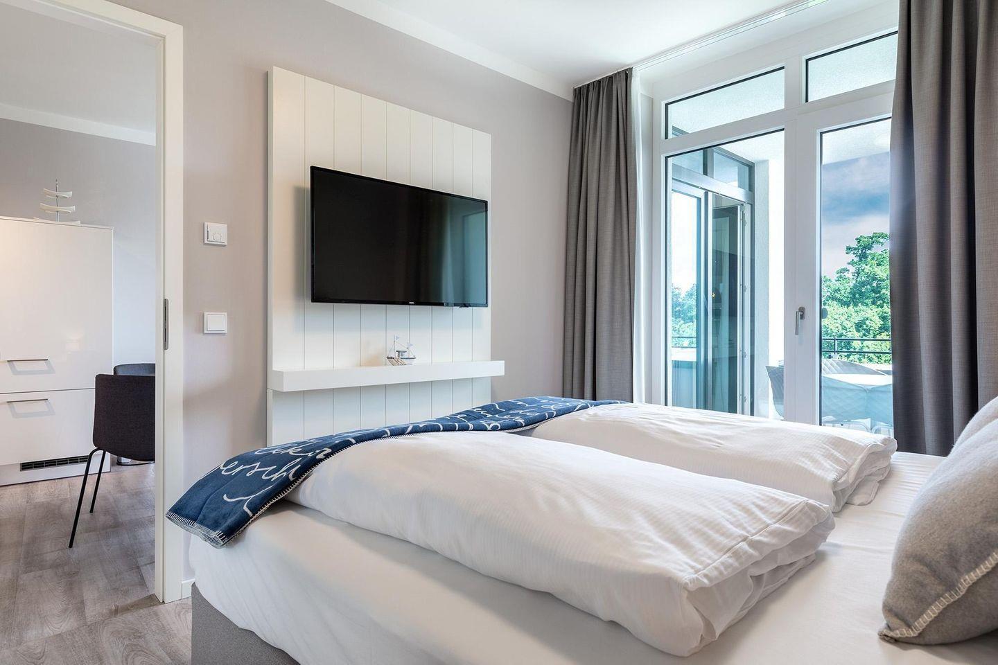 Im separaten Schlafzimmer erwartet Sie ein modernes Boxspringbett, das Ihnen erholsamen Schlaf garantiert. Auch hier steht Ihnen ein weiterer Flatscreen-TV zur Verfügung.