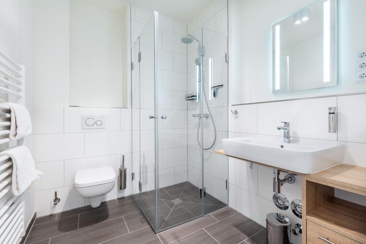 Das stilvolle Badezimmer verfügt über eine ebenerdige Dusche, einen Waschtisch mit Föhn, WC, Handtuchheizkörper und ebenfalls eine angenehme Fußbodenheizung – perfekt für entspannte Morgen oder erholsame Abende nach einem Tag am Strand.