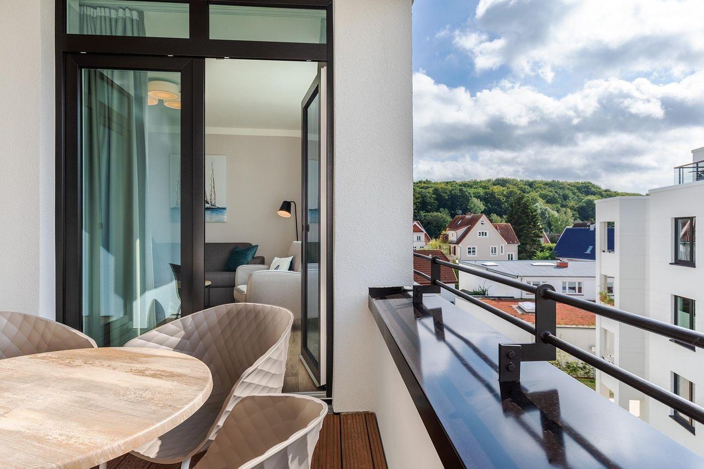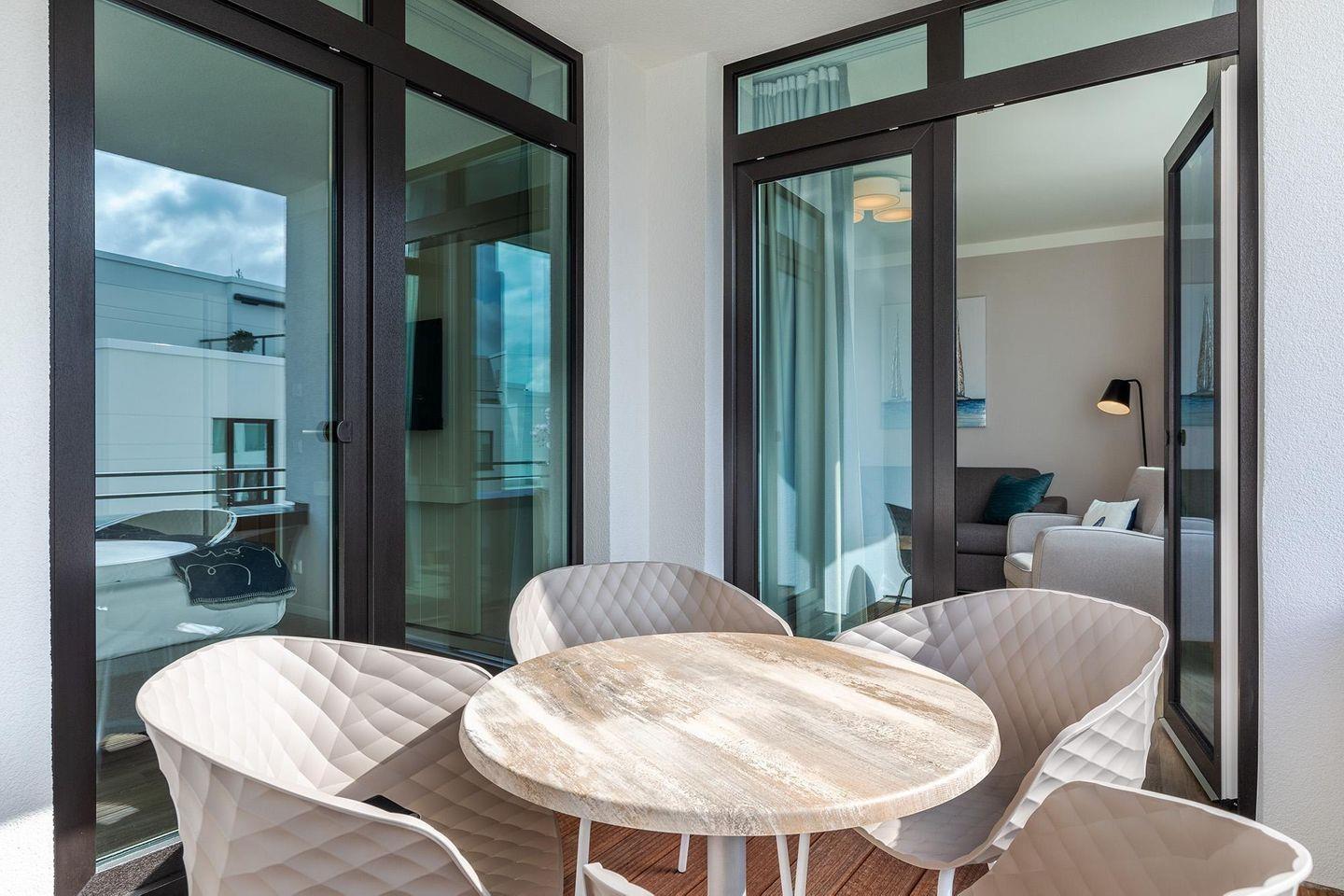 Ein Highlight ist die überdachte Loggia in sonniger West-Lage, die Ihnen sonnige Nachmittage und laue Abende mit Blick ins Grüne garantiert. Hier genießen Sie das gesunde Meeresklima in aller Ruhe – bei einem Glas Wein, einem guten Buch oder einfach im Moment verweilend.