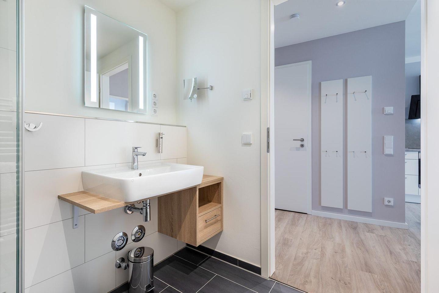 Das stilvolle Badezimmer ist mit einer ebenerdigen Dusche, WC, Waschtisch, Kosmetikspiegel, Föhn, Handtuchheizkörper und ebenfalls mit Fußbodenheizung ausgestattet – hier starten Sie entspannt in den Tag.