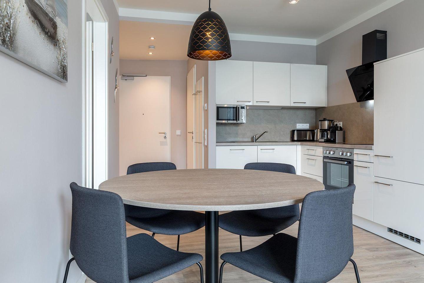 Das helle, barrierefreundliche Apartment überzeugt mit einer durchdachten Ausstattung, angefangen bei der Fußbodenheizung über sonnenschutzverglaste, teilweise bodentiefe Fenster bis hin zum kostenfreien WLAN. Die offen gestaltete Küche ist vollständig ausgestattet mit Geschirrspüler, Kühl-Gefrierkombination, Espressomaschine, Kaffeemaschine, Wasserkocher, Toaster, Eierkocher, Stabmixer, Mikrowelle, Backofen und Glaskeramikkochfeld – ideal für alle, die auch im Urlaub gerne selbst kochen.