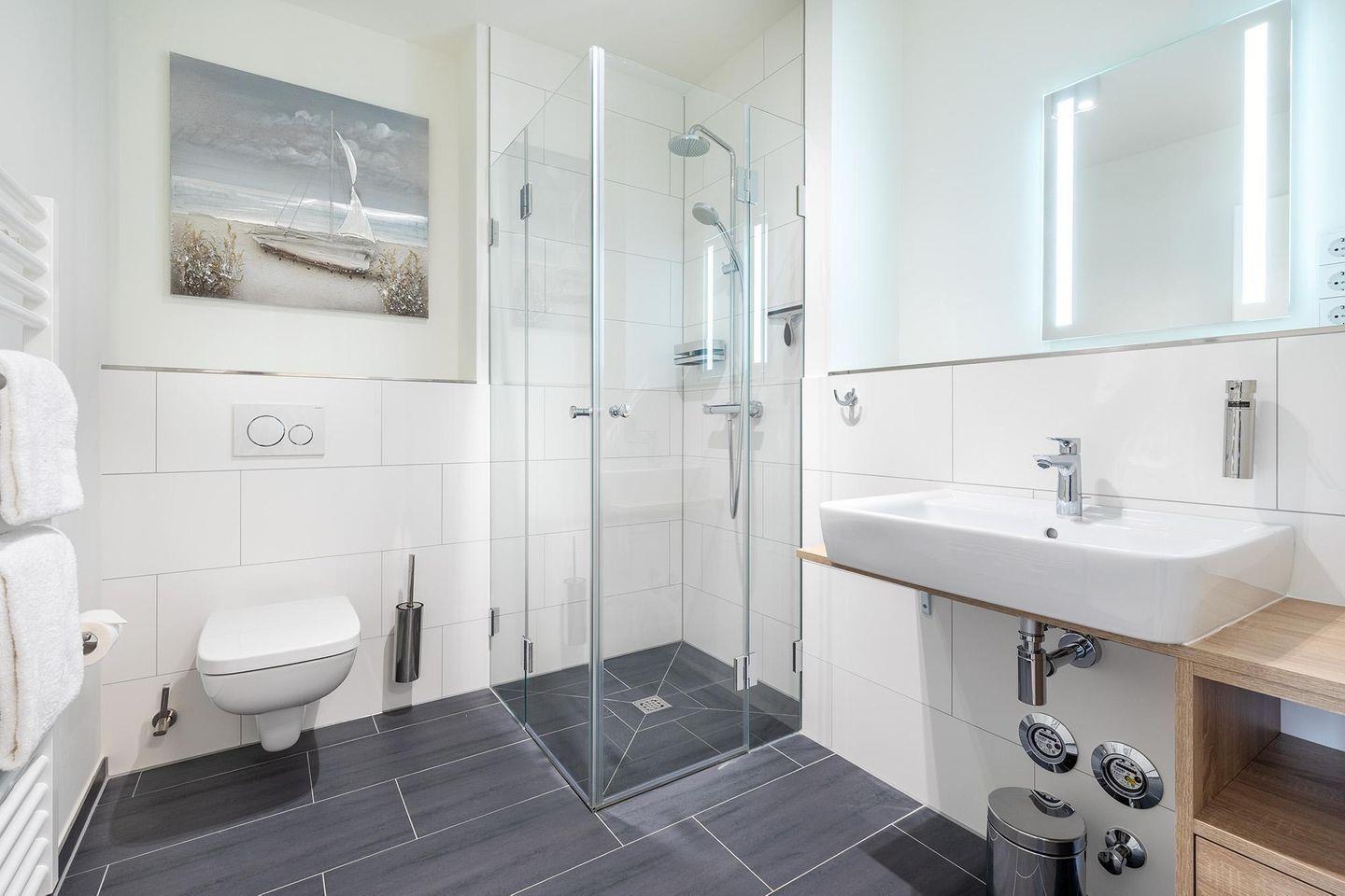 Zur Ausstattung der Ferienanlage gehören außerdem eine Rezeption mit Lobby und Kamin-Lounge, eine Tiefgarage mit inkludiertem Stellplatz (max. Höhe 2 m) sowie gemeinschaftlich nutzbare Waschräume auf jeder Etage. Zwei Aufzüge sorgen für barrierefreien Zugang zu allen Apartments. Fahrräder lassen sich sicher im abschließbaren Kellerraum unterbringen, und vor dem Haus steht eine öffentliche Ladestation für E-Autos zur Verfügung, die gegen Gebühr genutzt werden kann.