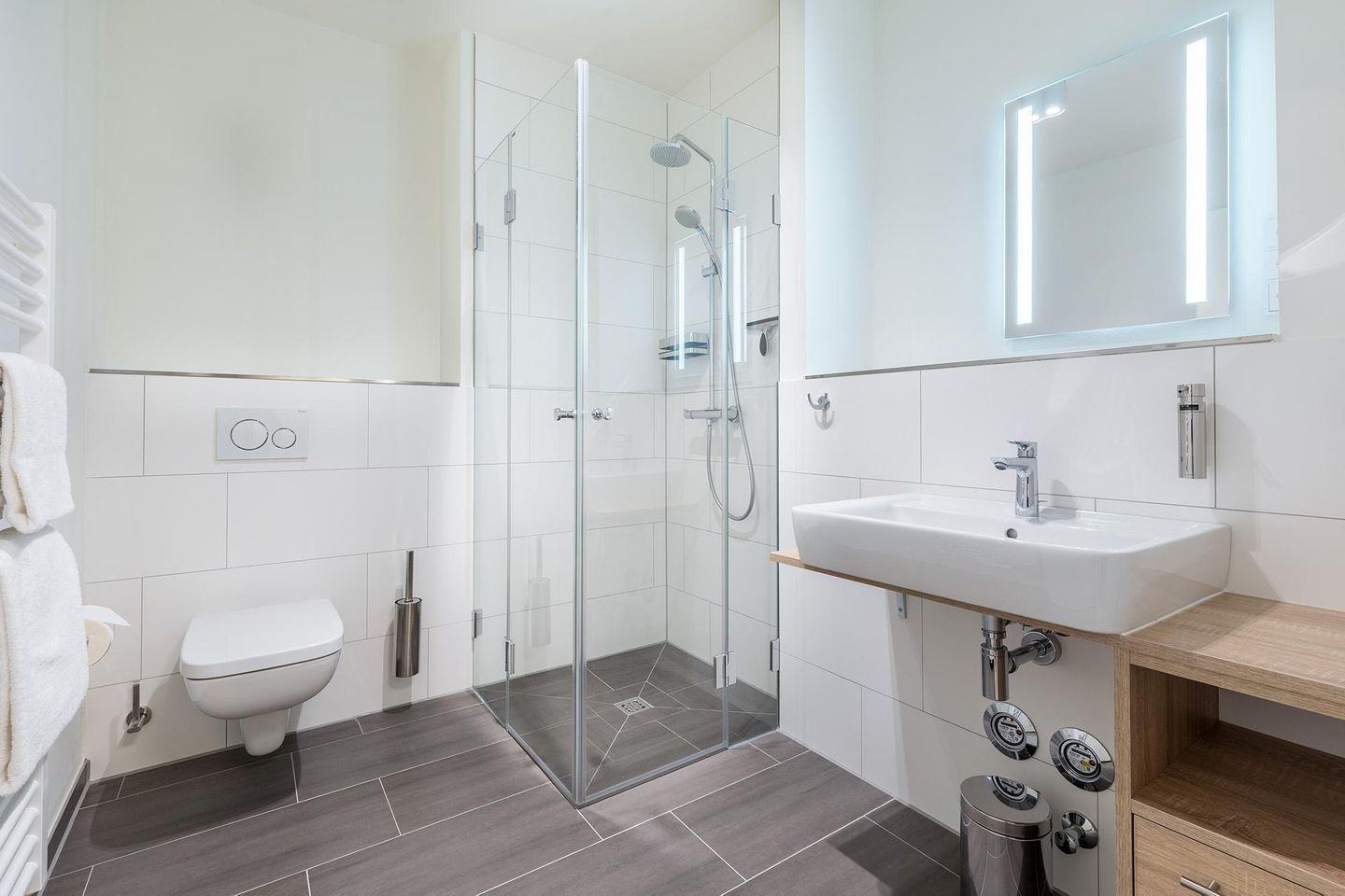 Zur Ausstattung der Ferienanlage gehören außerdem eine Rezeption mit Lobby und Kamin-Lounge, eine Tiefgarage mit inkludiertem Stellplatz (max. Höhe 2 m) sowie gemeinschaftlich nutzbare Waschräume auf jeder Etage. Zwei Aufzüge sorgen für barrierefreien Zugang zu allen Apartments. Fahrräder lassen sich sicher im abschließbaren Kellerraum unterbringen, und vor dem Haus steht eine öffentliche Ladestation für E-Autos zur Verfügung, die gegen Gebühr genutzt werden kann.