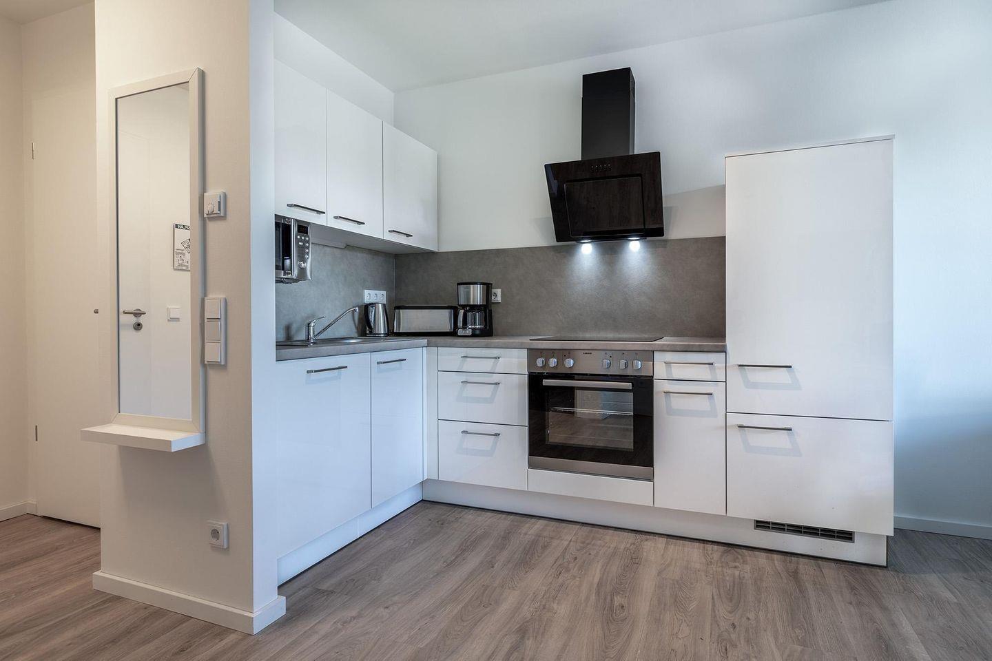 Das Nichtraucher-Apartment besticht durch eine behagliche Fußbodenheizung, sonnenschutzverglaste Fenster und kostenfreies WLAN. Die offen gestaltete, voll ausgestattete Küche lässt keine Wünsche offen: Geschirrspüler, Kühl-Gefrier-Kombination, Kaffeemaschine, Toaster, Wasserkocher, Mikrowelle, Herd mit Glaskeramikkochfeld und Backofen bieten Ihnen alle Annehmlichkeiten, um sich kulinarisch zu verwöhnen.