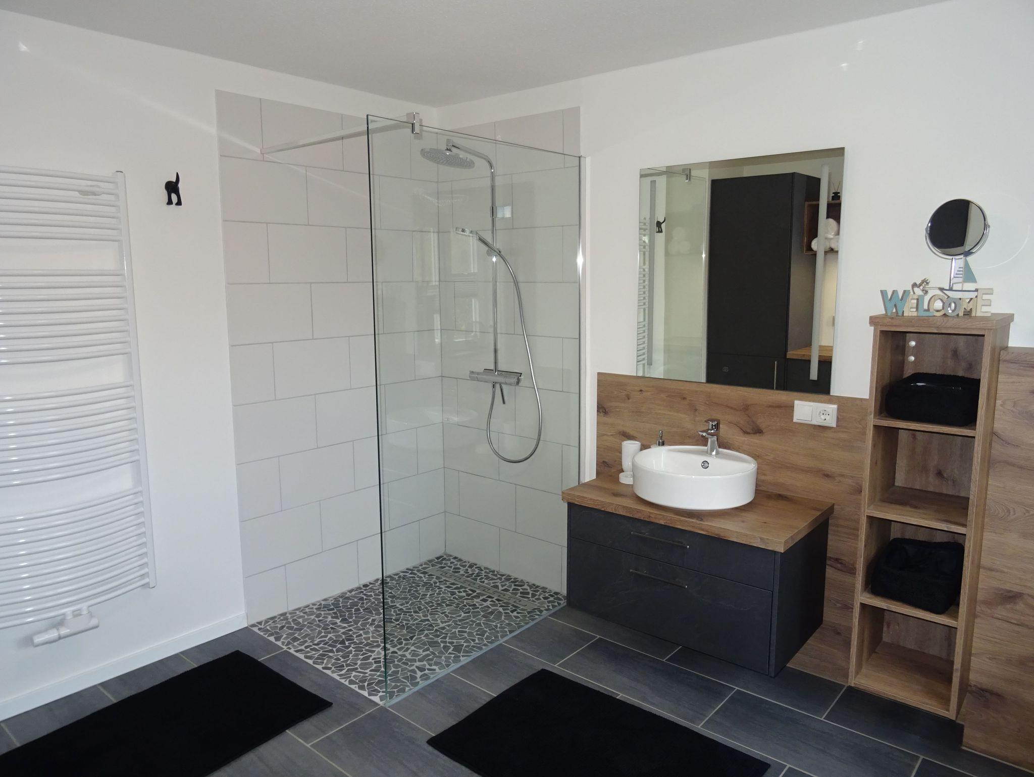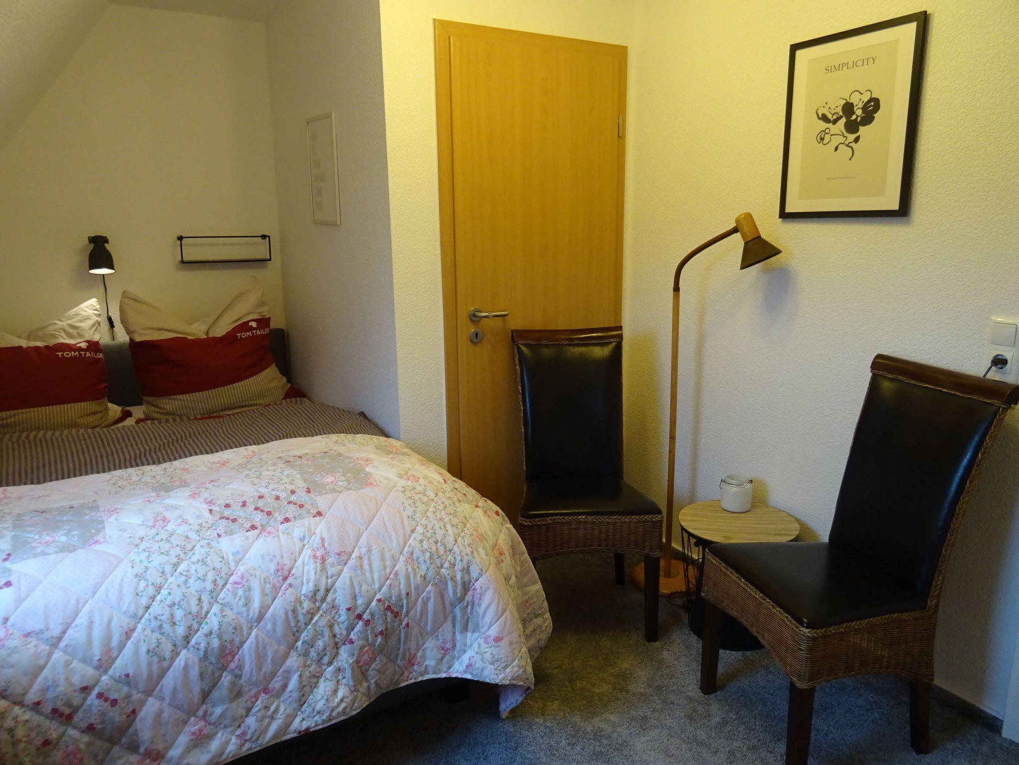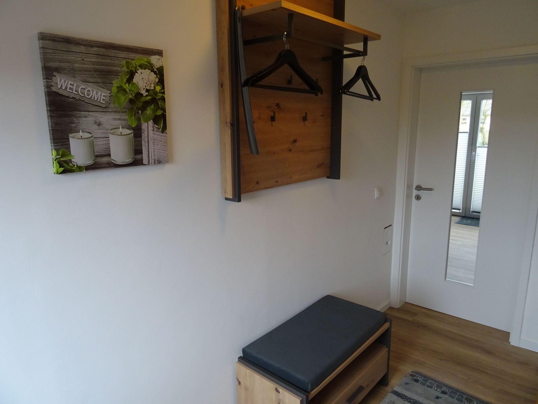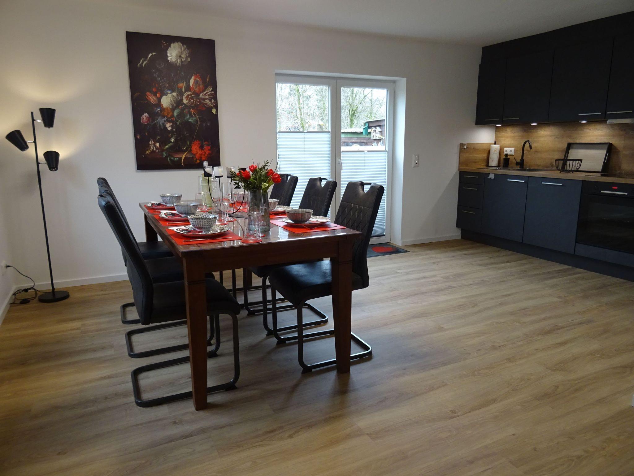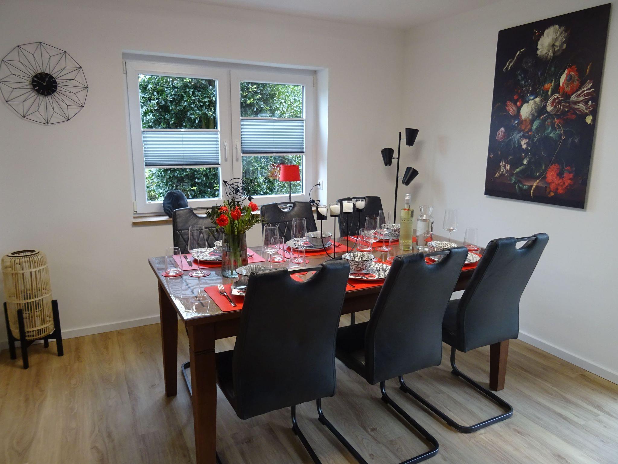 In 2022 vollständig renovierte Ferienwohnung in einer Doppelhaushälfte mit Lage im Grünen, ca. 70 qm, mit moderner und neuwertiger Ausstattung. Im Erdgeschoss befindet sich ein offener Wohn- und Essbereich mit gut ausgestatteter Einbauküche, ein großer Esstisch sowie ein gemütliches Sofa mit Flachbild- TV, Bluetooth-Lautsprecherbox und Spieleregal für die Kleinen. Von diesem Wohnbereich gelangen Sie auf die überdachte Terrasse und in den Garten. Des Weiteren befindet sich im Erdgeschoss ein Badezimmer. Es besticht durch eine ebenerdige Dusche mit Regenwaldduschkopf, einem Waschtrockner und das schöne Mobiliar. Eine Ausstattung für Kleinkinder (Wickelmöglichkeit, Töpfchen, Hocker und ein Toilettensitz) ist vorhanden.