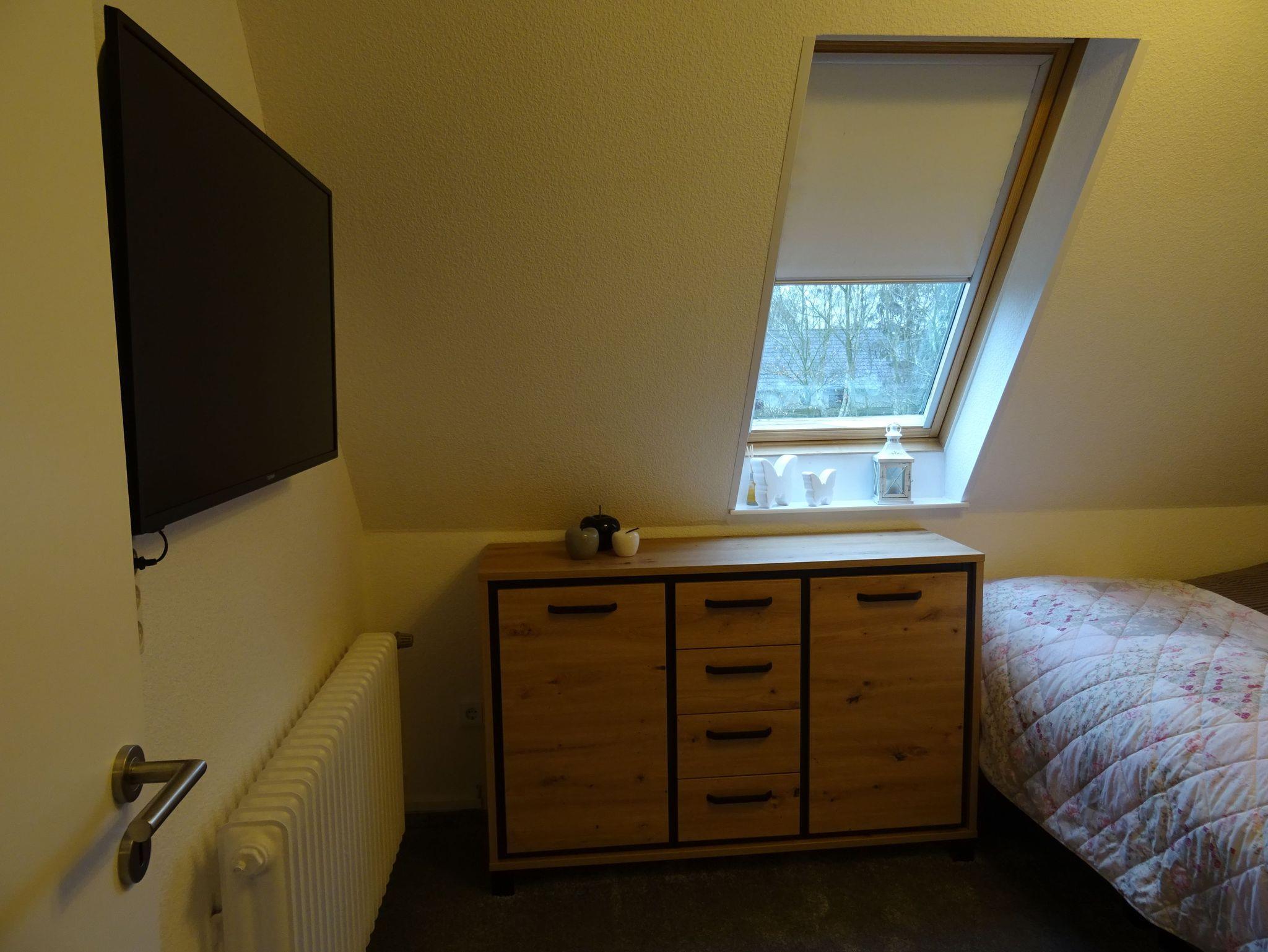 Boxspring-Bett (1,60 x 2,00m) mit Topper unter einer Schräge in einer Nische, Flachbild - TV und Kommode