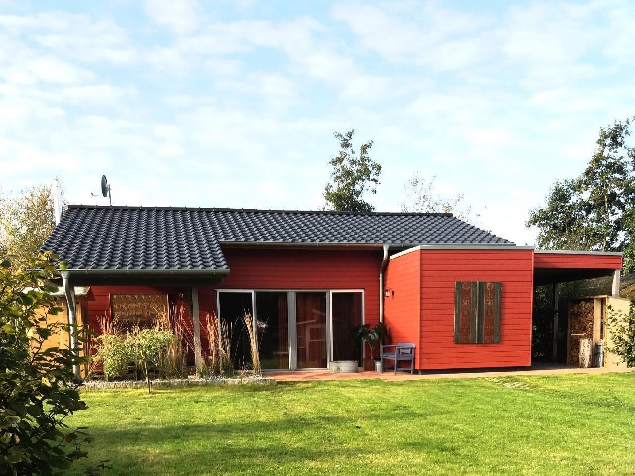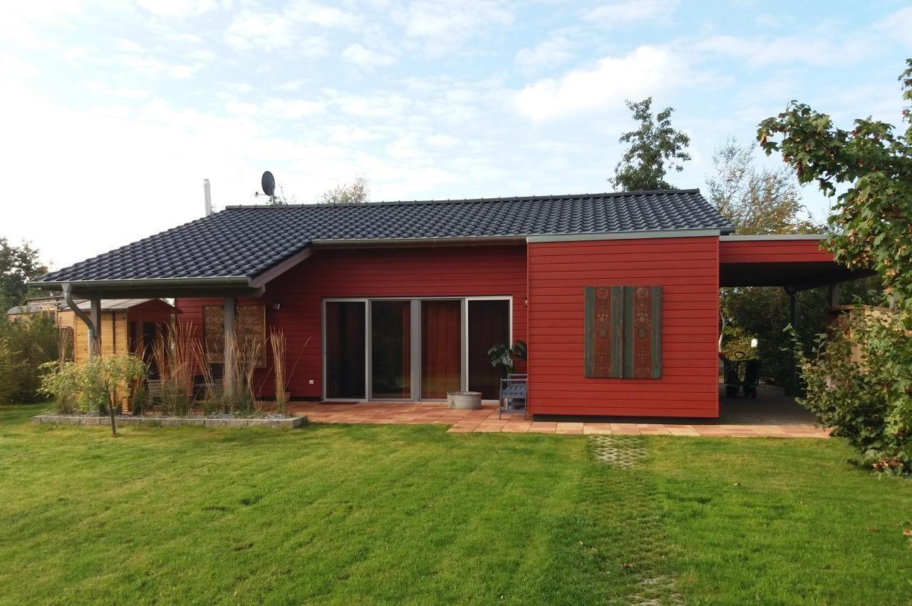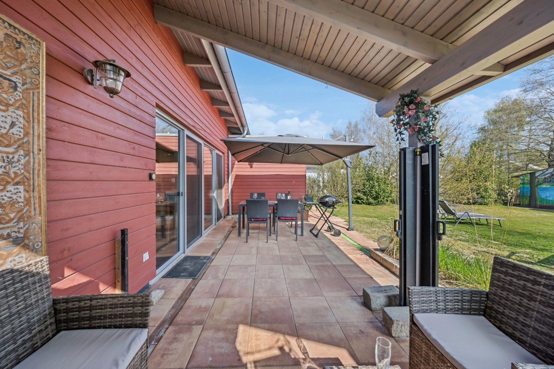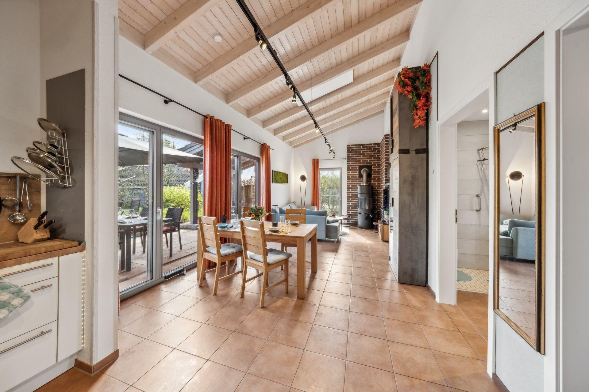 Inside, the 72 m² carmine red wooden house impresses with its open and cosy design with plenty of space - the high, cathedral-like ceilings guarantee coolness in summer. The infrared radiators discreetly suspended from the ceilings provide sufficient warmth in winter. The living room is equipped with an elegant Danish wood-burning stove. The living room and chic fitted kitchen form a single unit. Two comfortable bedrooms offer space for rest and retreat, while the spacious bathroom with bathtub and large, glazed shower cubicle invites you to relax. Barrier-free, with wide doors, every room is easily accessible, making our accommodation ideal for people with assistance needs.