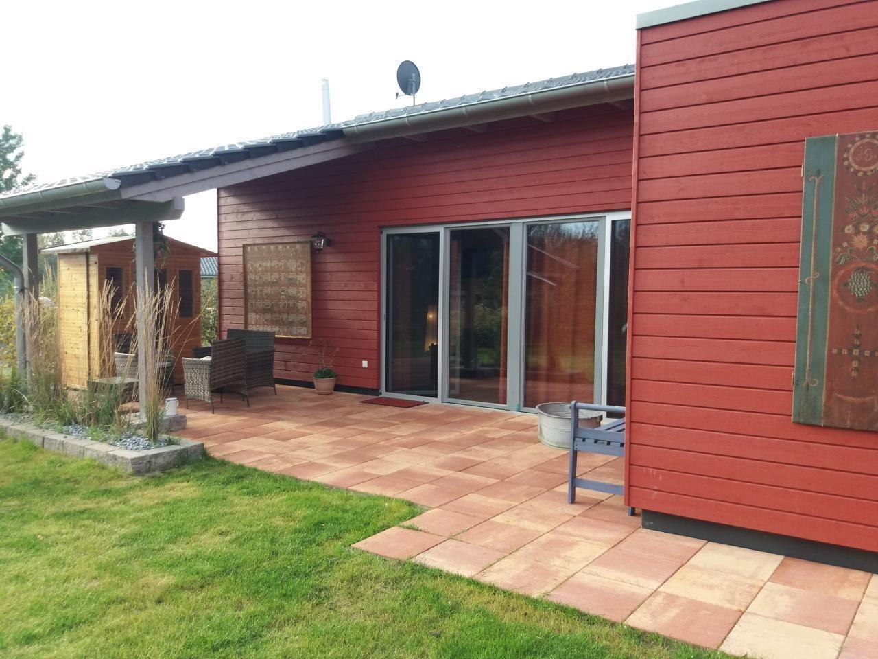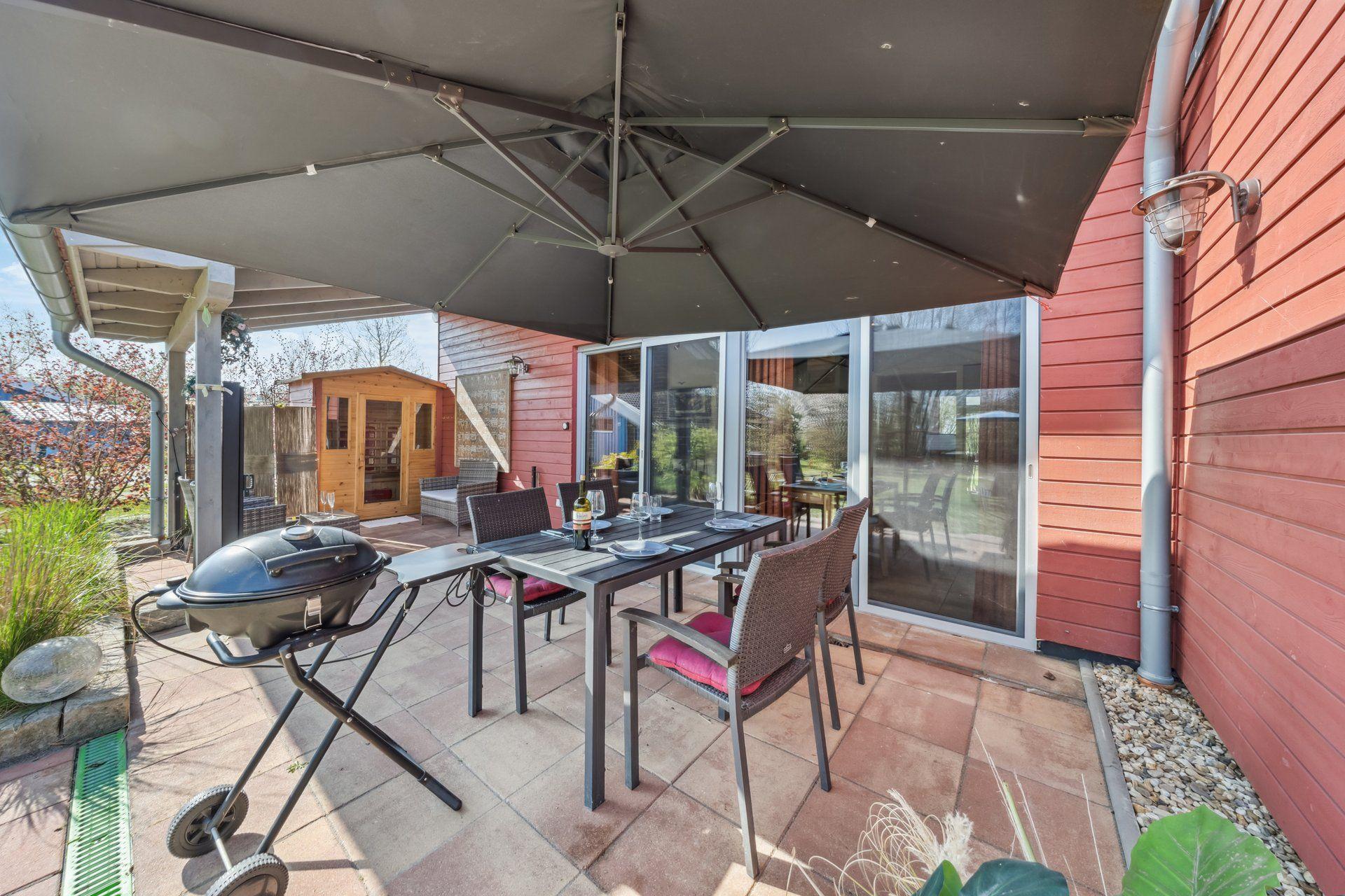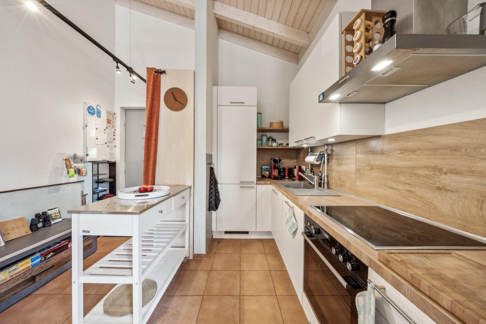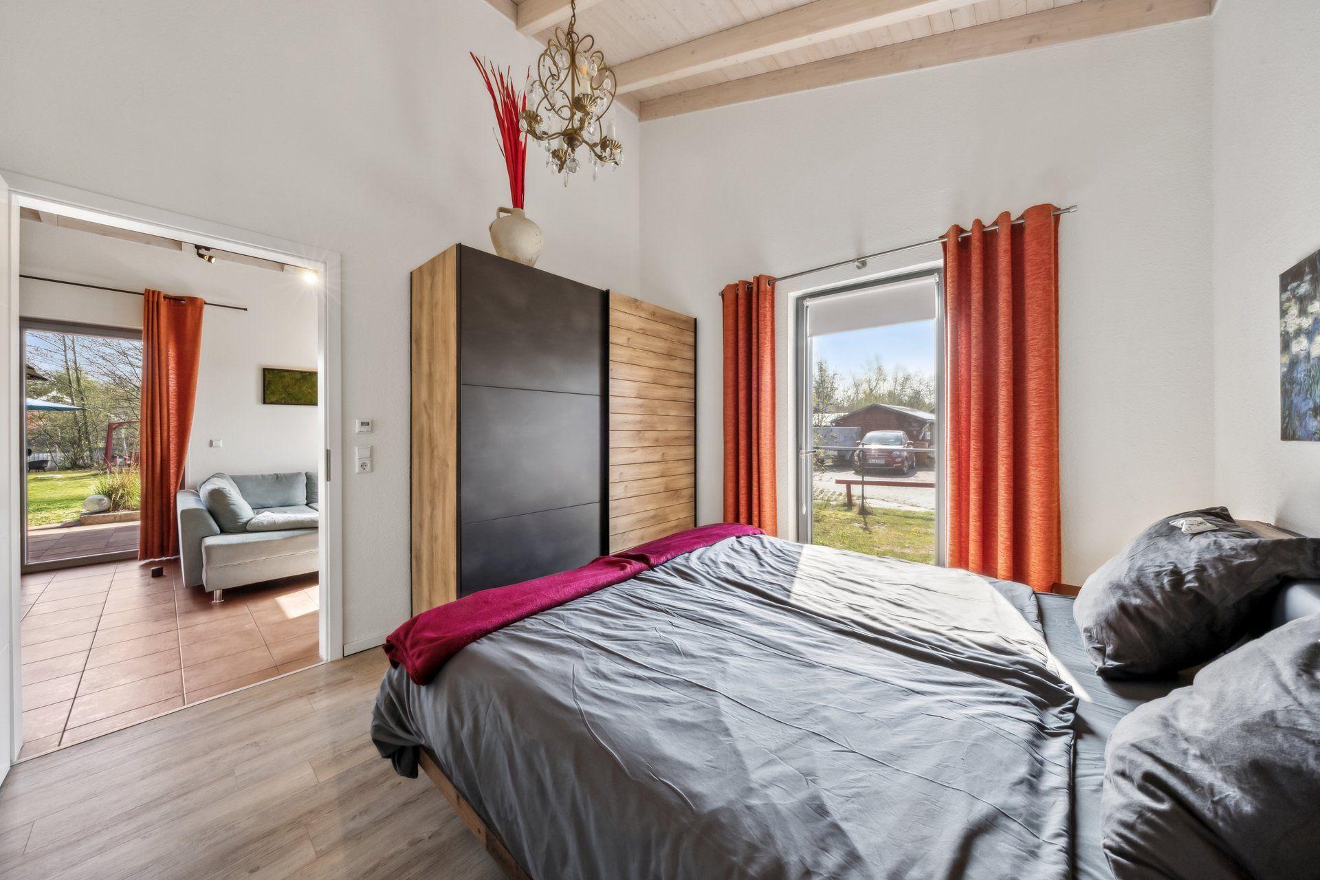 Inside, the 72 m² carmine red wooden house impresses with its open and cosy design with plenty of space - the high, cathedral-like ceilings guarantee coolness in summer. The infrared radiators discreetly suspended from the ceilings provide sufficient warmth in winter. The living room is equipped with an elegant Danish wood-burning stove. The living room and chic fitted kitchen form a single unit. Two comfortable bedrooms offer space for rest and retreat, while the spacious bathroom with bathtub and large, glazed shower cubicle invites you to relax. Barrier-free, with wide doors, every room is easily accessible, making our accommodation ideal for people with assistance needs.