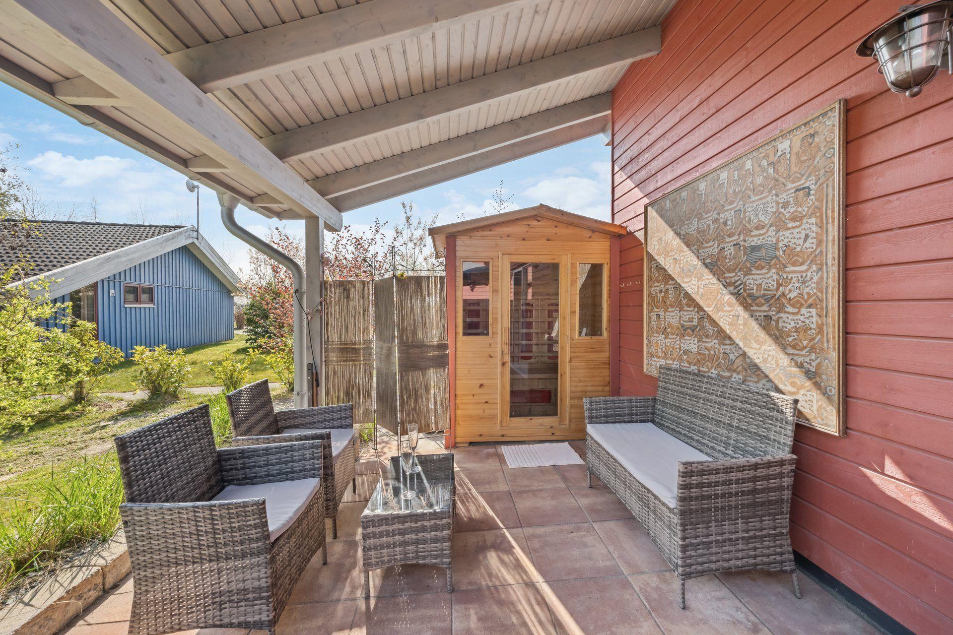 The outdoor area of the PINTO ROSSO leaves nothing to be desired. A spacious carport not only protects your vehicle, but also provides dry access to the house. There is an infrared sauna under the covered half of the terrace. In the garden with its large green area, there is a swinging bench right by the lake, while a small red rowing boat on its own jetty invites you to have fun on the water. Additional comfort is provided by the only electric car charging station in the holiday home park and a garden shed that can be used by guests.