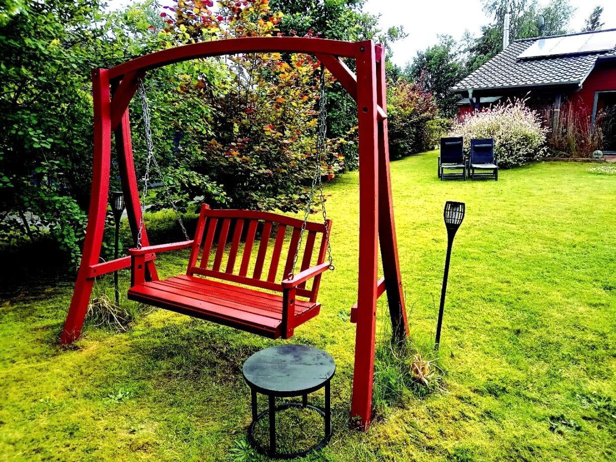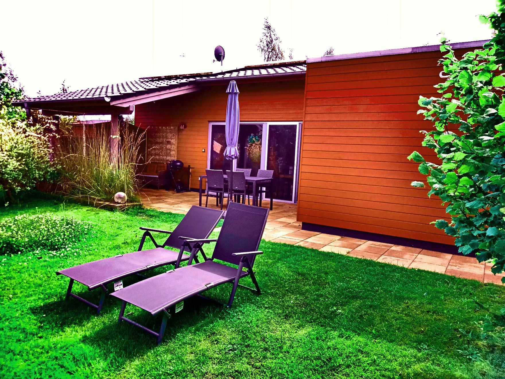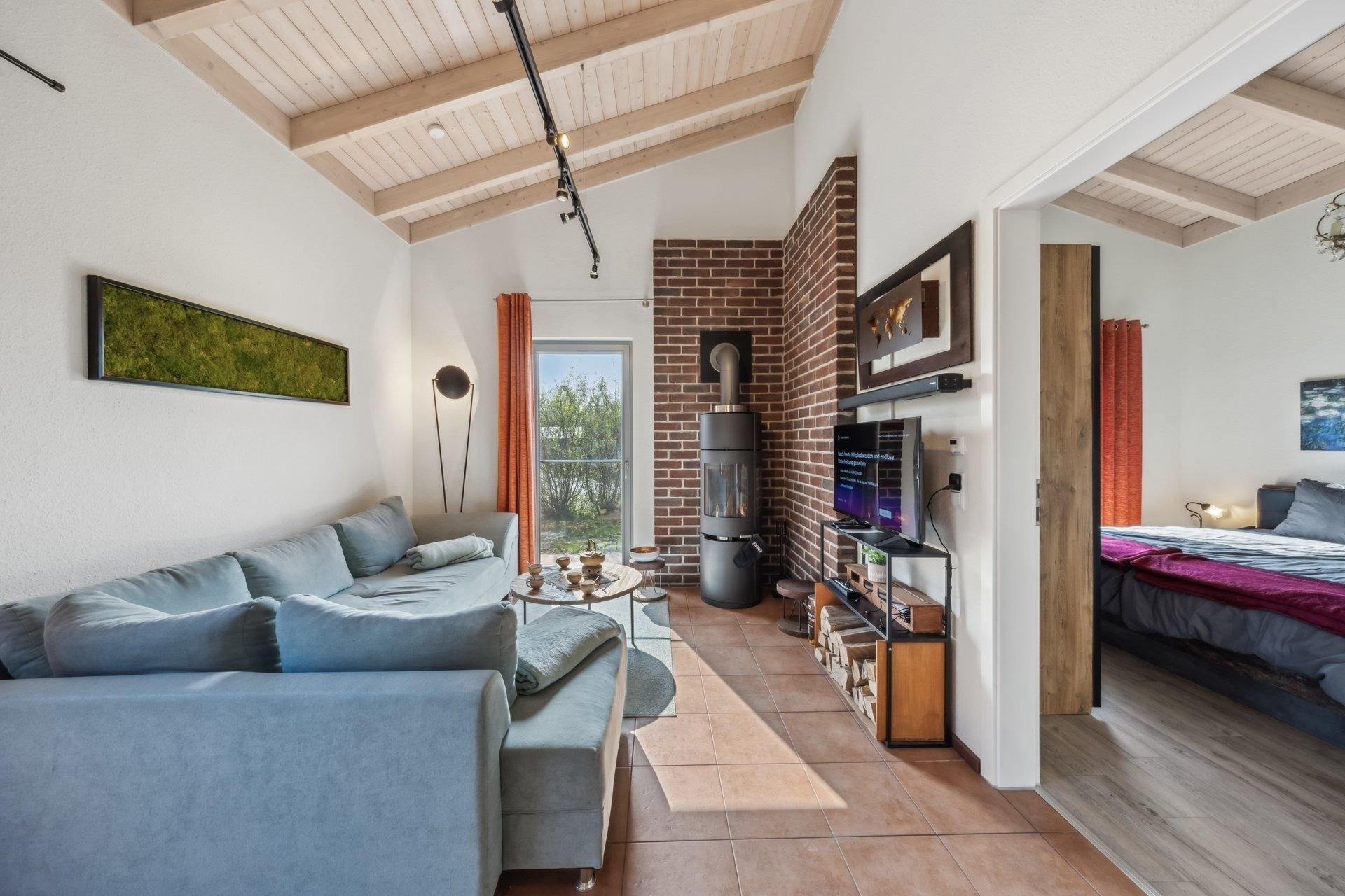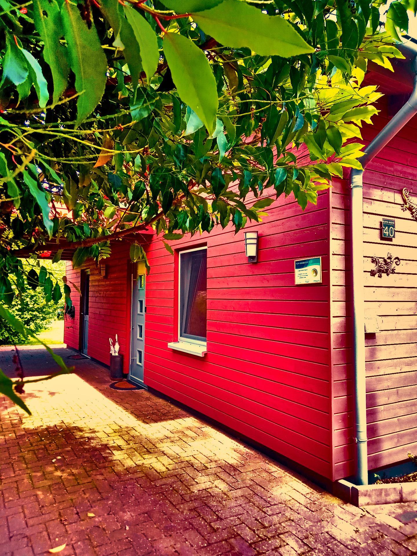 DAS ROTE HOLZHAUS (72 m2 Wohnfläche) ist luftig hoch gebaut, großzügig und zugleich praktikabel und elegant. Es gibt zwei Schlafzimmer (eins mit Doppelbett, einst mit zwei Einzelbetten), ein großzügiges Badezimmer (mit Badewanne inkl. Whirlpoolfunktion) und einen großen Wohnraum mit offener Küche und Kamin.