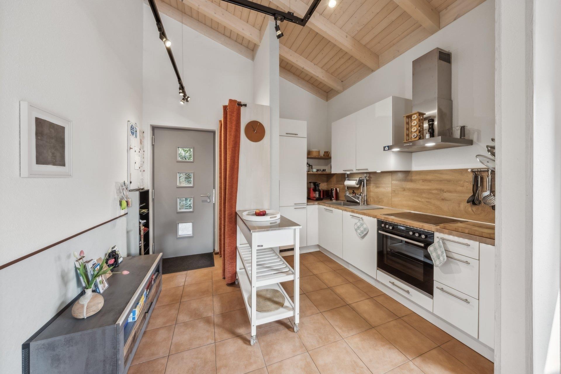 Wenn Sie das Haus betreten, stehen Sie gleich neben dem großen Garderobenschrank. Da können Sie Jacken, Mäntel, Mützen, Hüte und Schuhe unterbringen. Sie überschauen gleich den ganzen Wohnbereich. Zwei Schritte und Sie stehen Sie auch schon vor dem offenen Küchenbereich. Also kurze Wege mit den Einkäufen.