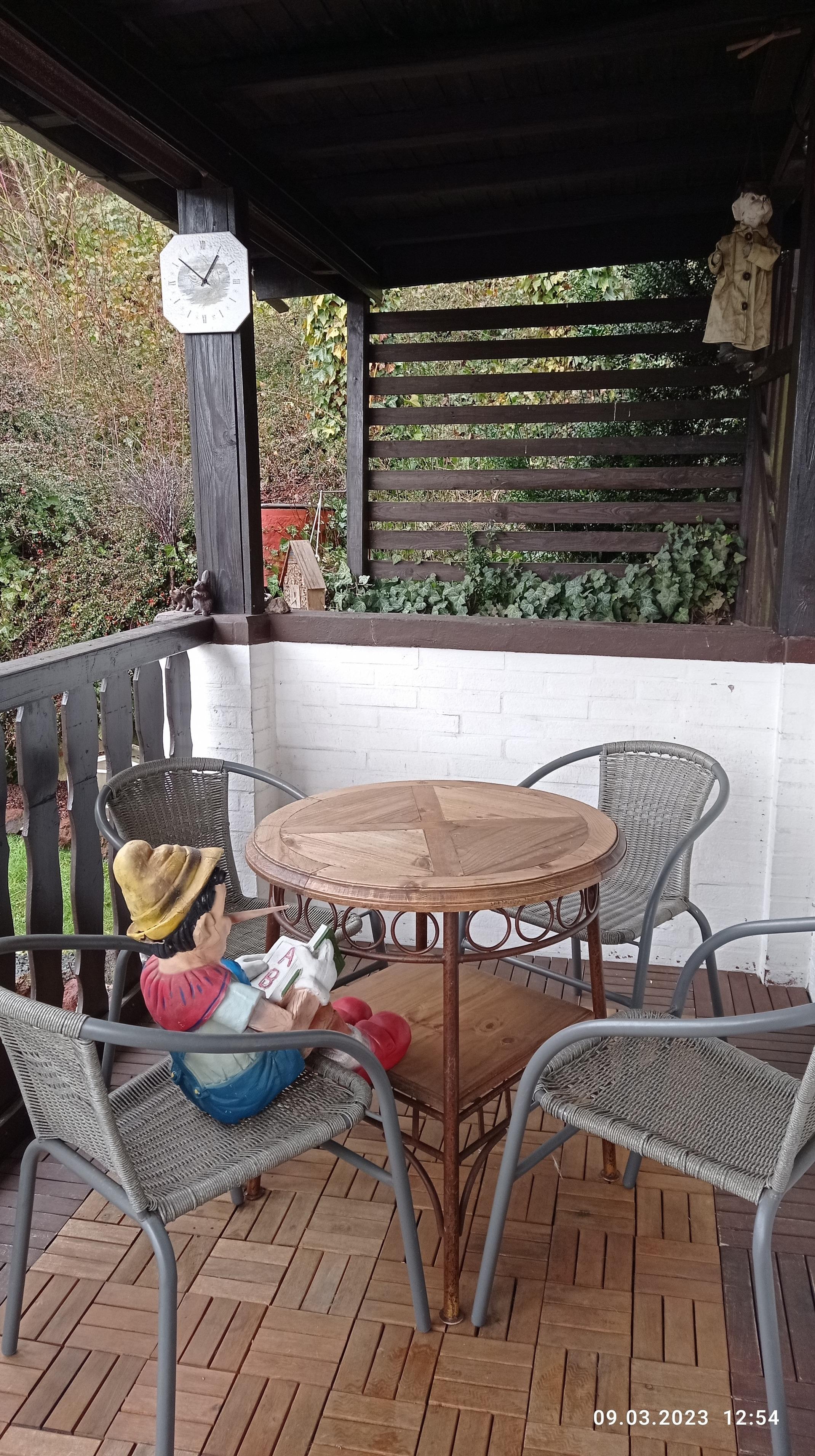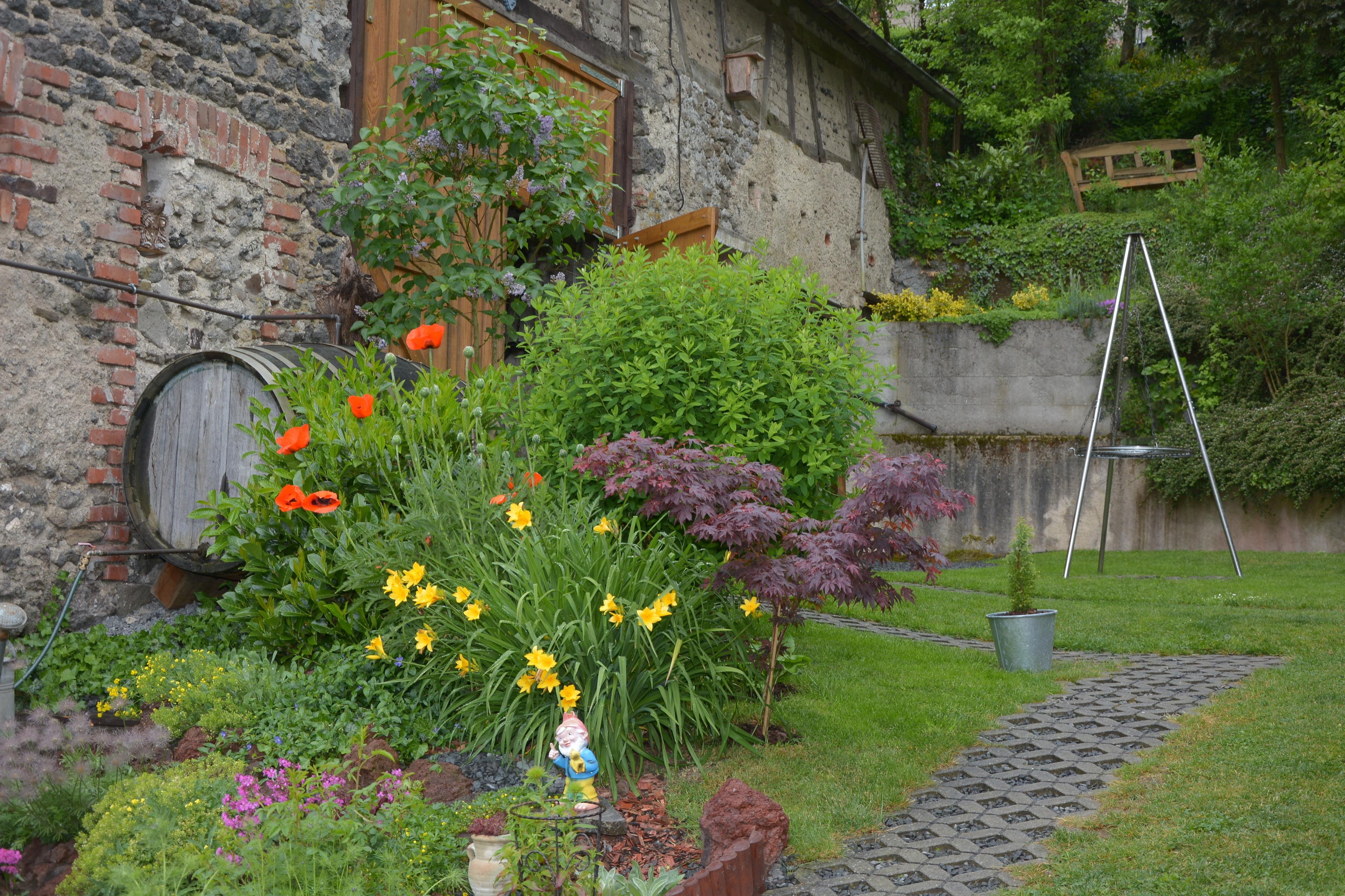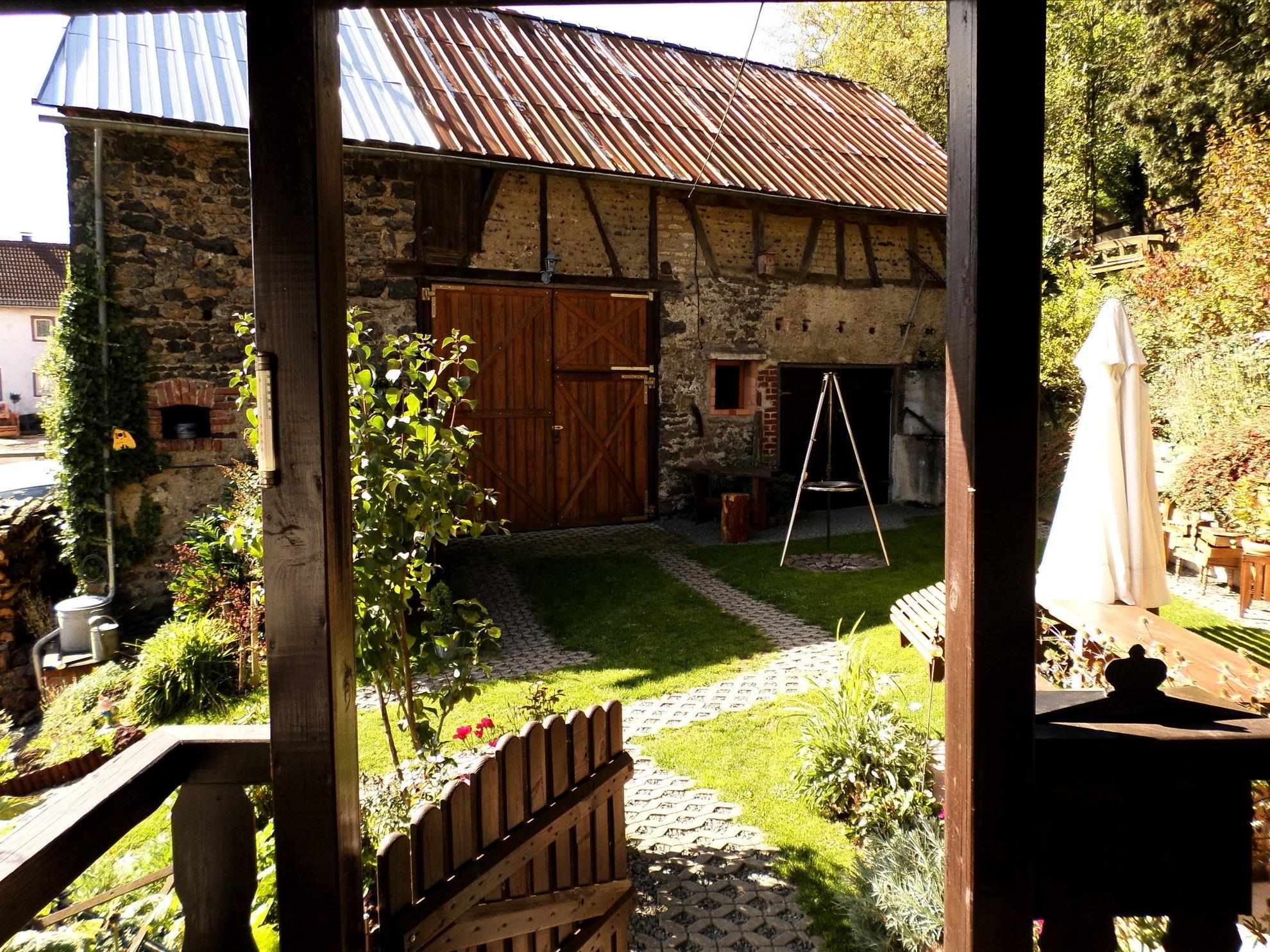 Vor dem Haus befindet sich eine überdachte Terrasse mit Sitzecke sowie ein großes Grundstück mit Grillplatz und Scheune. (Unterstellmöglichkeit für Motorräder und Fahrräder). Das Gelände ist nicht eingezäunt.