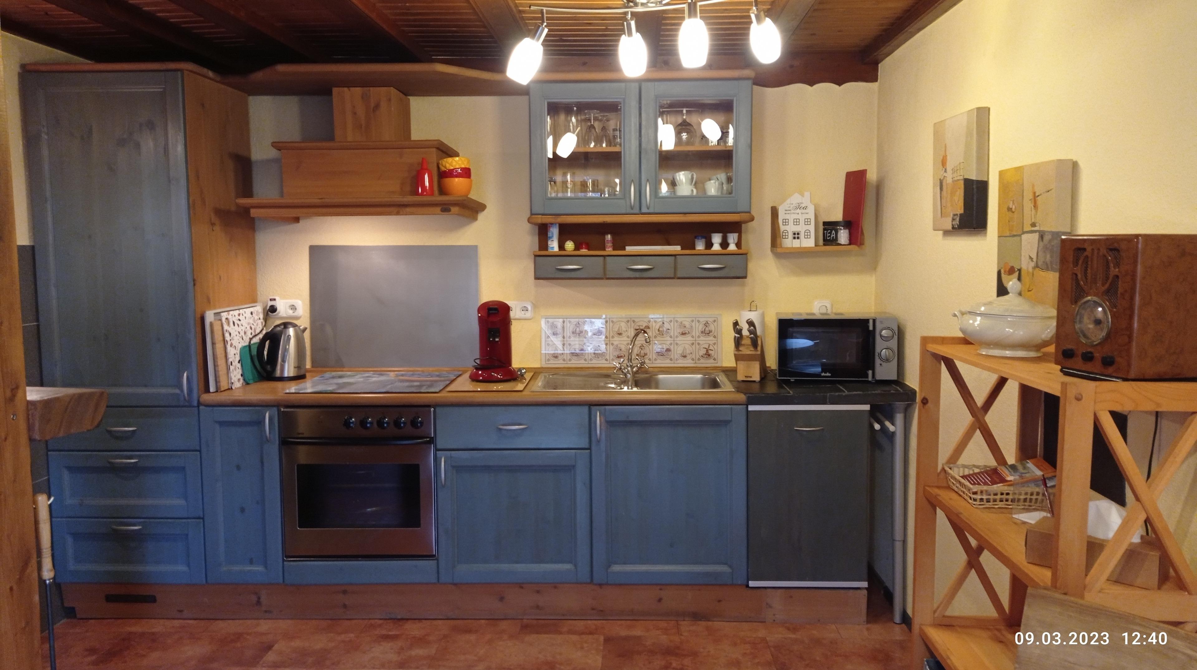 Verteilt auf 48qm, befindet sich in der unteren Etage ein Tageslichtbad mit Dusche/WC und Waschbecken, ein Abstellraum mit Waschmaschine. Eine gemütliche Landhausküche mit E.-Herd (Ceranfeld und Backofen), Kühlschrank mit 3 Sterne Gefrierfach, eine Spülmaschine und eine Mikrowelle. Holzofen und Essecke.