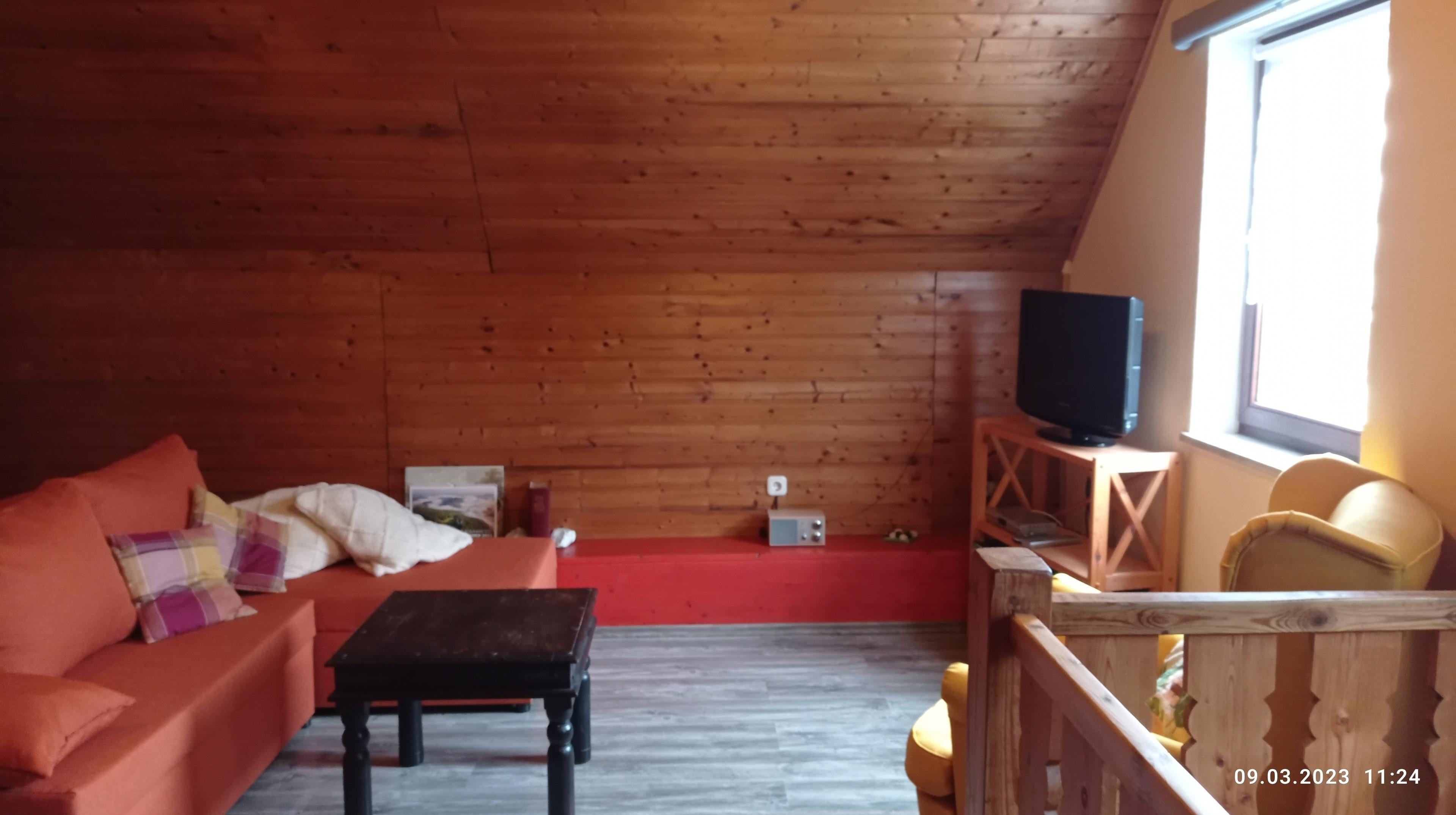 Über eine Raumspartreppe (sehr steile Holztreppe mit halben Stufen) geht es ins Obergeschoß mit Wohn-/Schlafraum, Doppelbett und Kleiderschrank. Couchecke mit Fernseher. Zusätzliche Elektroheizungen in Bad, Küche und Wohnraum.
