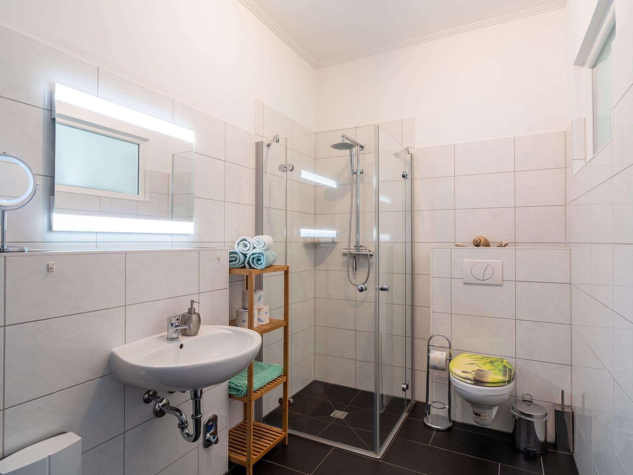 Im Badezimmer mit Handtuchtrockner, Fön etc. ist die bodenebene Dusche der Blickfang.
